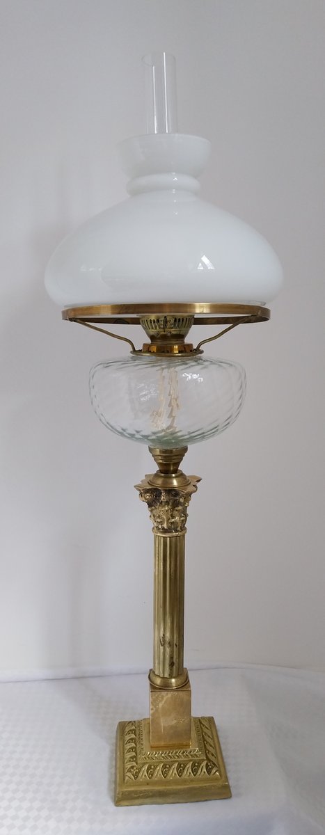 The glass container between the shade and the lamp, as well as the columnar part and base of the lamp, are made of brass, which gives it an elegant and timeless look.