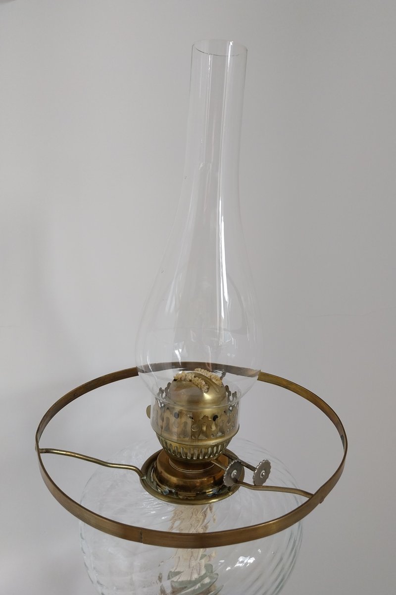On top is a matte white glass shade, and underneath is a transparent, patterned glass container for the lamp oil.