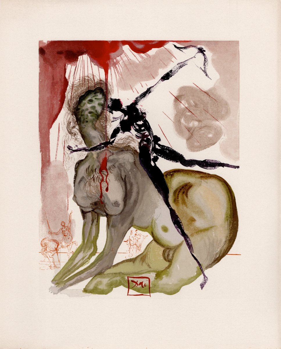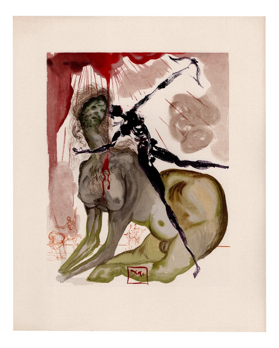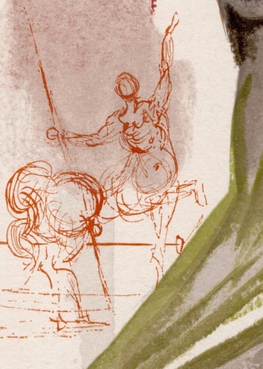 According to critics, Dalí illustrates Dante's journey through Hell, Purgatory, and Paradise by reinterpreting Dante's journey from a psychoanalytic perspective, placing a particularly significant character or event from the canto at the center of each panel. The representation is dreamlike and irreverent: Hell, Purgatory, and Paradise emerge suspended between dream and reality, in a single masterpiece, in which the elegance of the line is combined with a masterful use of color. The figuration is ironic, grotesque, and imaginative in the depictions of Hell and Purgatory, while the representations of Beatrice are delicate and celestial, as if the artist were on an imaginary journey within himself. The journey into Dante's afterlife is thus interpreted in a metaphysical and psychological key, masterfully blending the deepest meaning of the Divine Comedy with the artistic flair of Salvador Dalí, who maintains Dante's dreamy atmosphere while adding his unmistakable surrealist touch with the famous flaccid figures, crutches, rhinoceros horns, and flying bones.