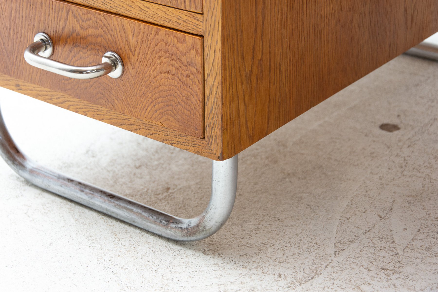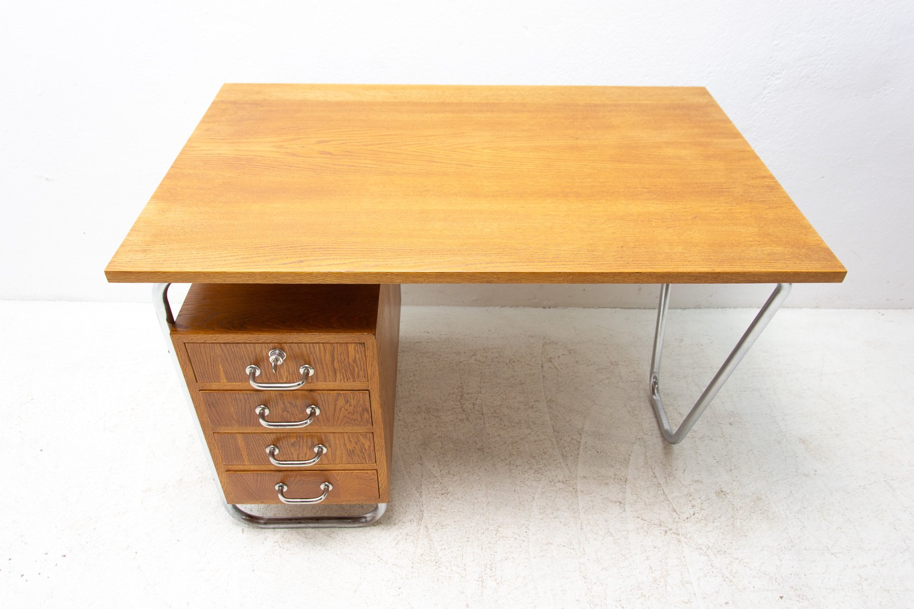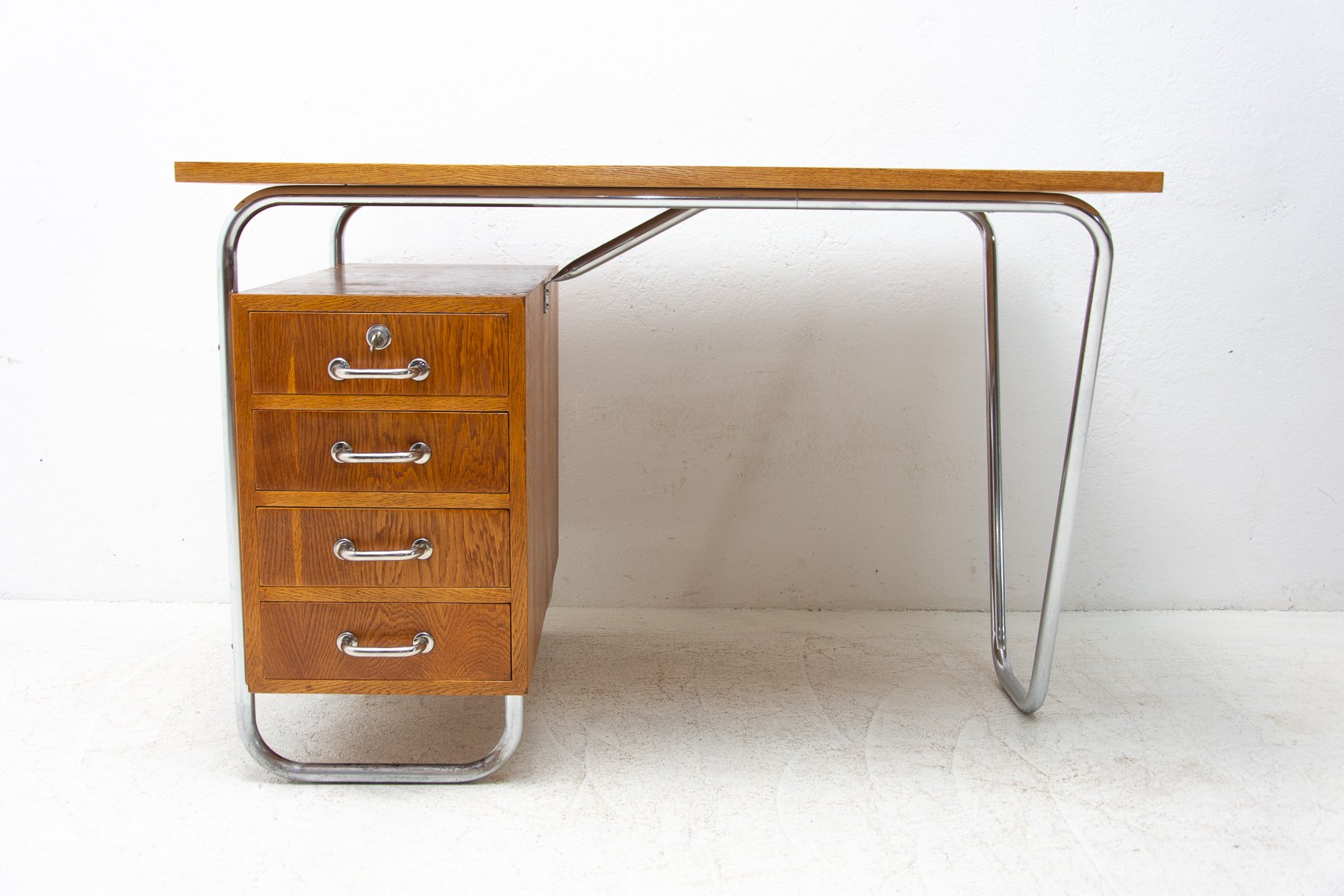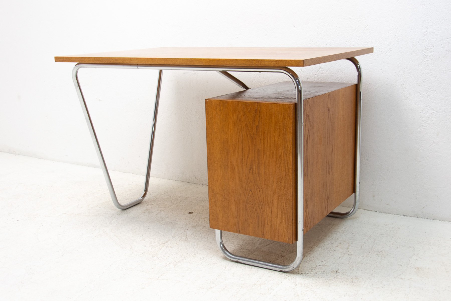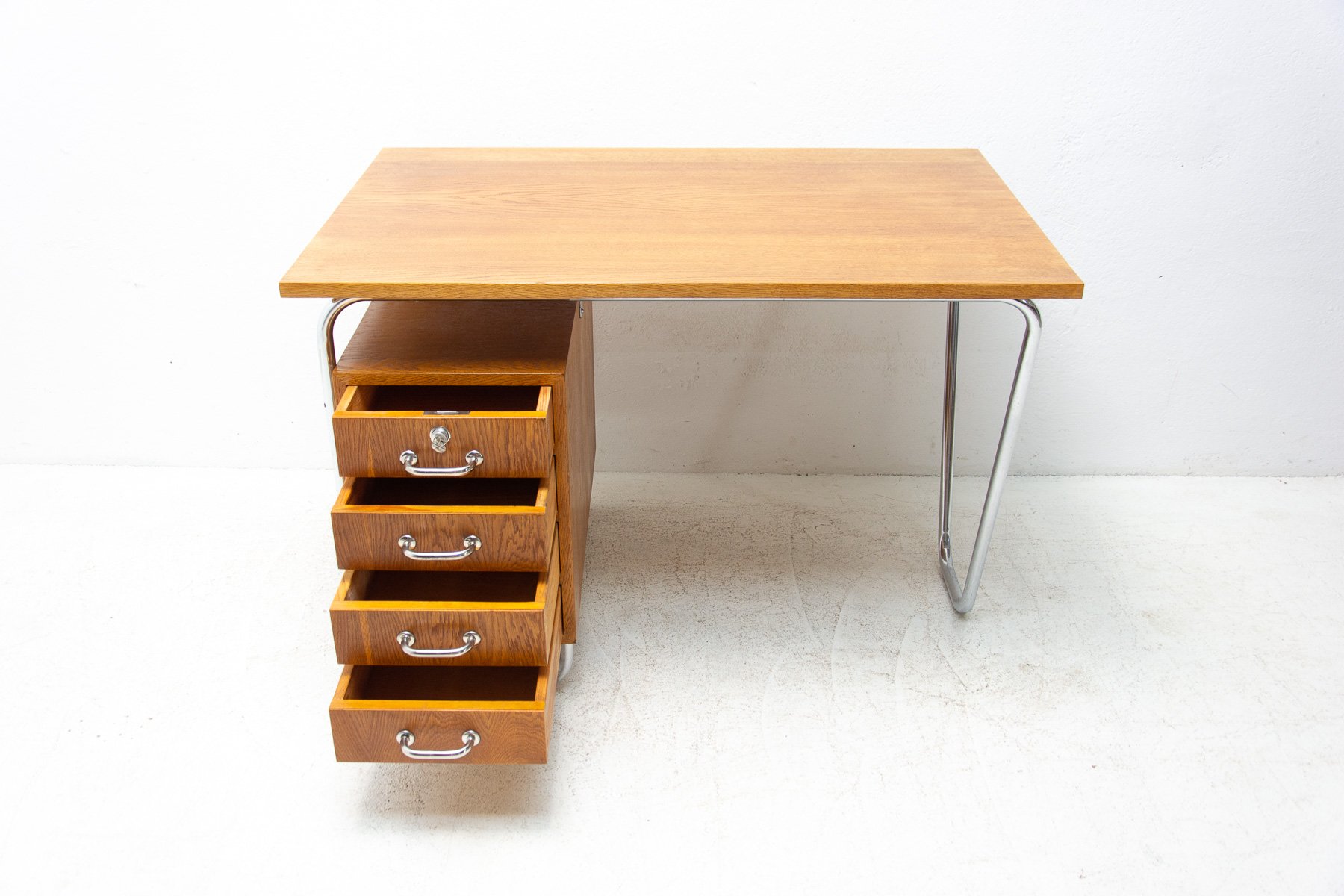 Dieser röhrenförmige Schreibtisch wurde in den 1940er Jahren von Rudolf Vichr entworfen und in den 1950er Jahren von Kovona hergestellt. Das Design spiegelt die Prinzipien des Mid-Century Modern wider und kombiniert eine funktionale Anordnung mit einer für diese Zeit charakteristischen leichten Stahlrohrkonstruktion. Der Schreibtisch besteht aus verchromtem Stahlrohr mit Sperrholzplatten mit Lamellenfurnier, und der Schubladenkorpus ist aus massiver Fichte gefertigt. Das Möbelstück wurde professionell restauriert: Das Originalholz wurde gereinigt und mit hochglänzendem Polyurethan behandelt, die originalen Chromelemente wurden poliert. Der Schreibtisch befindet sich nach der Restaurierung in einem ausgezeichneten Zustand, wobei die ursprünglichen Materialien und Proportionen erhalten geblieben sind und er ein klares und raffiniertes Erscheinungsbild aufweist. Er eignet sich sowohl für den täglichen Gebrauch als auch für die Einbindung in eine kuratierte Vintage- oder designorientierte Einrichtung. Spezifikationen Designer: Rudolf Vichr