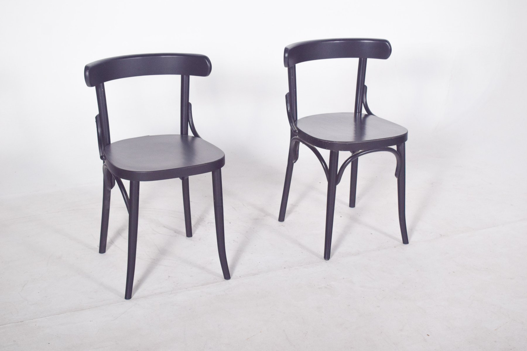 Schwarz lackiertes Stuhlpaar mit niedriger, gebogener Rückenlehne, die sich seitlich in einer durchgehenden, glatten Linie erstreckt, die für das funktionalistische Design des 20. Jahrhunderts. Die Struktur weist einfache, diskret geschwungene Formen auf, mit Verstärkungen unter der Sitzfläche und zwischen den hinteren Beinen, die auf eine Inspiration durch Stühle im Thonet-Stil hindeuten, insbesondere in ihrer industriellen und minimalistischen Variante. Die leicht geschwungene Sitzfläche sorgt für Komfort, während der Verzicht auf eine Polsterung den praktischen und utilitaristischen Charakter der Stücke unterstreicht.