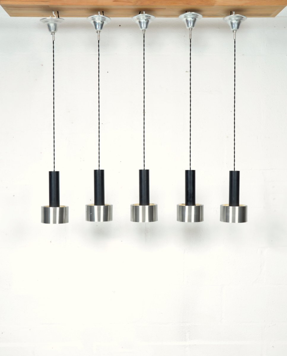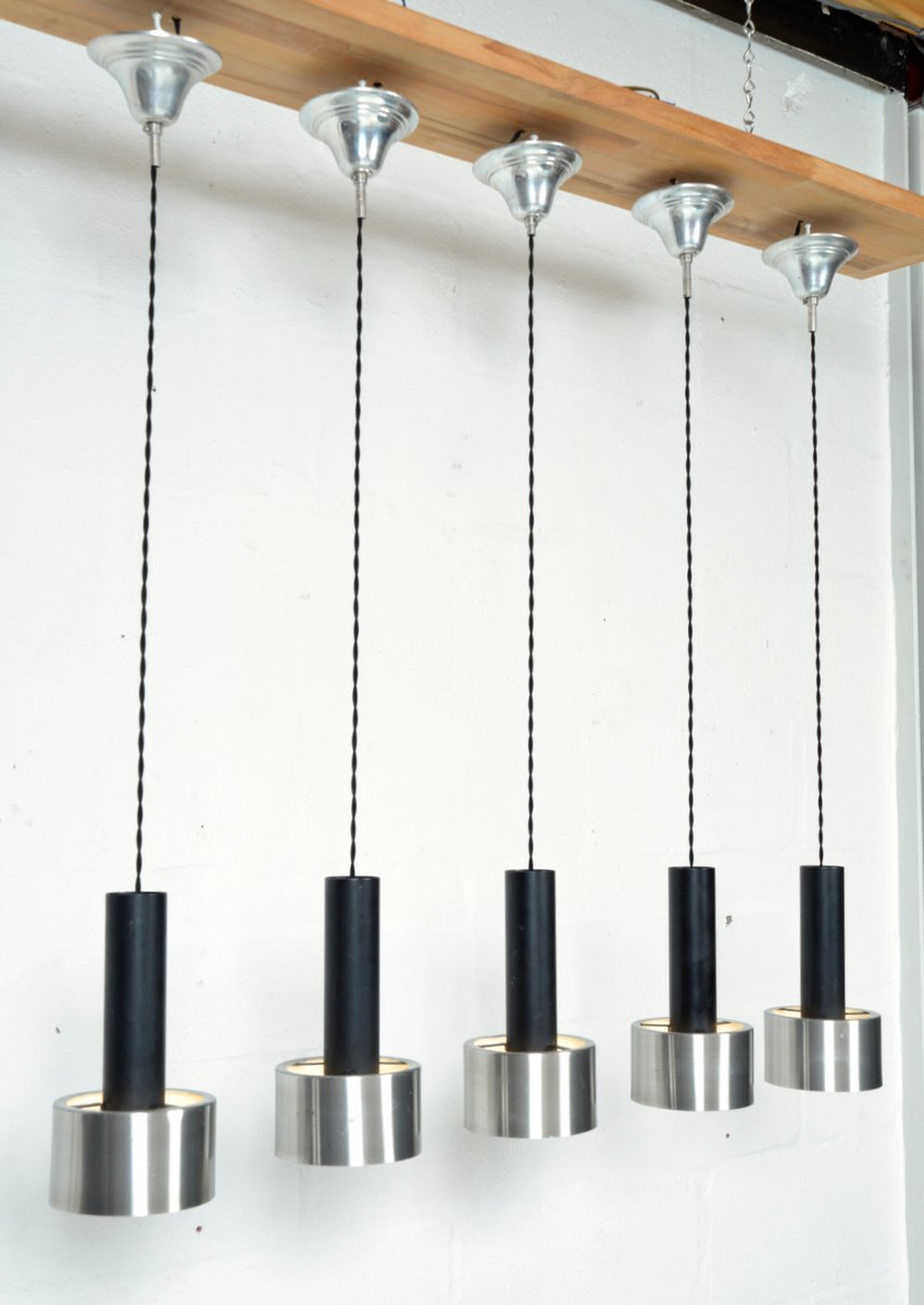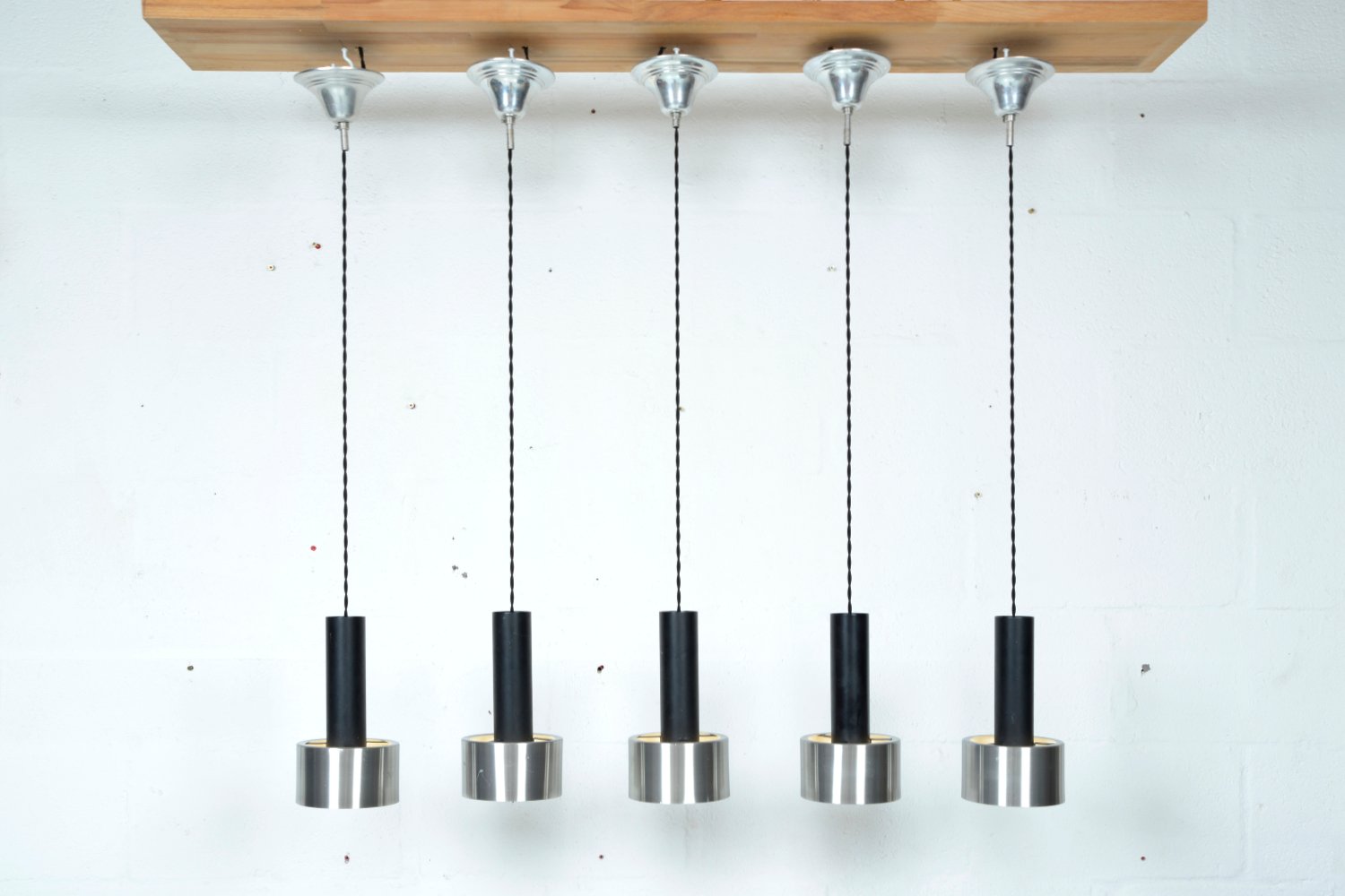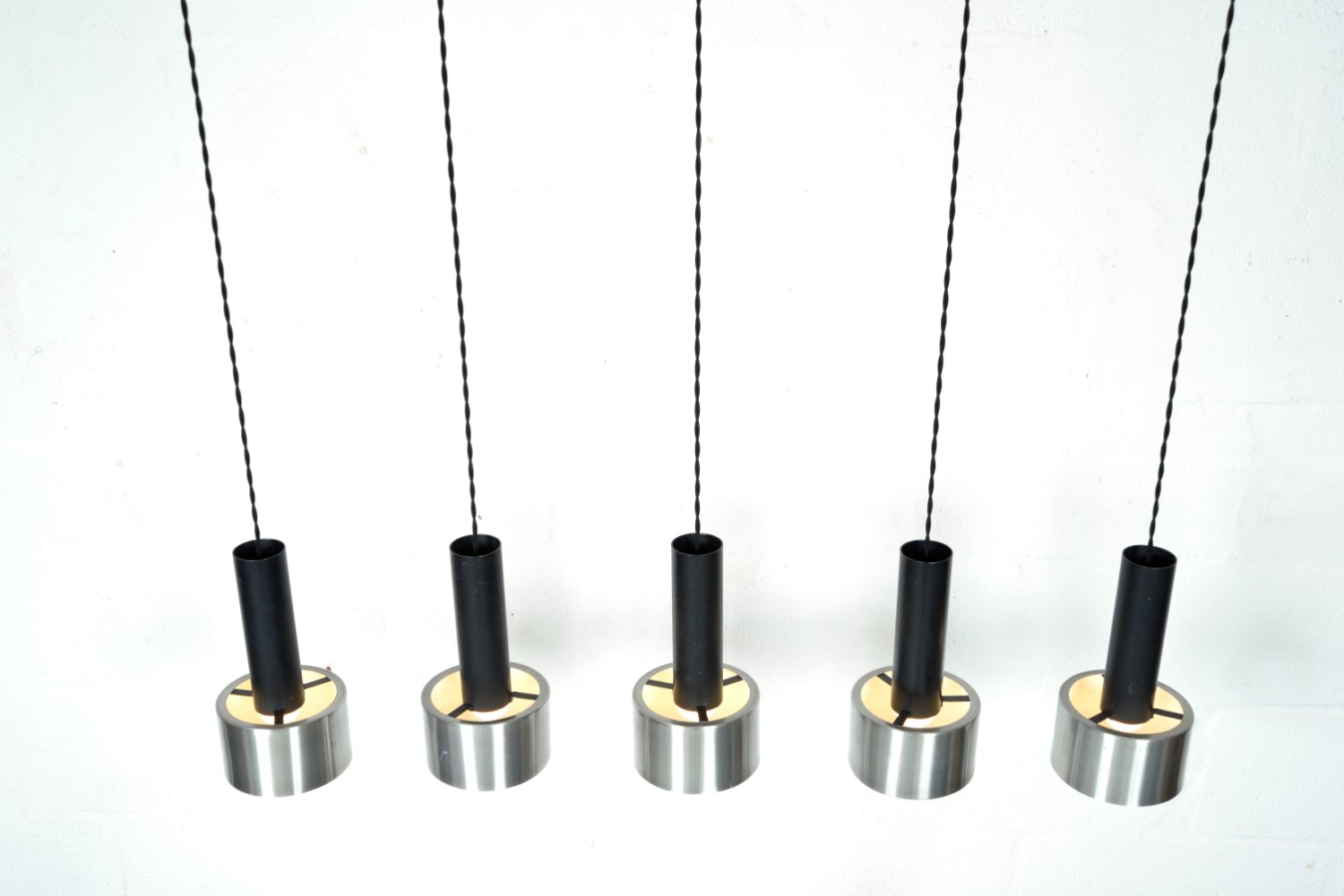 Eine fantastische Serie von fünf Pendelleuchten aus den 1960er Jahren, entworfen von Nico Kooy für Raak, Amsterdam, Niederlande. Hergestellt aus schwarzen konischen Metallrohren in Mattschwarz mit gebürsteten Aluminiumschirmen. Jede Leuchte wurde professionell mit schwarzem, 2-adrigem, geflochtenem Kabel neu verkabelt und mit verchromten Deckenrosetten an der Decke befestigt. Das Licht ist nach unten gerichtet, während von der Oberseite des Schirms, der im Original weiß lackiert ist, ein warmes Licht ausgeht. Die Pendelleuchten sind in einem guten Originalzustand, mit einigen altersbedingten Spuren, die ich durch Fotografieren jeder einzelnen Leuchte gezeigt habe. Das Holzbrett dient der Aufhängung der Leuchten und ist nicht Teil der Leuchte, da die Leuchten nach Belieben auseinander gestellt werden können.