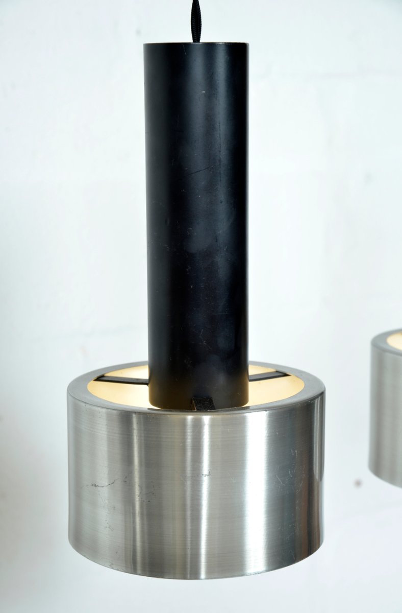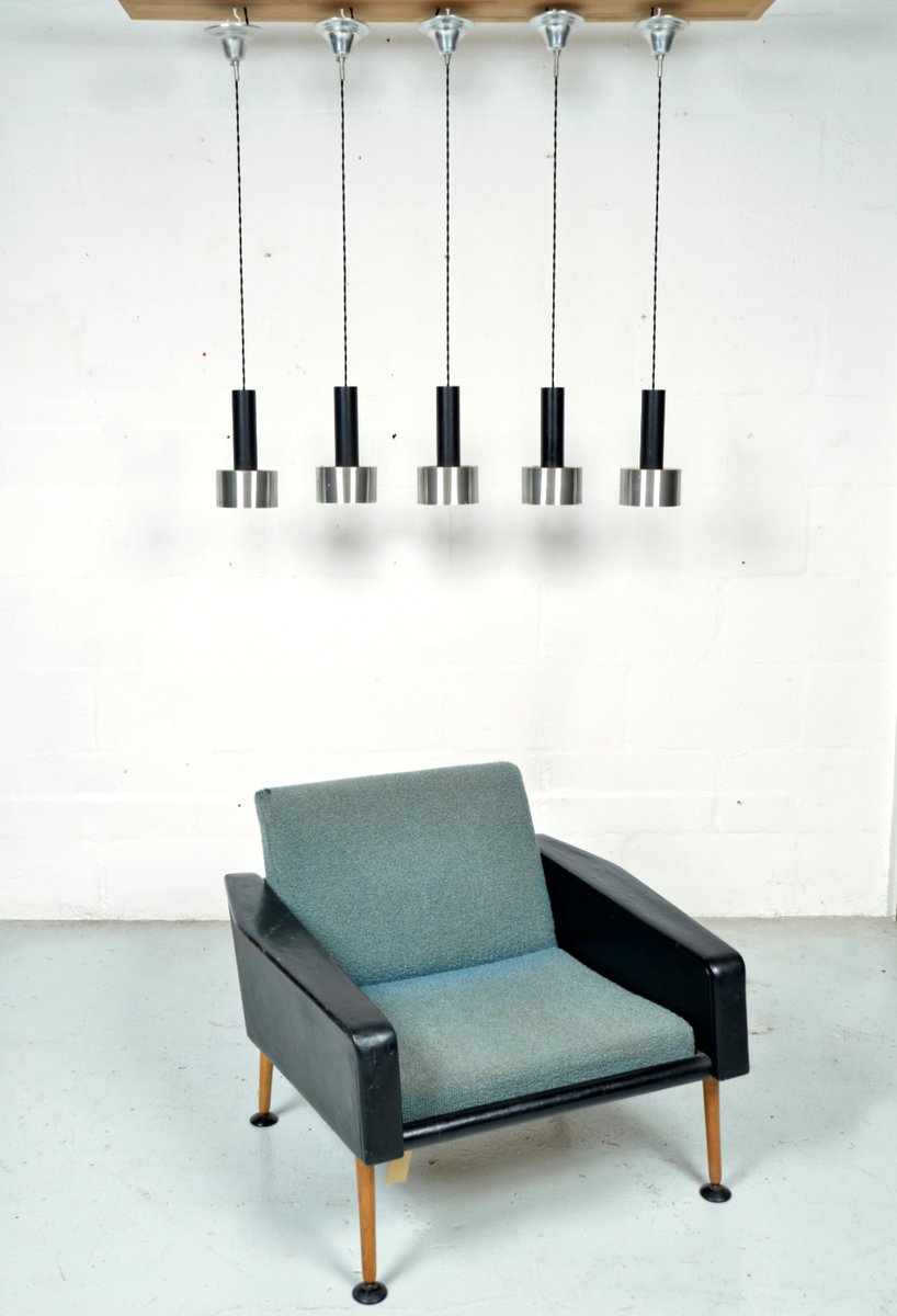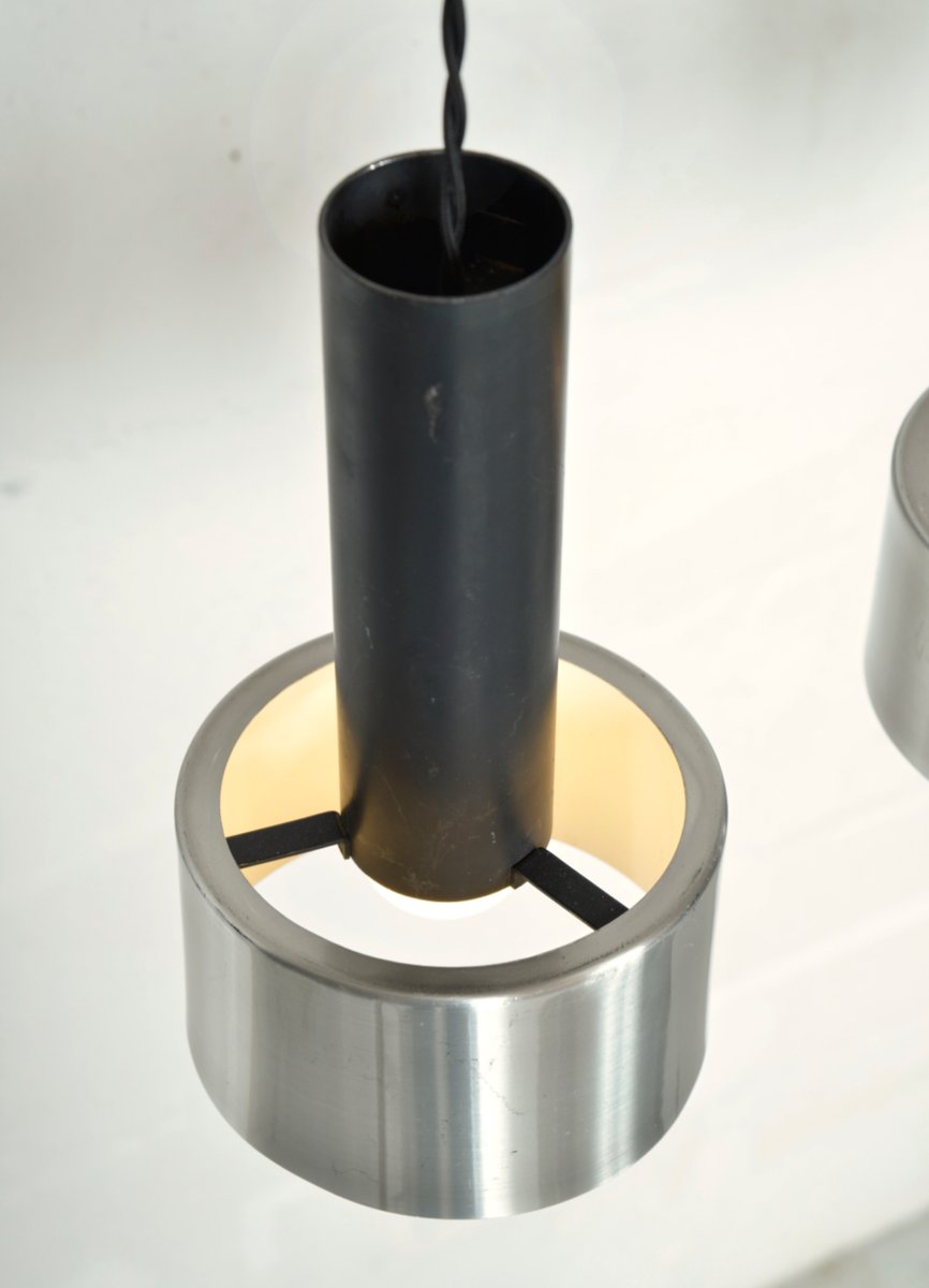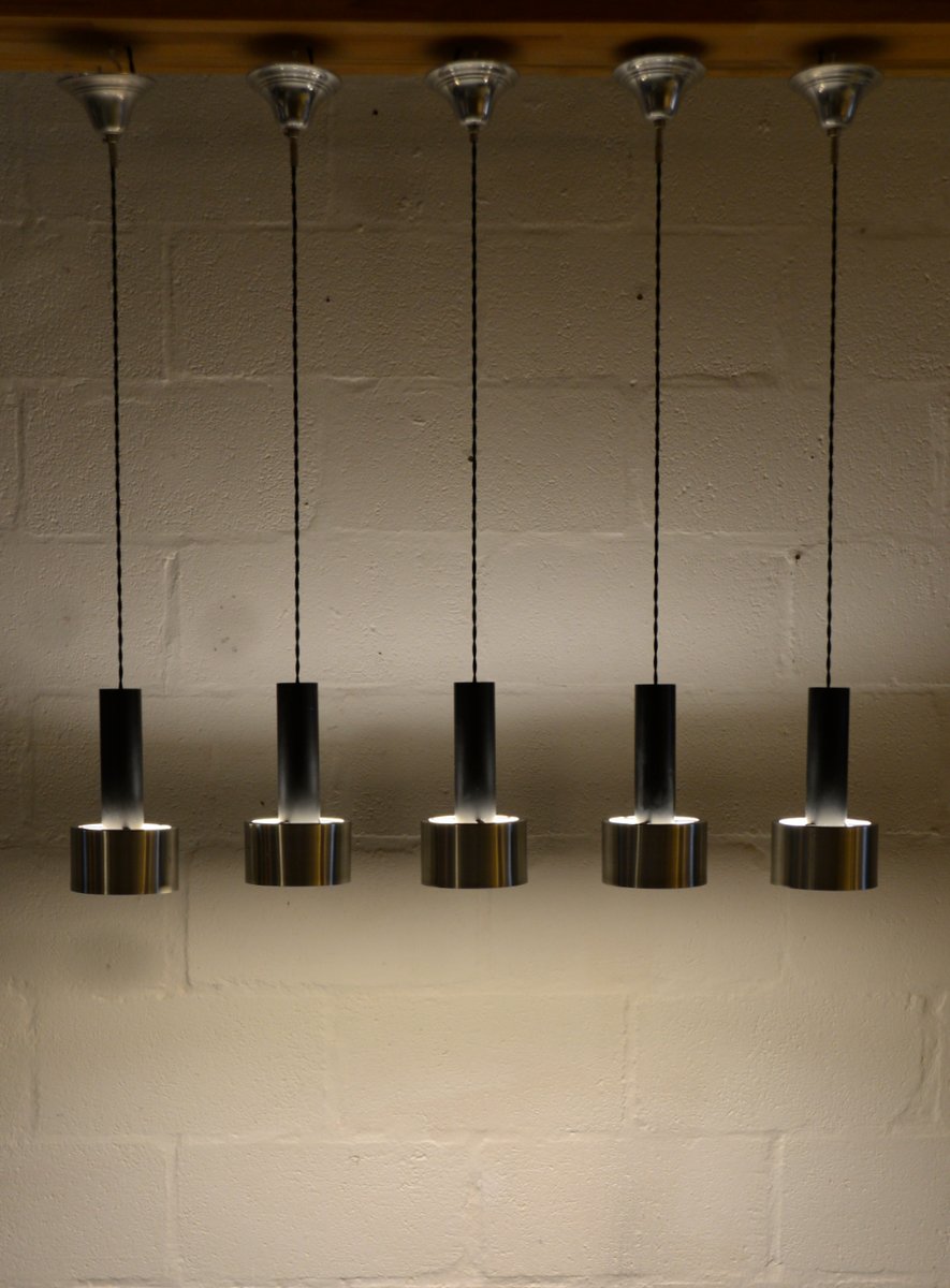 Eine fantastische Serie von fünf Pendelleuchten aus den 1960er Jahren, entworfen von Nico Kooy für Raak, Amsterdam, Niederlande. Hergestellt aus schwarzen konischen Metallrohren in Mattschwarz mit gebürsteten Aluminiumschirmen. Jede Leuchte wurde professionell mit schwarzem, 2-adrigem, geflochtenem Kabel neu verkabelt und mit verchromten Deckenrosetten an der Decke befestigt. Das Licht ist nach unten gerichtet, während von der Oberseite des Schirms, der im Original weiß lackiert ist, ein warmes Licht ausgeht. Die Pendelleuchten sind in einem guten Originalzustand, mit einigen altersbedingten Spuren, die ich durch Fotografieren jeder einzelnen Leuchte gezeigt habe. Das Holzbrett dient der Aufhängung der Leuchten und ist nicht Teil der Leuchte, da die Leuchten nach Belieben auseinander gestellt werden können.