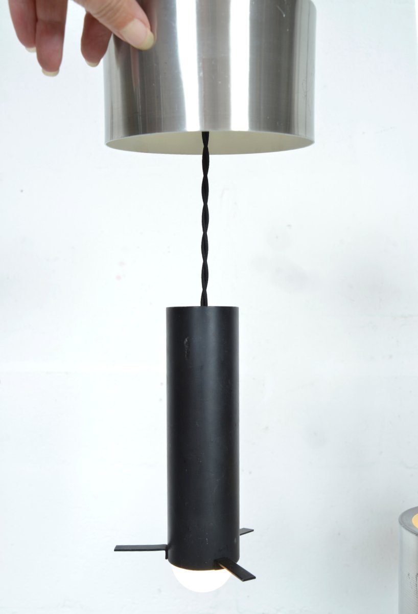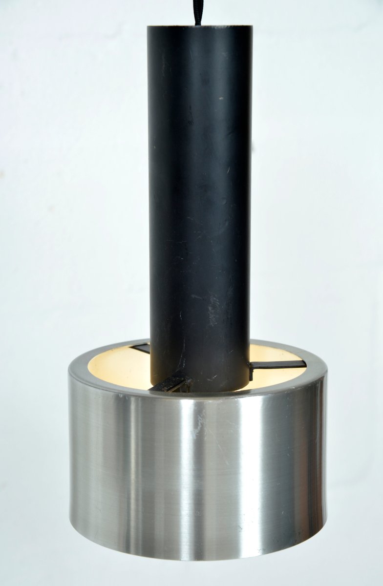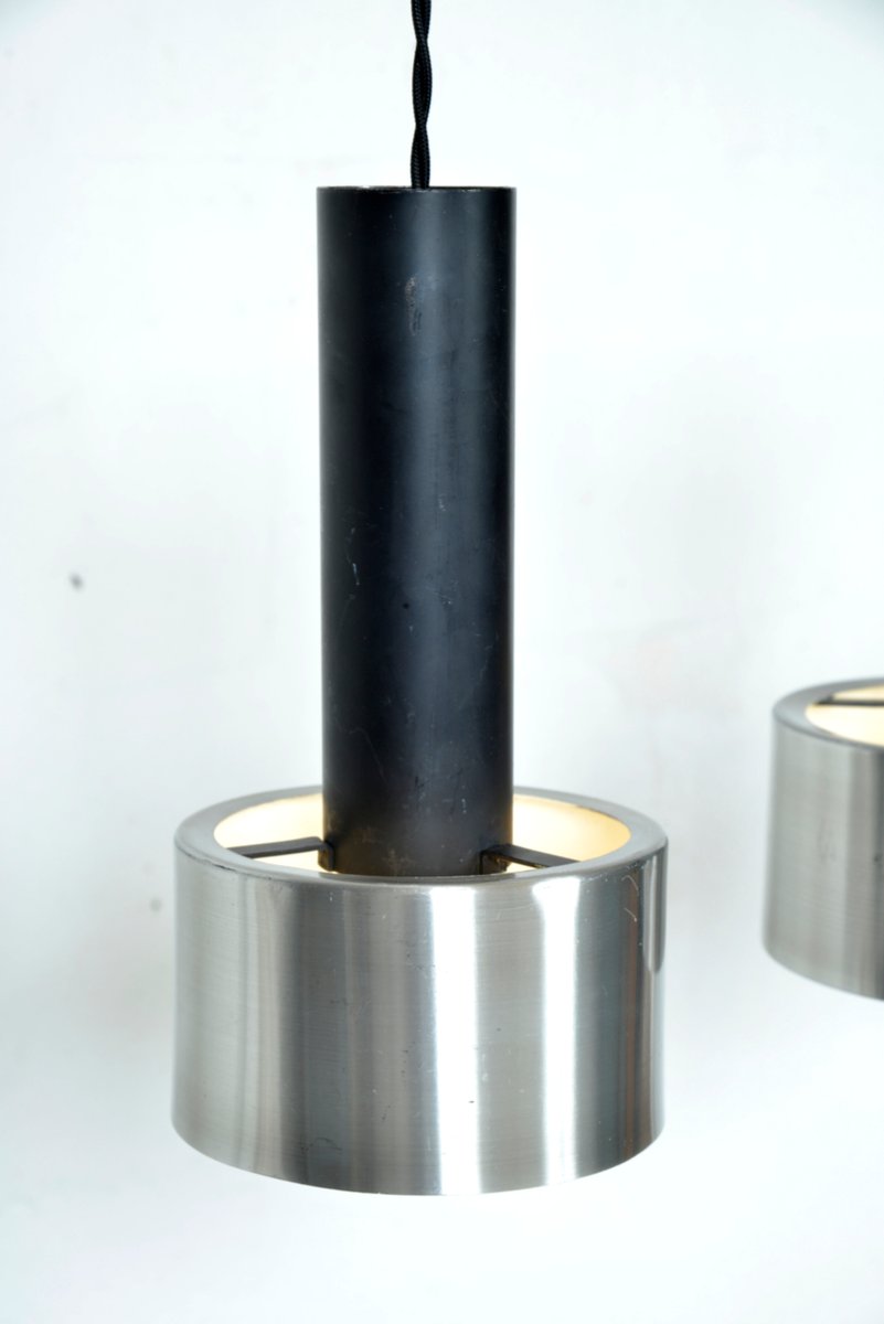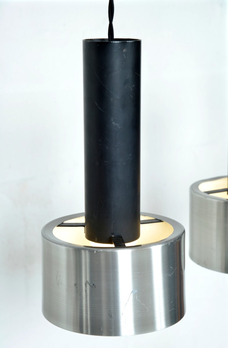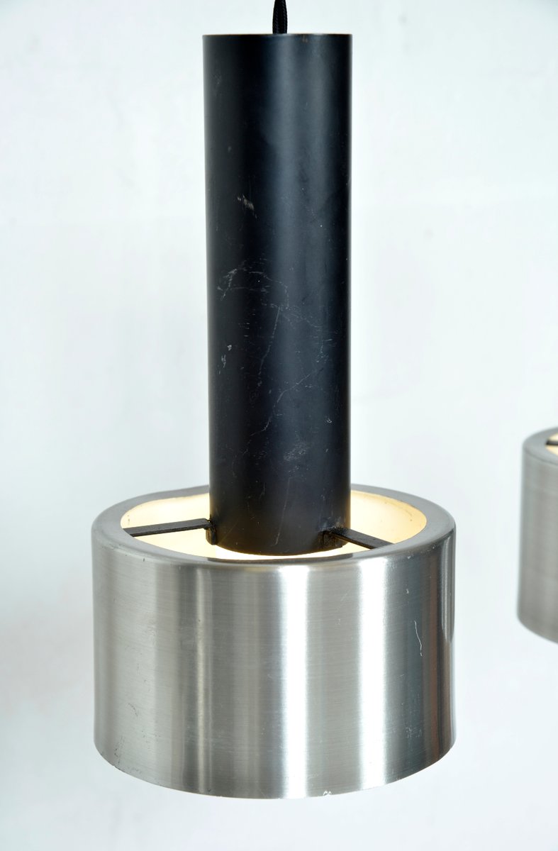 Eine fantastische Serie von fünf Pendelleuchten aus den 1960er Jahren, entworfen von Nico Kooy für Raak, Amsterdam, Niederlande. Hergestellt aus schwarzen konischen Metallrohren in Mattschwarz mit gebürsteten Aluminiumschirmen. Jede Leuchte wurde professionell mit schwarzem, 2-adrigem, geflochtenem Kabel neu verkabelt und mit verchromten Deckenrosetten an der Decke befestigt. Das Licht ist nach unten gerichtet, während von der Oberseite des Schirms, der im Original weiß lackiert ist, ein warmes Licht ausgeht. Die Pendelleuchten sind in einem guten Originalzustand, mit einigen altersbedingten Spuren, die ich durch Fotografieren jeder einzelnen Leuchte gezeigt habe. Das Holzbrett dient der Aufhängung der Leuchten und ist nicht Teil der Leuchte, da die Leuchten nach Belieben auseinander gestellt werden können.