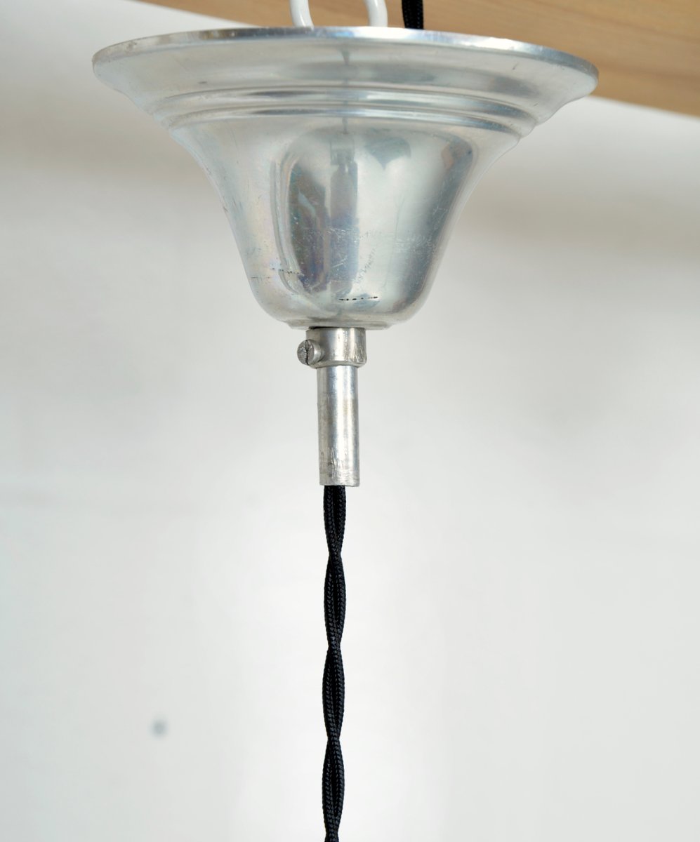 A fantastic run of five 1960s pendant lights designed by Nico Kooy for Raak, Amsterdam, The Netherlands. Made from black metal conical tubes in matt black with brushed aluminium shades. Each light has been professionally rewired using black 2-core braided cable and fit to the ceiling with chrome ceiling roses. The light is focussed downwards, whilst a warm light emanates from the top of the shade, which has its original painted white interior. The pendants are in good original condition, with a few age-related marks, which I have shown by photographing each pendant individually. The wooden board is used for hanging the lights, and is not part of the fixture, as the lights can be placed apart as desired.