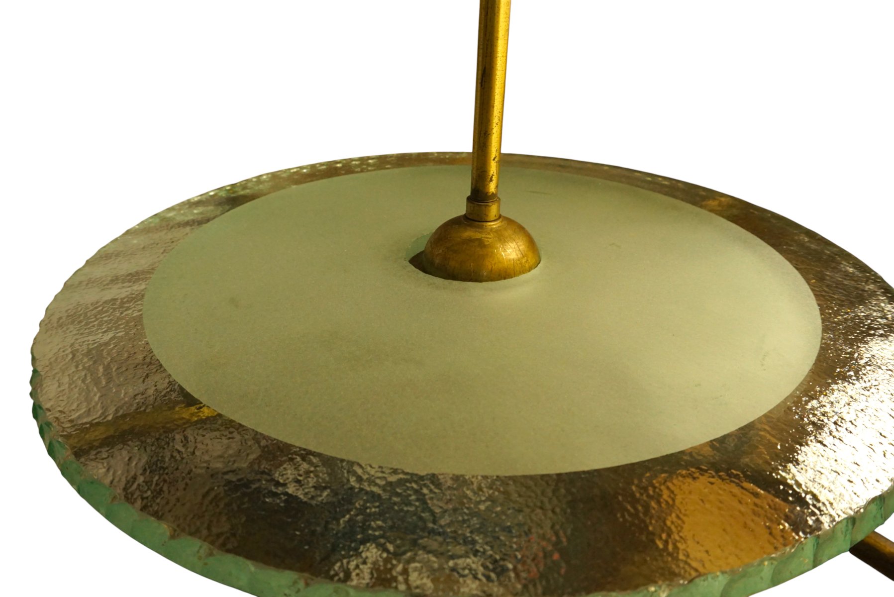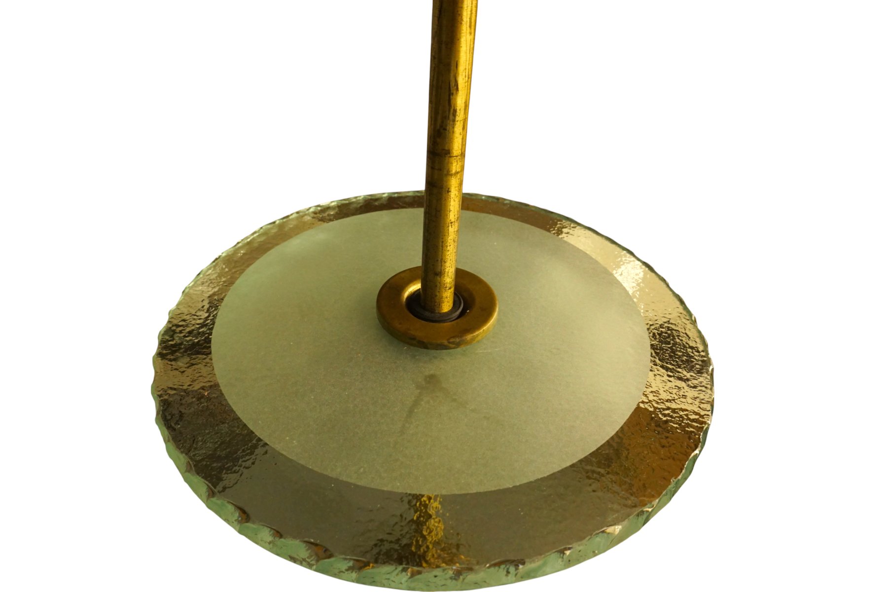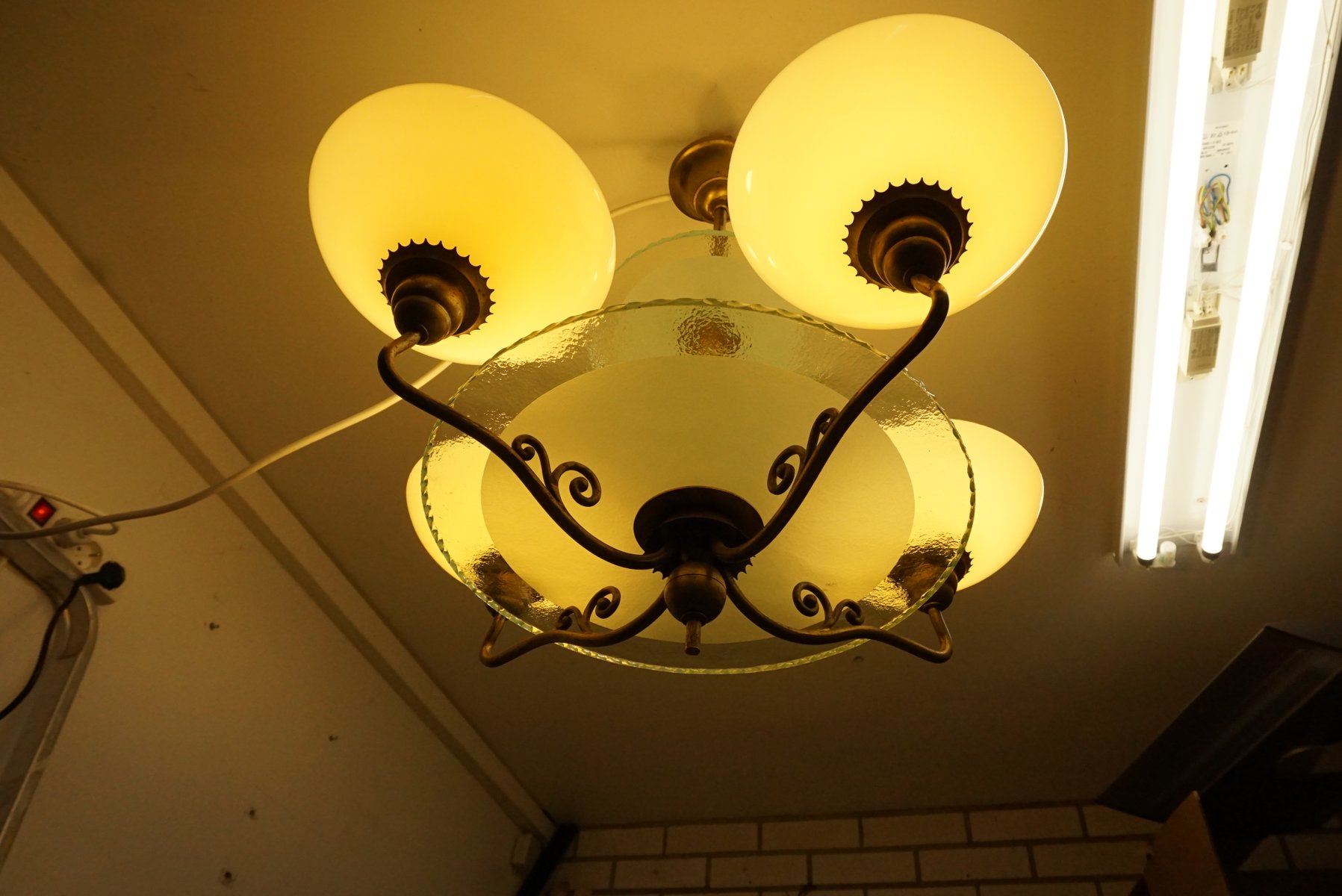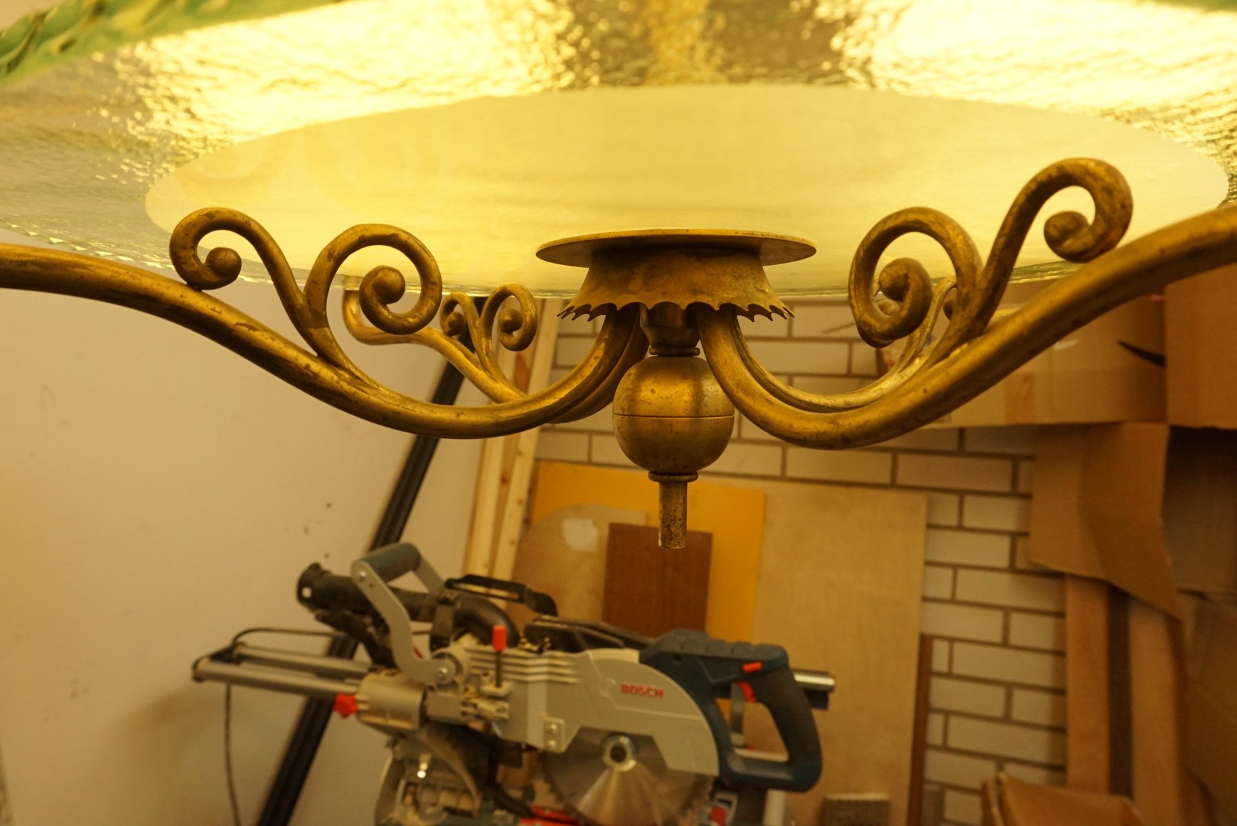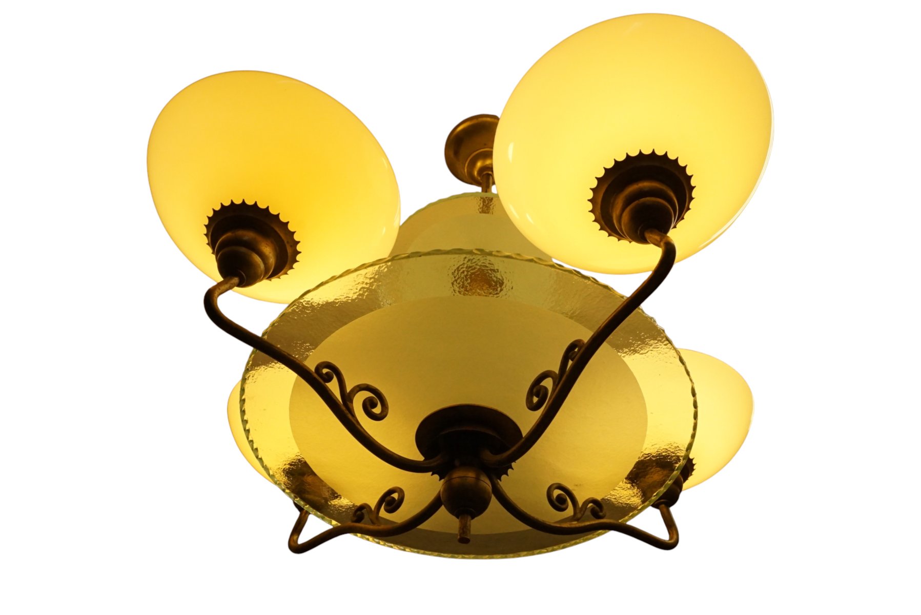 Vierarmiger Messing-Leuchter, zugeschrieben Harald Notini für Arvid Böhlmarks Lampfabrik, Schweden, ca. 1927–1933. Seltener Swedish-Grace-Kronleuchter mit typischen Notini-Stilelementen: geschwungene, reich verzierte Messingarme mit dekorativen Scrollworks und plastischen Schnörkeln, wie sie bei Harald Notini für Böhlmarks nachweisbar sind, u. a. beim Modell 6316 von 1927, publiziert im Katalog „Electric Lighting Armature, Nyheter 1927“, Iduns Tryckeri, Stockholm. Die markanten gezackten Messingaufnahmen der opalinen Glasschalen folgen exakt der bei Modell 6316 beschriebenen Konstruktion, bei der die „shades are attached to brass holders with a serrated shape“ und das Zentrum serratierte Dekordetails trägt; eine Variante 6316 A ist im Böhlmarks-Katalog von 1933 dokumentiert. Der Leuchter besitzt zwei türkisgrüne Glasdiscs – eine oberhalb und eine unterhalb der Arme –, die als Lichtdiffusoren wirken und auf die von Notini dokumentierte Verwendung zusätzlicher Glasscheiben verweisen, etwa beim Modell 10034 mit „four shades and two discs in engraved Havana glass“ im Böhlmarks-Katalog 1936 sowie bei einem weiteren Modell mit drei Glasscheiben. Opaline Glas-Schalen mit sanfter Lichtwirkung, patiniertes Messing und die Kombination aus serratierten Messingfassungen, geschwungenen Armen mit Ornamenten und zusätzlichen Glasscheiben machen diesen Deckenleuchter zu einem typisch schwedischen Art-Déco-/Swedish-Grace-Entwurf der späten 1920er bis