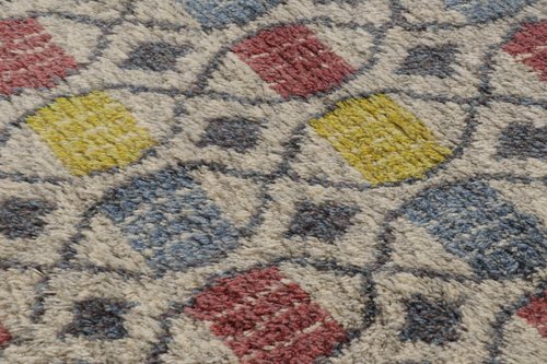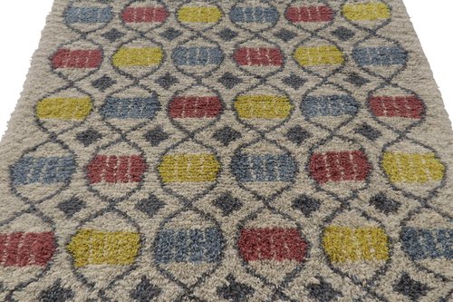 Dieser schwedische Rya-Teppich im Format 5x7, handgeknüpft aus üppiger, hochfloriger Wolle in Schweden um 1960-1970, ist eine kühne neue Ergänzung zu den kultigen, sammelwürdigen skandinavischen Teppichen dieser Provenienz aus der Mitte des Jahrhunderts. Über das Design: Kenner werden dieses Stück als einen der schönsten Vintage-Teppiche schätzen, die wir aus diesem Stil kuratiert haben, mit einem ebenso prächtigen und einzigartigen Design für dieses Handwerk. Rya-Teppiche sind bekannt für ihre farbenfrohen, ausdrucksstarken abstrakten Muster und ihren dicken Hochflor. Dieses Stück besticht durch farbenfrohe geometrische Medaillons in Blau-, Rot-, Gelb- und Grautönen auf einem beige-cremefarbenen Feld, die einen herrlichen Shabby-Chic-Retro-Look hervorrufen. Das Design ist lebendig und komplex für Werke dieser Technik, aber dennoch beispielhaft für schwedische Teppiche in ihrer impressionistischen, ländlich-schicken Schönheit - ein traditioneller Teppich, der zu den frühesten Werken der rustikalen skandinavischen Rya-Teppiche in unserer Sammlung gehört. Zustand: Dieser schwedische Vintage-Teppich befindet sich in einem für sein Alter und seine Herkunft guten Zustand.