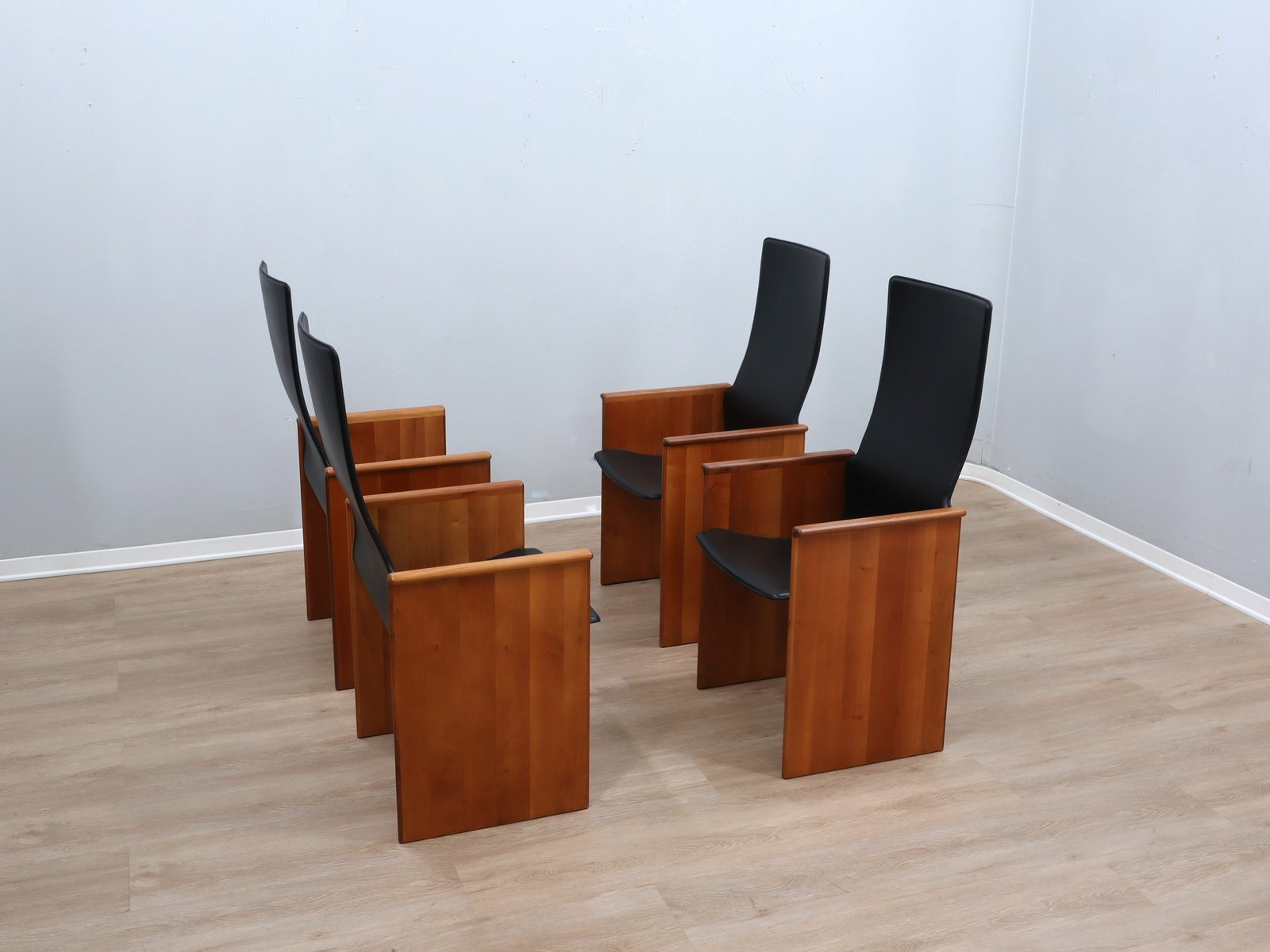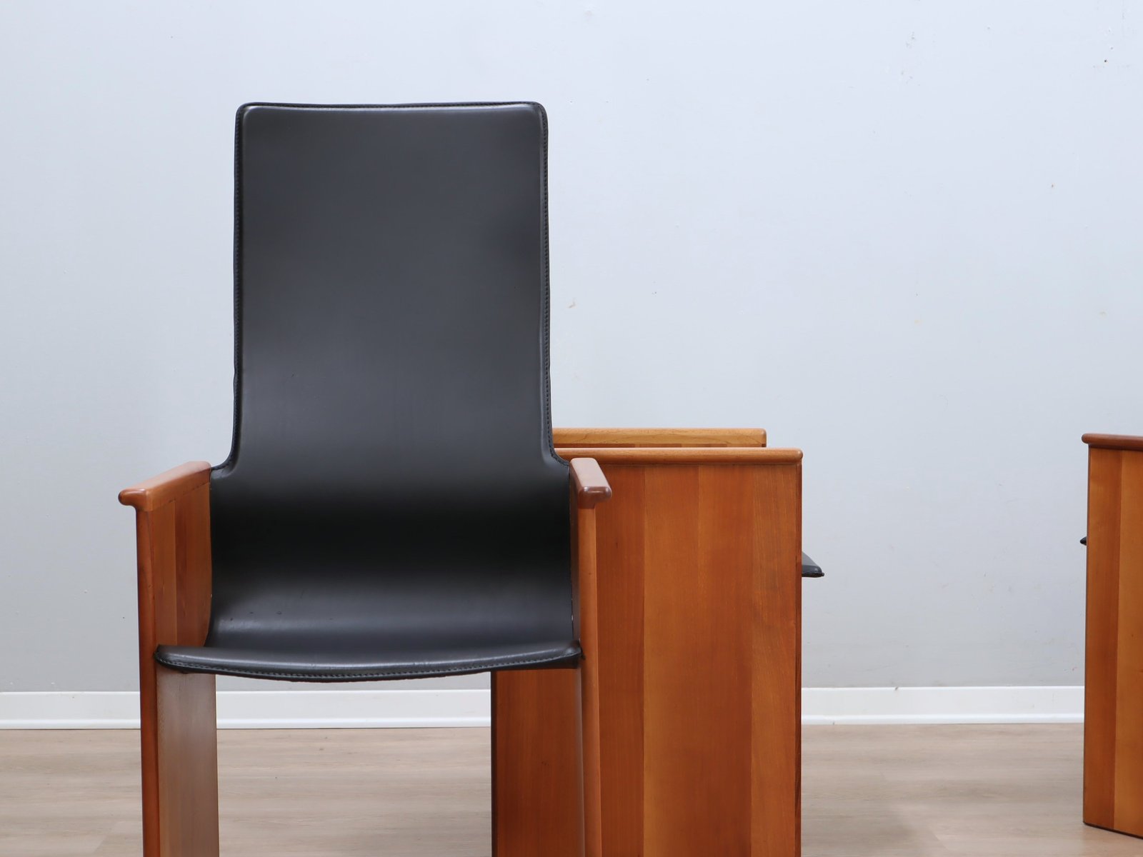Diese Stühle zeichnen sich durch ihr kompromissloses Engagement für eine hochwertige Konstruktion aus. Das Gestell aus nussbaumfurniertem Mehrschichtholz weist die präzisen, architektonischen Linien auf, die für die damalige Zeit charakteristisch waren. Diese Struktur fügt sich nahtlos in das edle schwarze Originalleder der Sitzfläche und der hohen Rückenlehne ein. Die Verwendung hochwertiger Materialien in Verbindung mit der markanten Silhouette und den integrierten Armlehnen ergibt ein Stück von hohem künstlerischen Wert, das jedes anspruchsvolle Interieur aufwertet.
