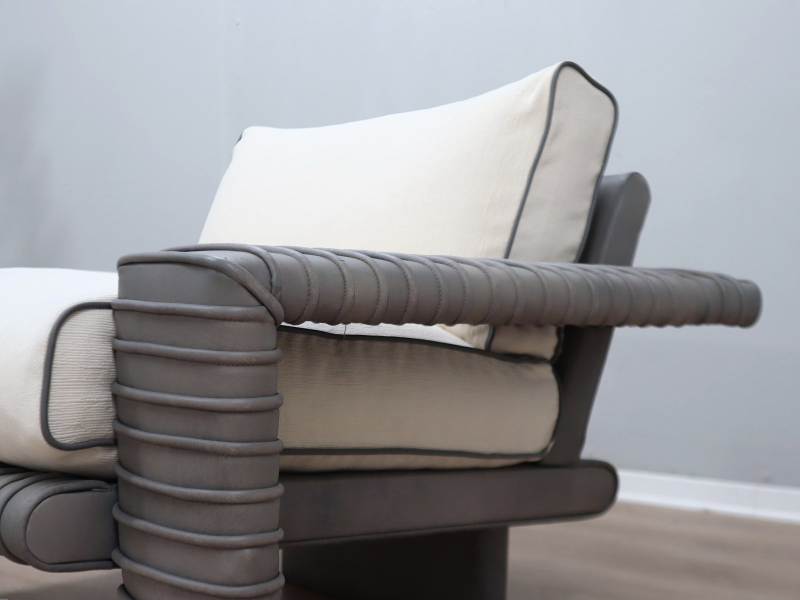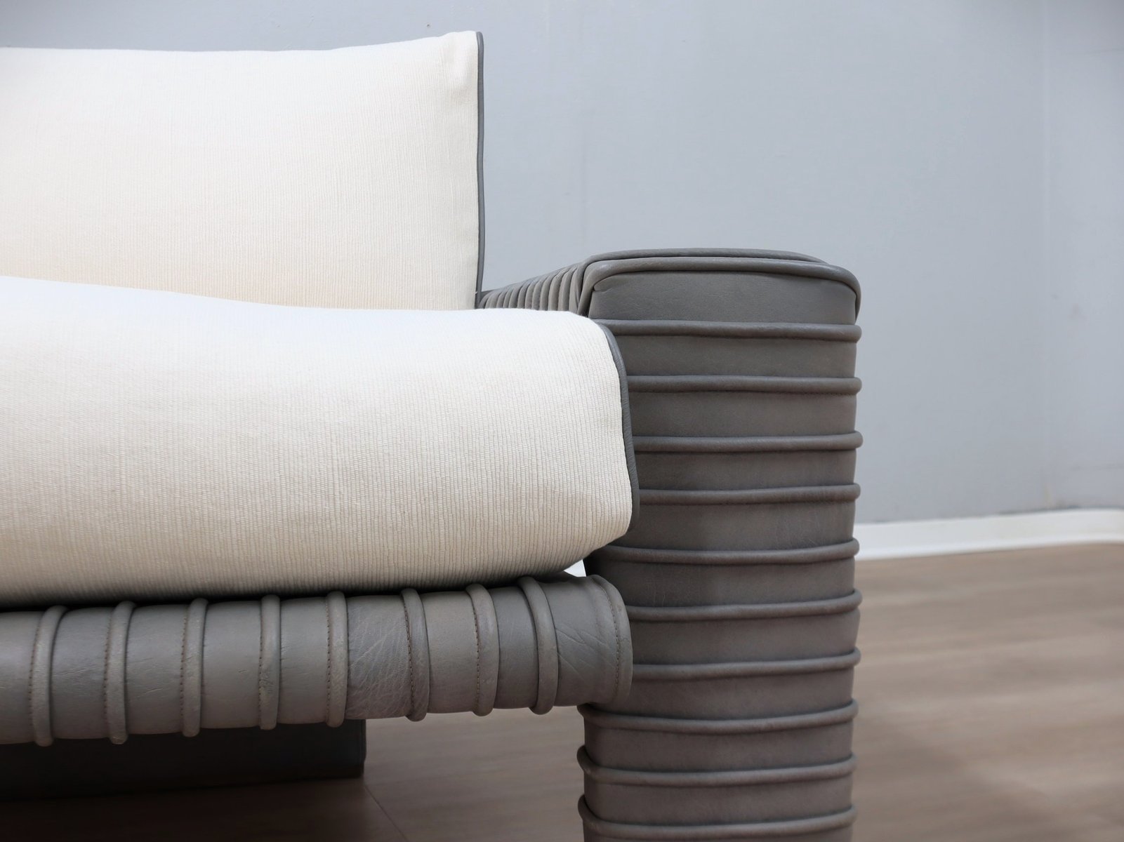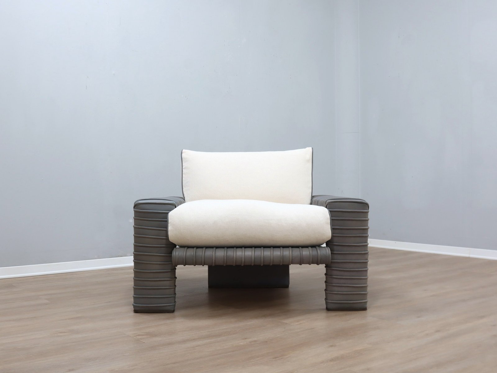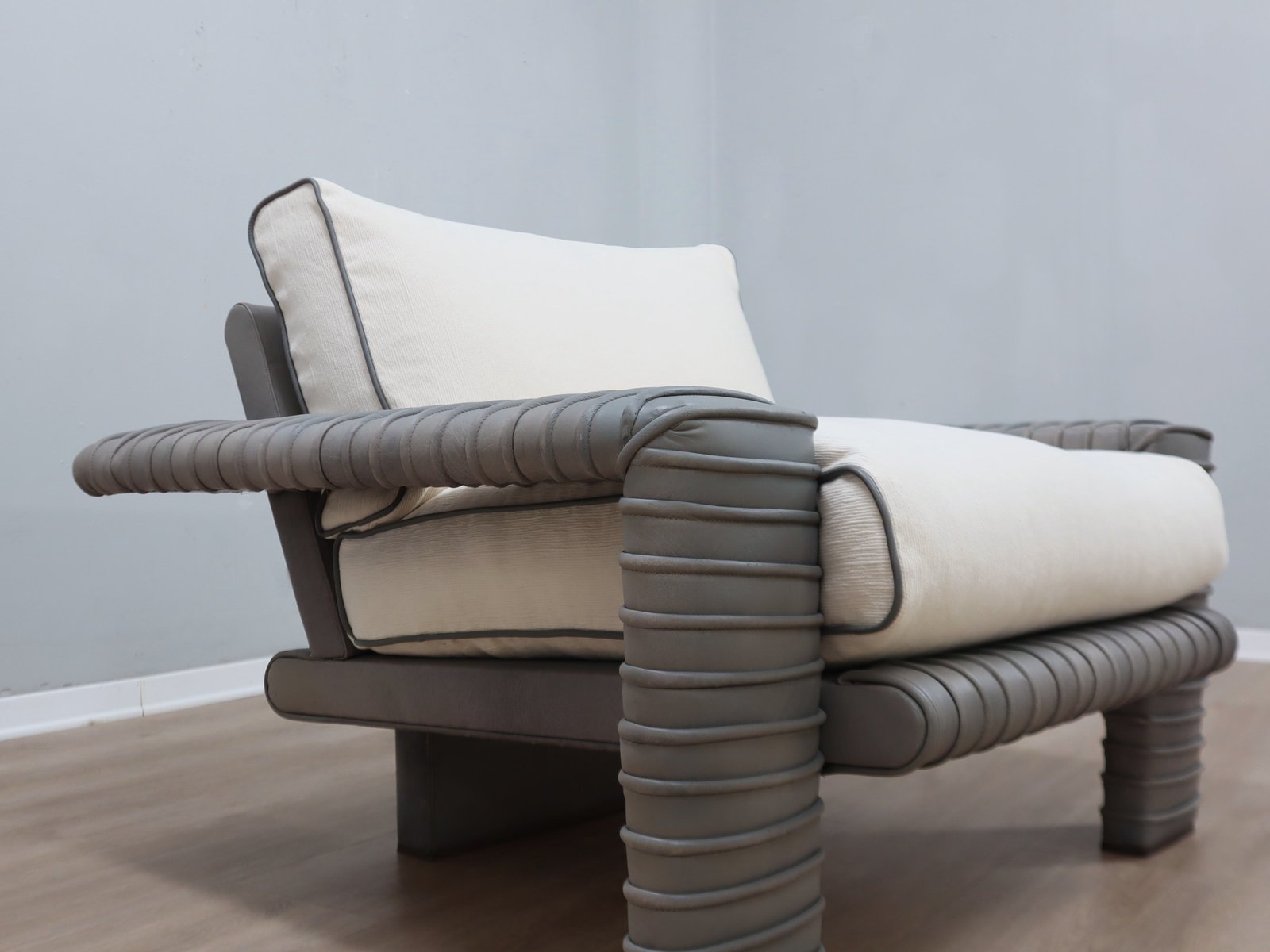 Dieser skulpturale Sessel von Marzio Cecchi fängt den Geist des italienischen Designs der 1970er Jahre in einer kompakteren, aber ebenso auffälligen Form ein. Die gerippte Lederstruktur weist eine reichhaltige, gealterte Patina auf, die von ihrer Authentizität und handwerklichen Tradition zeugt. Das Sitzkissen wurde mit frischem weißem Baumwollstoff, Lederpaspeln und einer Füllung aus echten Gänsedaunen neu bezogen, wodurch der volle Komfort wiederhergestellt und das Stück durch einen konservativen Restaurierungsprozess, der die ursprünglichen Materialien berücksichtigt, erhalten bleibt.
