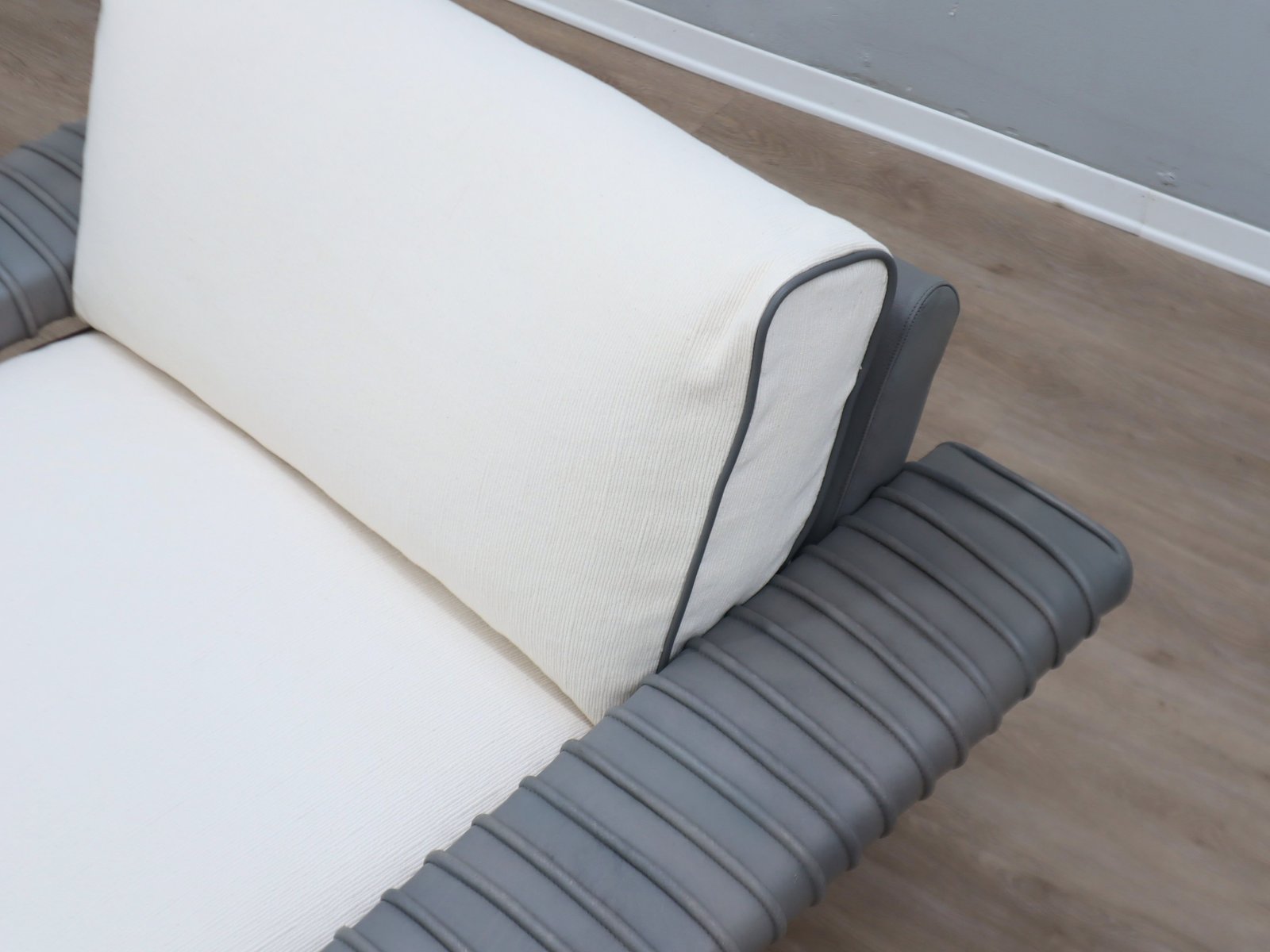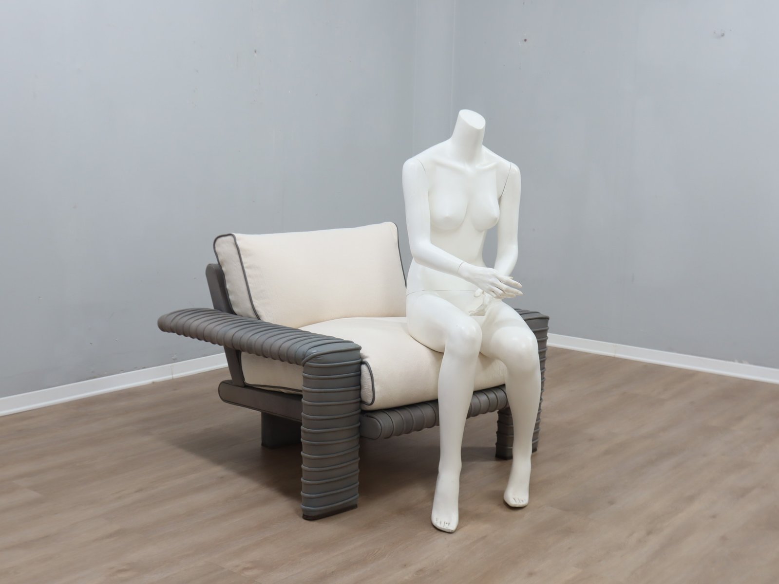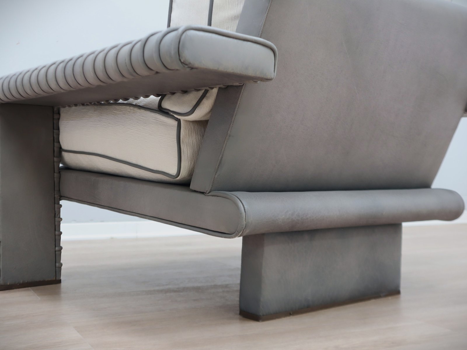 The seat cushion has been newly rebuilt with fresh white cotton fabric, leather piping, and genuine goose down filling, restoring full comfort while preserving the piece through a conservative restoration process that honors its original materials.