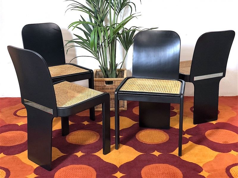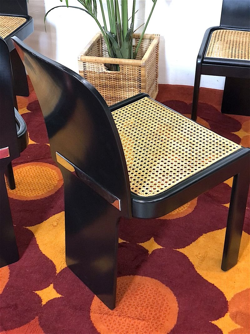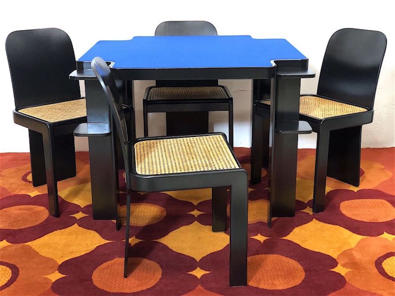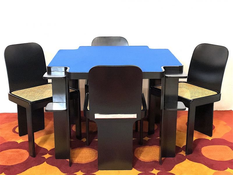 Space Age Gaming Set 70s Made in Italy The set consists of 4 chairs designed by Pierluigi Molinari and produced by POZZI - MILANO, the table is produced by CINI & NILS. Completely restored, the complete set has been oven-repainted in matt black, seats in Vienna straw, the table has a cover with a new Sky Blue fabric. The table structure, like the chairs, are made of steam-bent ash wood, the chairs are characterised by a chrome detail on the backrest which makes them incredibly elegant. PERFECT CONDITIONS Chair measurements: Height 80 cm - Width 48 cm - Depth 48 cm - Seat 46 x 46 cm - Seat height 40 cm Table measurements: Height 74 cm - Width 100 cm - Depth 100 cm