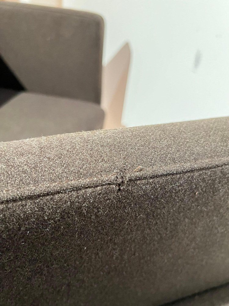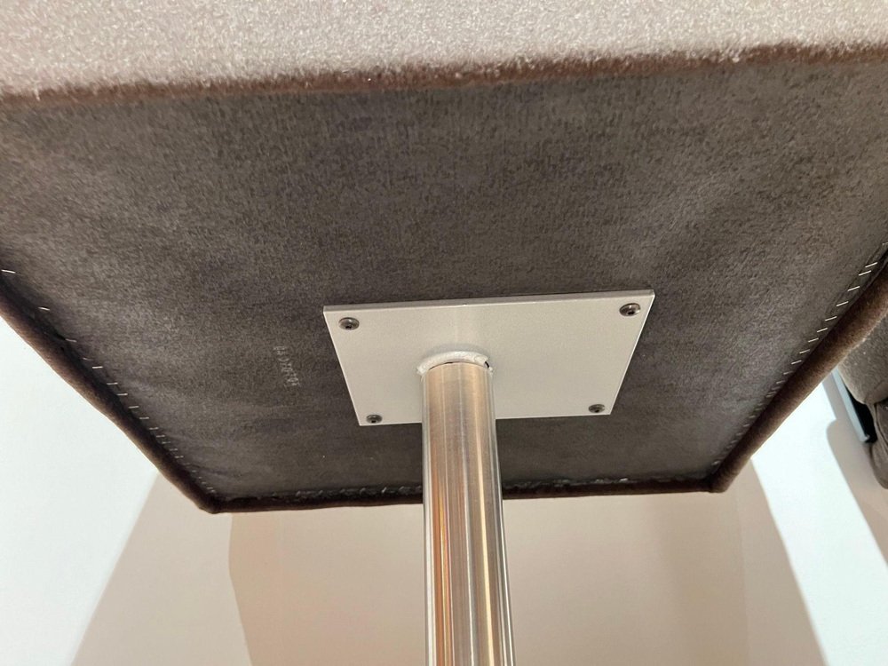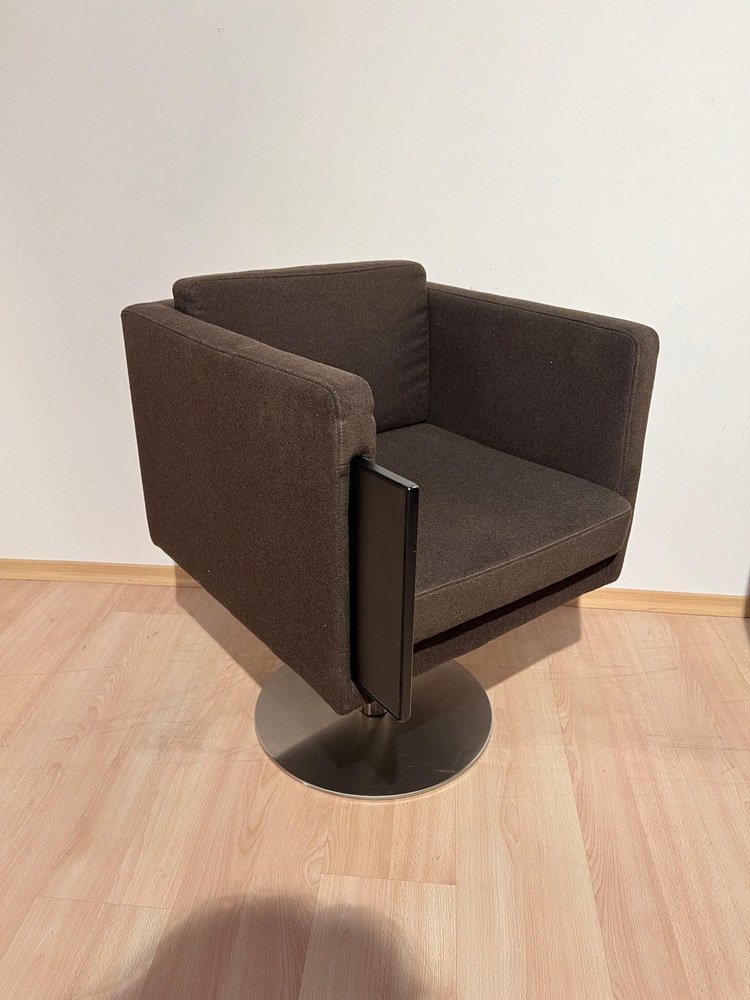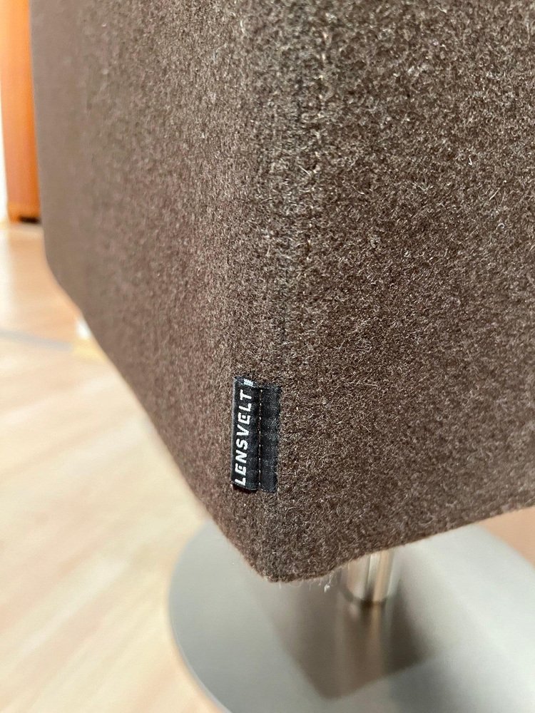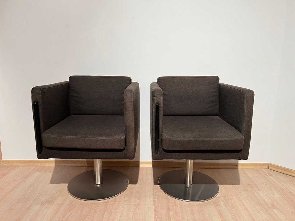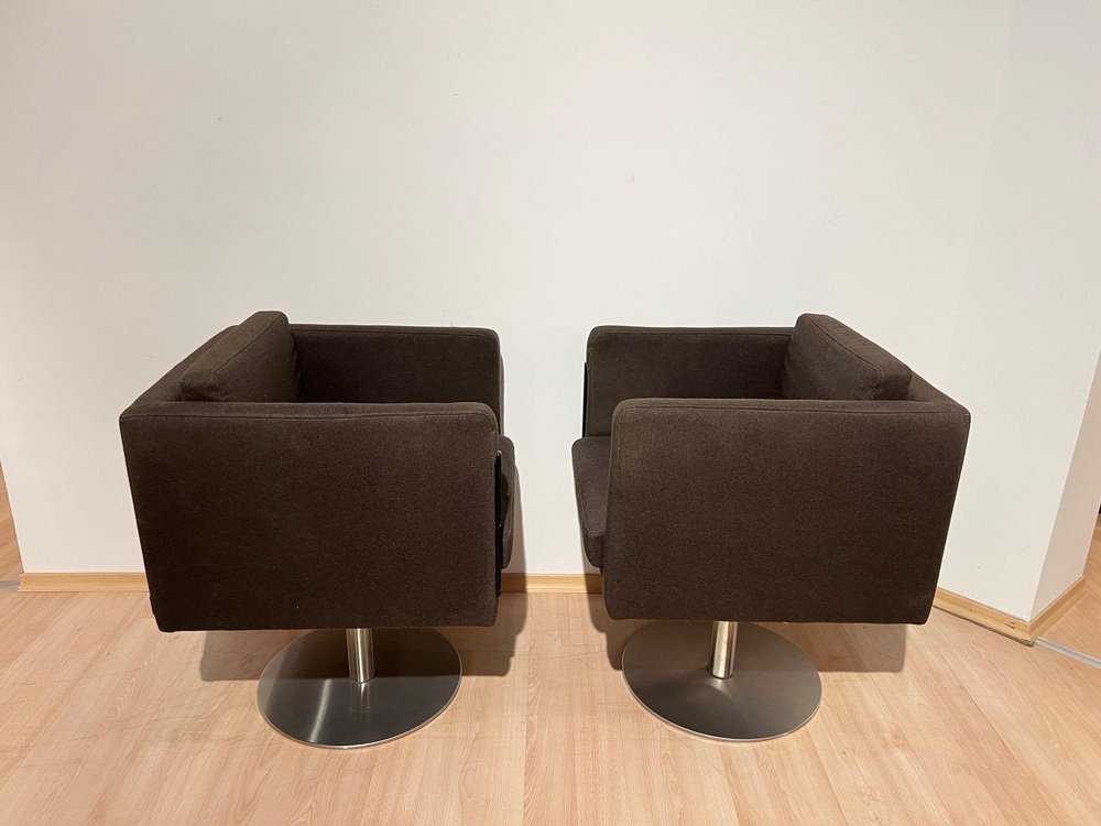 Pair of cubic Swivel Chairs with Tableau by Lensvelt, Netherlands, early 21st C. * Design: Dirk Van Berkel * Model: „Deejay“ (2001) Cubic shape. Mocca Brown Original Felt in very good condition. Standing on brushed stainless steel bar and round plinth. Fully rotating Special feature: Inside the right armrest, there is a hidden black lacquered metal pullout shelf. Dimensions: * H 81 cm x B 58,5 cm x D 64 cm x Seat-H 51 cm x Arm-H 76 cm * H 31,9“ x B 23 cm x D 25,2“ x Seat-H 20“ x Arm-H 29,9“ A perky piece of furniture, which nevertheless conveys a certain formality and provides a very comfortable seat. Dirk van Berkel was looking for the critical tension between a stable bucket shape and the precise detailing of the steel or matted-chrome base. The legs have casters. Leather is often the preferred upholstery because of its high-quality look, and the shape of the chair has therefore been kept straightforward. The Deejay is also available with an integrated, fold-out writing surface. The chair is also available with a columnar base for in reception rooms, waiting rooms and meeting rooms.