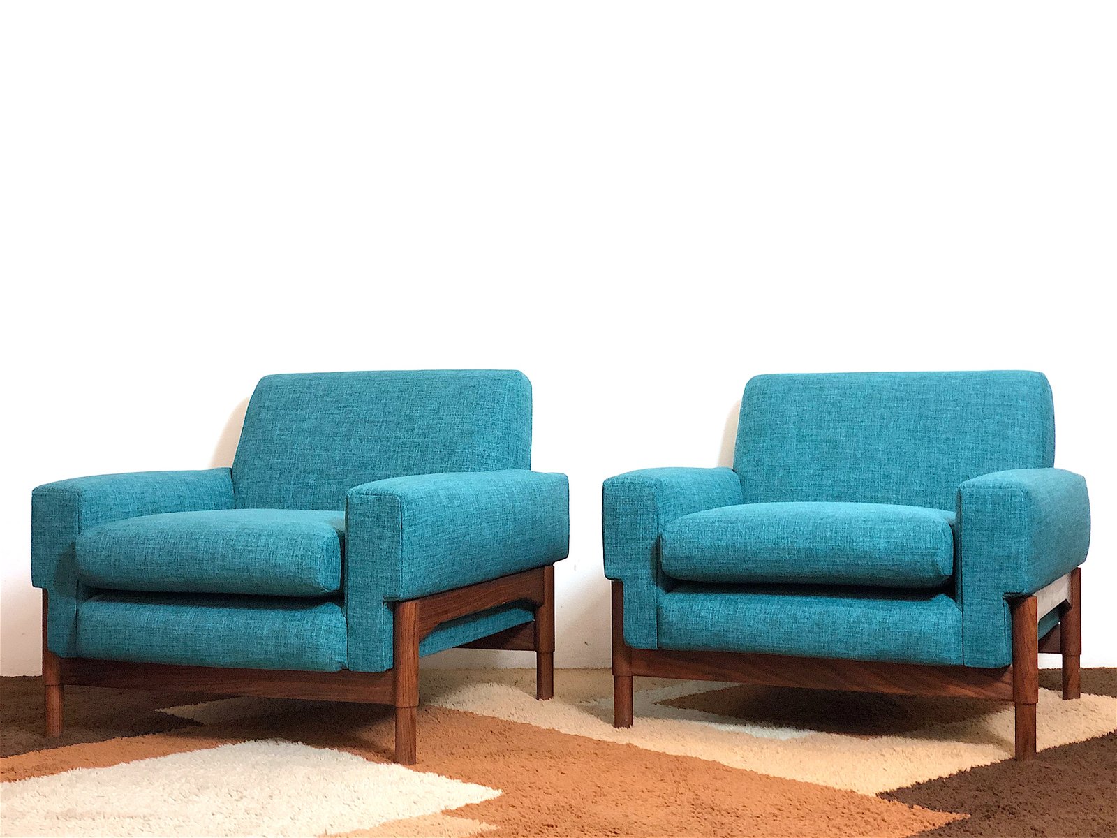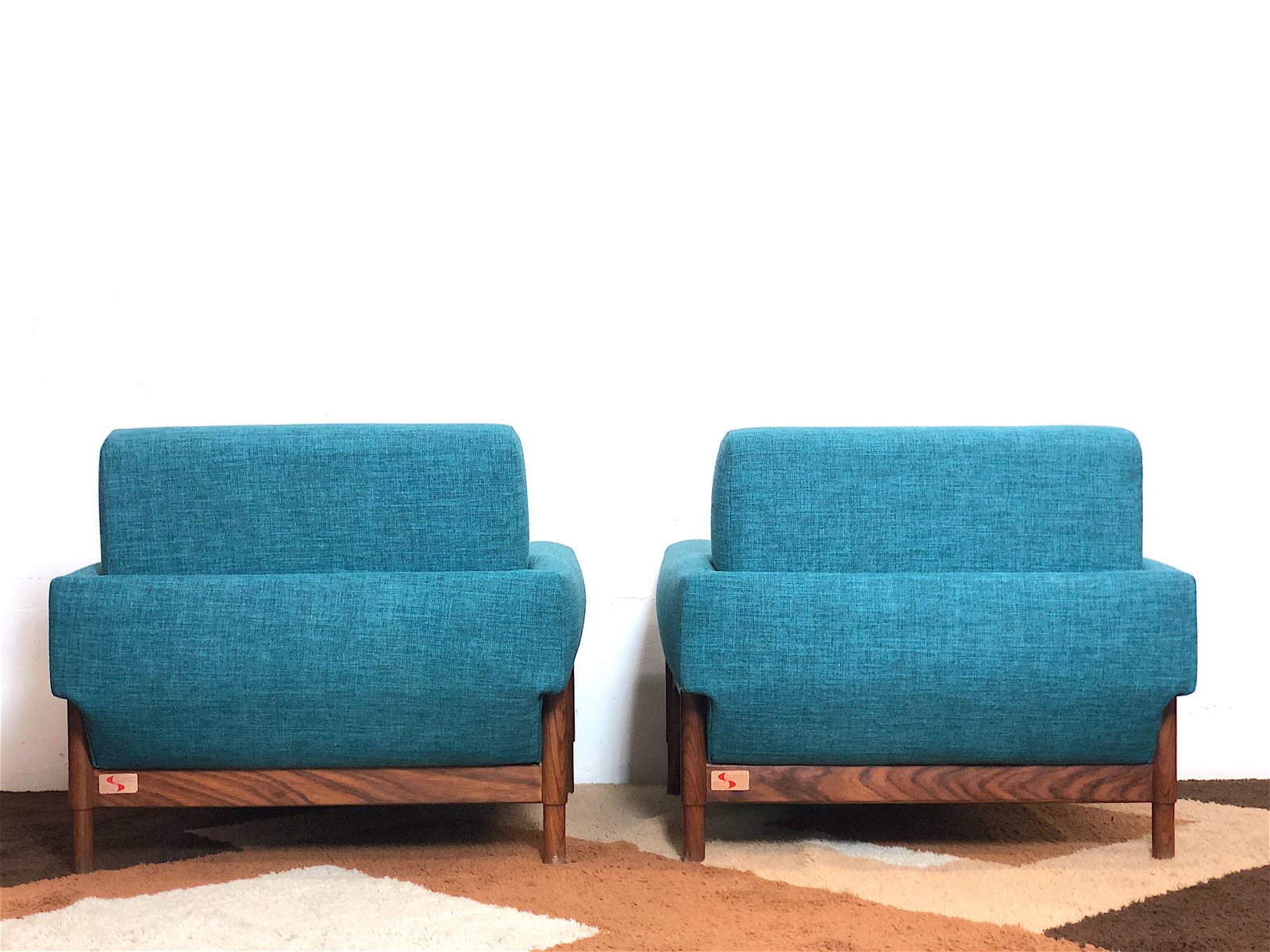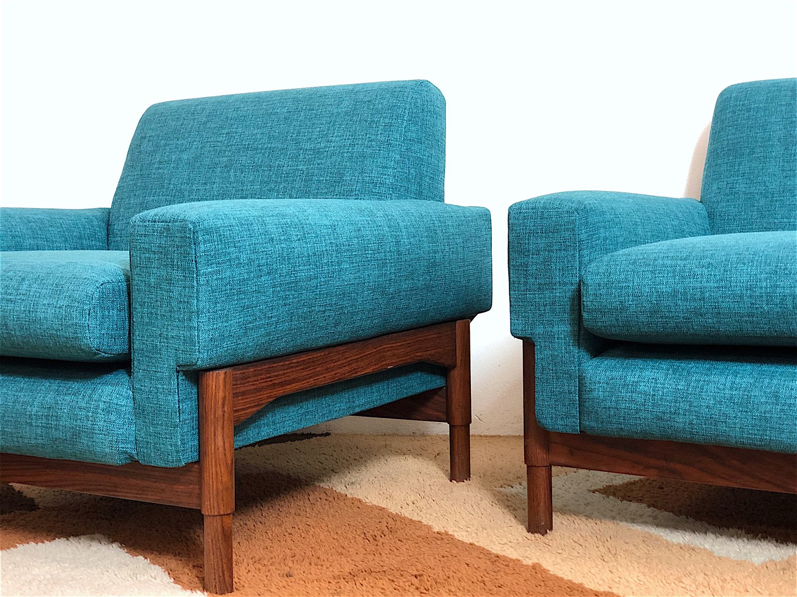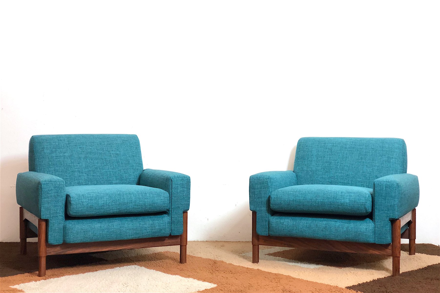 Pair of Vintage "KIUSHU" Armchairs - Made in Italy - The armchairs are of Italian manufacture from the 1960s. The KIUSHU model was designed by the SAPORITI brothers, they stand out for a low and wide structure with generous padding, completely restored with new interior and upholstery. The structure is in solid National Walnut wood, internal padding made of high quality polyurethane foam, covered in Sky Blue cotton fabric. The KIUSHU model is an excellent example of Italian design from the 60s, characterized by futuristic lines. This armchair model stands out for an extremely innovative design that mixes sculptural shapes with ergonomic functionality. Ready to furnish your living room, with a modern style that makes these pieces adaptable to various contexts. PERFECT CONDITIONS Measurements: Height 75 cm - Width 85 cm - Depth 85 cm - Seat 50x60 cm - Seat height 45 cm
