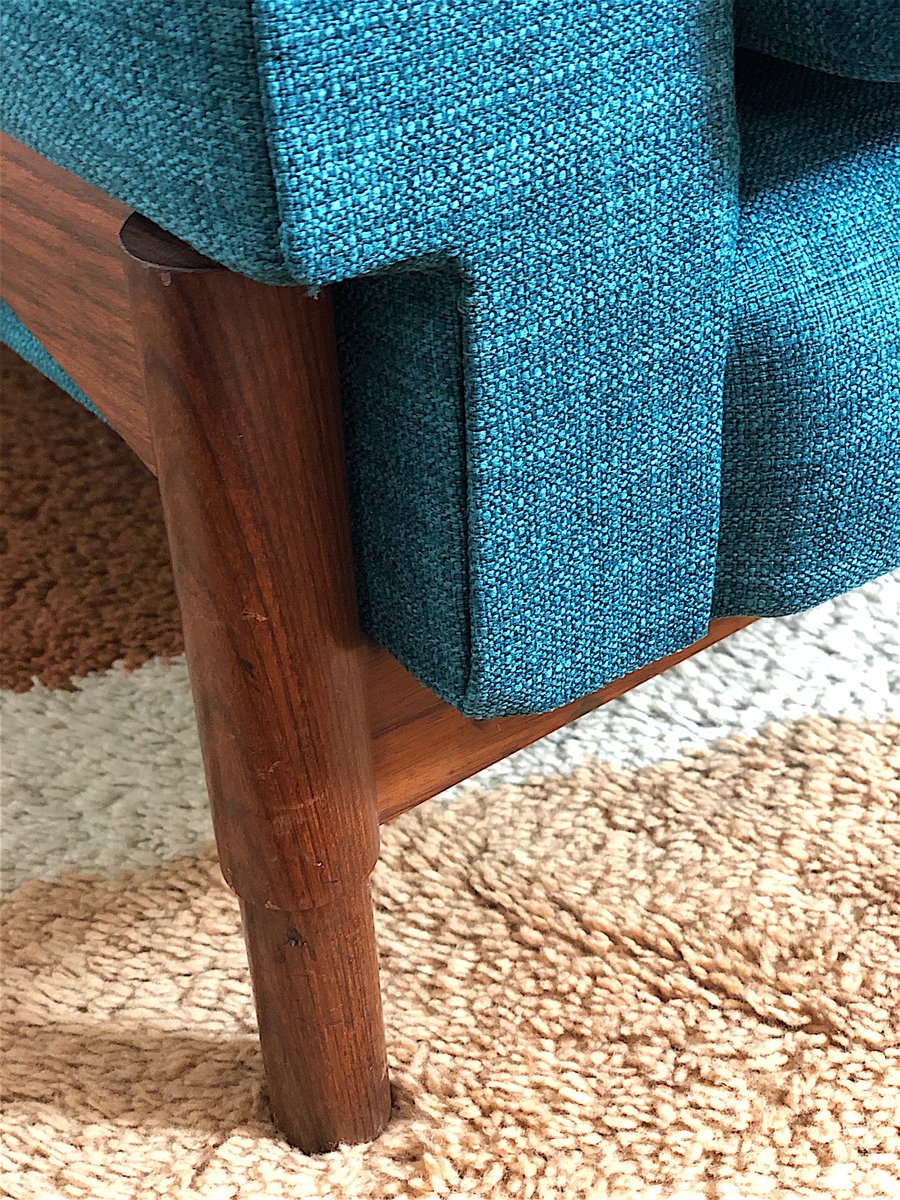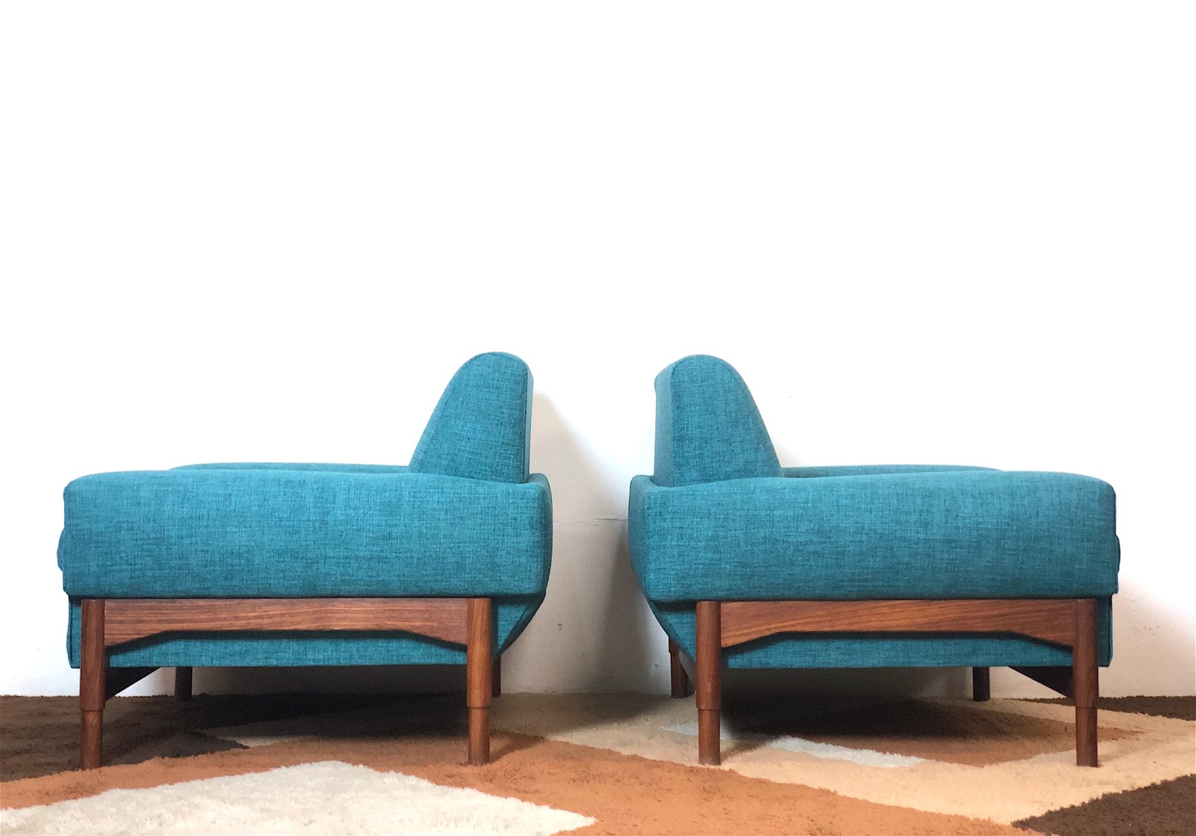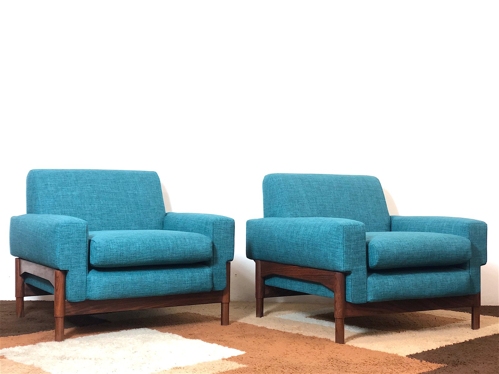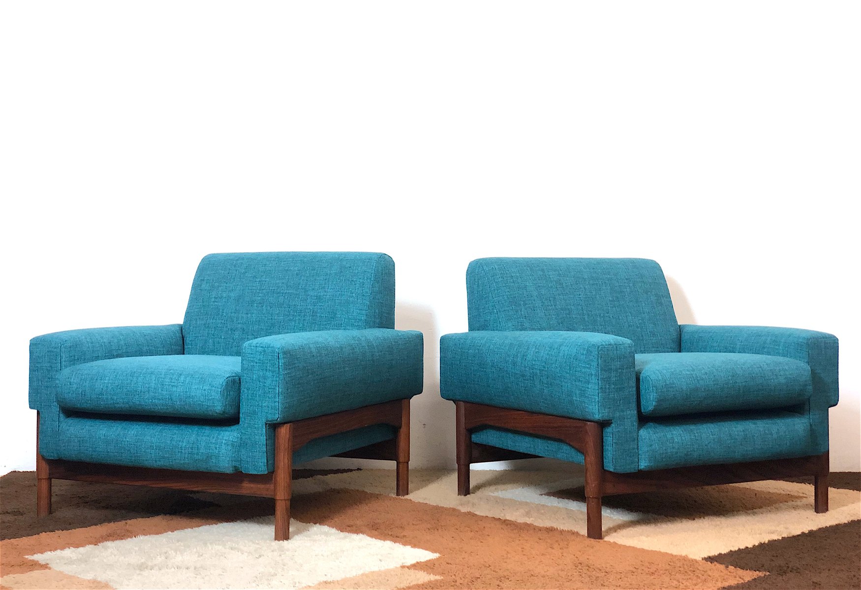 Pair of Vintage "KIUSHU" Armchairs - Made in Italy - The armchairs are of Italian manufacture from the 1960s. The KIUSHU model was designed by the SAPORITI brothers, they stand out for a low and wide structure with generous padding, completely restored with new interior and upholstery. The structure is in solid National Walnut wood, internal padding made of high quality polyurethane foam, covered in Sky Blue cotton fabric. The KIUSHU model is an excellent example of Italian design from the 60s, characterized by futuristic lines. This armchair model stands out for an extremely innovative design that mixes sculptural shapes with ergonomic functionality. Ready to furnish your living room, with a modern style that makes these pieces adaptable to various contexts. PERFECT CONDITIONS Measurements: Height 75 cm - Width 85 cm - Depth 85 cm - Seat 50x60 cm - Seat height 45 cm