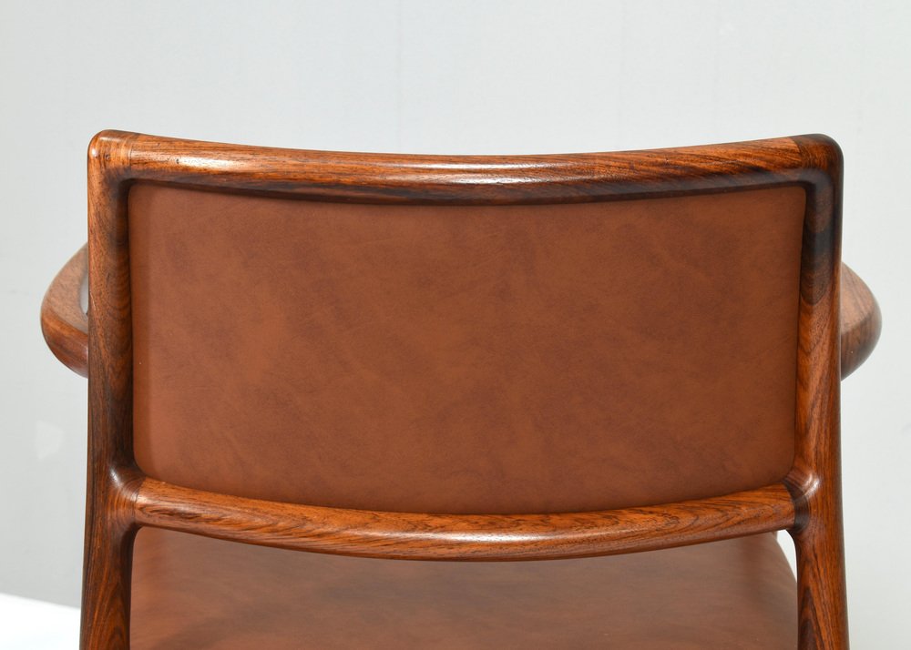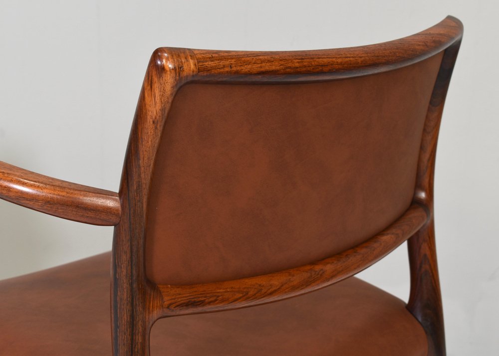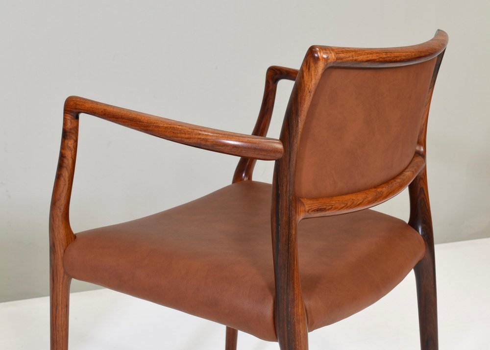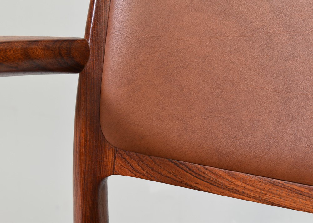 Niels Otto Møller Model 65 Dining Chairs: Timeless Craftsmanship Meets Modern Elegance The Niels Moller Model 65 Dining Chairs embody the perfect blend of form, function, and Danish design excellence. Originally designed in the 1960s by the legendary Niels Möller, these chairs are celebrated for their minimalist aesthetic, ergonomic comfort, and exceptional craftsmanship. Each chair is meticulously crafted from the finest wood, showcasing Møller's signature joinery and attention to detail. with their clean lines, subtle curves, and elegant profile, the Model 65 dining chairs effortlessly complement a wide range of dining tables and interior styles. The gently curved backrest and contoured seat provide optimal support, ensuring a comfortable dining experience that will last for generations. Whether you're furnishing a modern dining room or enhancing a classic interior, the Niels Møller Model 65 Dining Chairs offer a sophisticated, timeless design that will elevate any space. Designer: Niels Otto Møller Manufacturer: JL MØLLERS MØBELFABRIK Denmark Country: Denmark Model: nr. 65 dining armchairs Design period: 1968 Date of manufacturing: 1960’s Size WDH in cm: 56 x 48 x 79 seat height 46 cm. arm height 70 cm. Material: Italian walnut / Faux leather Condition: very good / minor signs of age and use