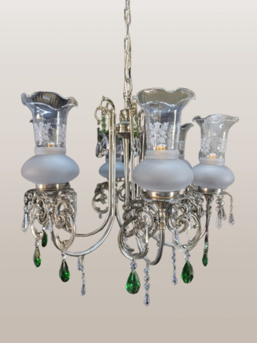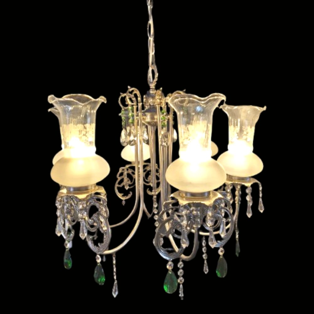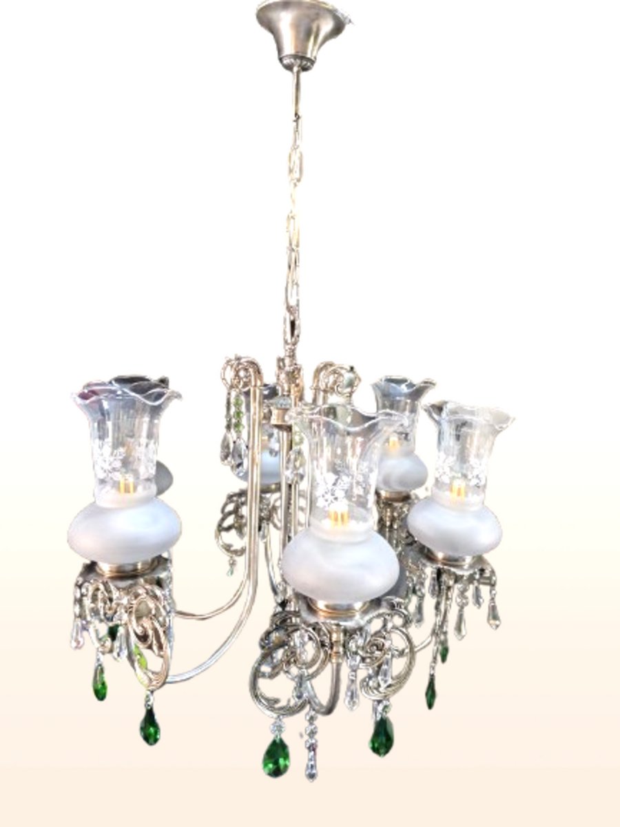 Exquisite Pendelleuchte im Stil eines Kronleuchters, ein wahres Meisterwerk an Eleganz und Raffinesse. Diese luxuriöse Leuchte wurde mit viel Liebe zum Detail gefertigt und ist ein fesselndes Stück für jeden Raum. Sie verfügt über eine silberne Oberfläche mit sechs Lichtern, tulpenförmigen Glasschirmen und Swarovski-Kristallperlen.
