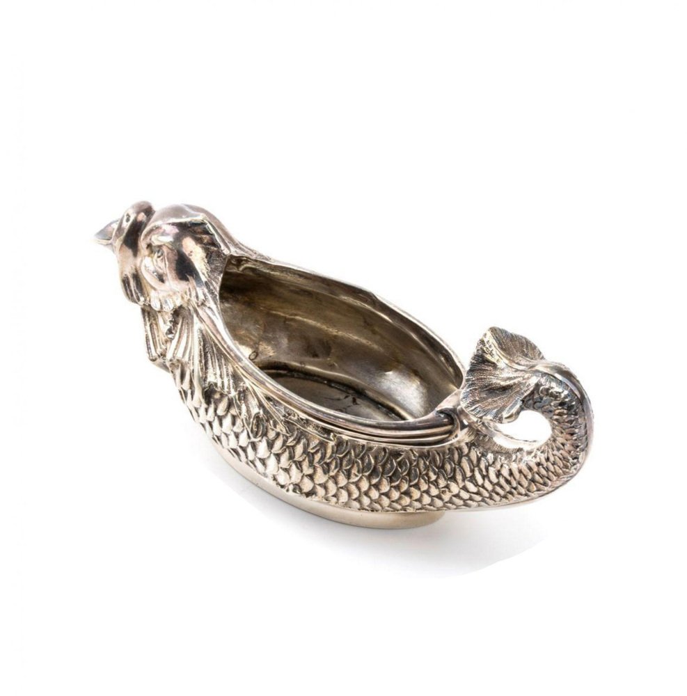 An exquisite milk jug from the famous jewelry house Tiffany & Co., made in the form of a fish with an elegant handle stylized as a tail. Produced between 1947 and 1965, this milk jug is a magnificent example of post-war American silver art. Its unique shape and graceful lines reflect the characteristic Tiffany style of that time, combining elements of Art Nouveau with an emphasis on natural motifs and neoclassical modernism, characteristic of the mid-20th century. On the bottom of the product is stamped the hallmark "TIFFANY & CO. MAKERS - STERLING" product number 711 corresponds to the period of manufacture of the model in 1856, indicating its authenticity and high quality of workmanship from 925 sterling silver. Dimensions: height 6.5 cm, width 13.3 cm, depth 5 cm. Weight: 156.7 g. This rare collectible will be a great addition to an antique collection or an exquisite element for table setting, emphasizing the prestigious style and bringing the authentic aesthetics of Tiffany & Co. to the interior.