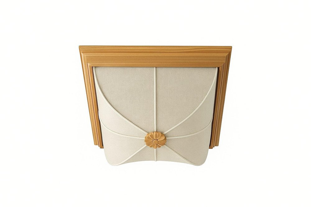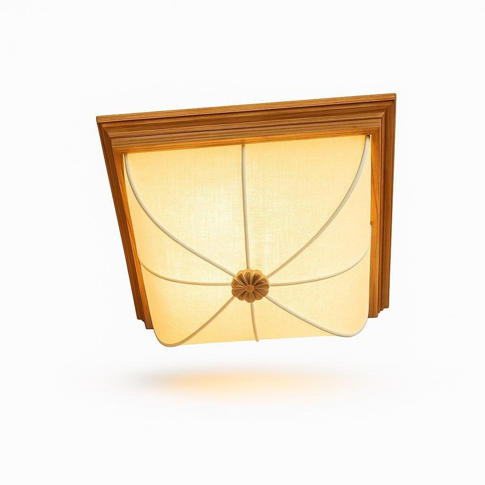 Scandinavian flush mount ceiling lamp from the 1960s, available individually (2 pieces in total). The lamp features a solid pine frame with warm, natural grain and a woven cotton fabric shade stretched over an internal wire structure. The fabric creates a soft, diffused light and a gentle sculptural silhouette, finished with a carved rosette detail at the center. When illuminated, the lamp emits a warm, ambient glow; when unlit, it retains a calm, understated presence. A refined example of Scandinavian mid-century design, emphasizing natural materials and quiet craftsmanship. Condition: Very good vintage condition. Small age-related marks on the woven fabric shade, consistent with natural use over time. These do not distract when installed. Details; Origin: Scandinavia Period: 1960s Materials: Solid pine frame, woven cotton fabric shade, internal wire armature