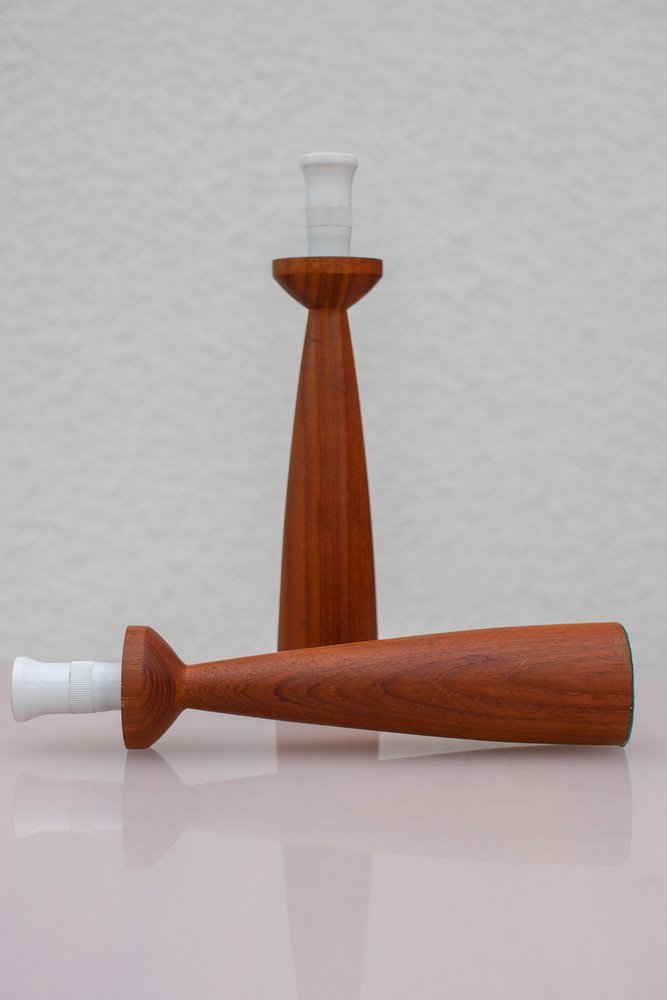 A pair of sleek and slender mid-century Scandinavian teak lamps, crafted in the 1960s by Möllers Armatur, Eskilstuna, Sweden. with their oblong turned form and classic proportions, these lamps embody understated elegance while serving as striking statement pieces of mid-century modern design. Their simplicity is enhanced by the warm tones and natural grain of the teak, making them both versatile and sophisticated additions to any interior.