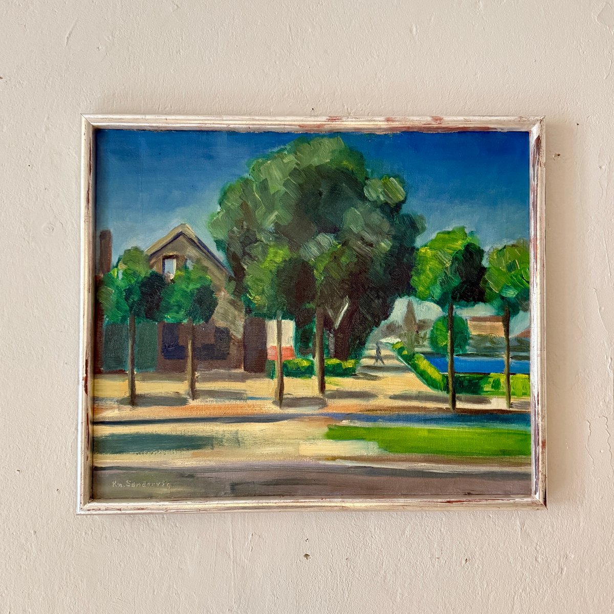 A vibrant Post-Impressionistic Scandinavian landscape oil painting, created around 1950, capturing the clarity of northern light and the harmony between architecture and nature. The composition presents a quiet street lined with trees, their foliage rendered in bold, expressive brushstrokes of green against a luminous blue sky. The artist employs a vivid yet balanced palette, using broad strokes and softened contours to convey atmosphere rather than strict detail, in keeping with Post-Impressionist traditions. Hints of houses and water in the background suggest a serene suburban or village setting, evoking both structure and calm. The textured surface and painterly technique emphasize movement and vitality, bringing the scene to life. Framed in a silvered wooden frame, this work reflects the timeless beauty of mid-20th century Scandinavian art.