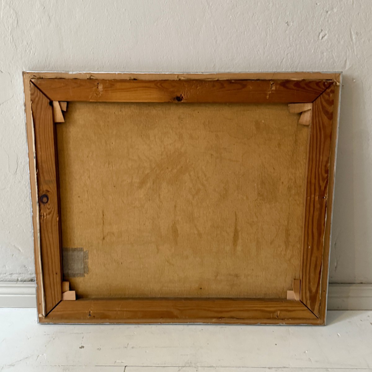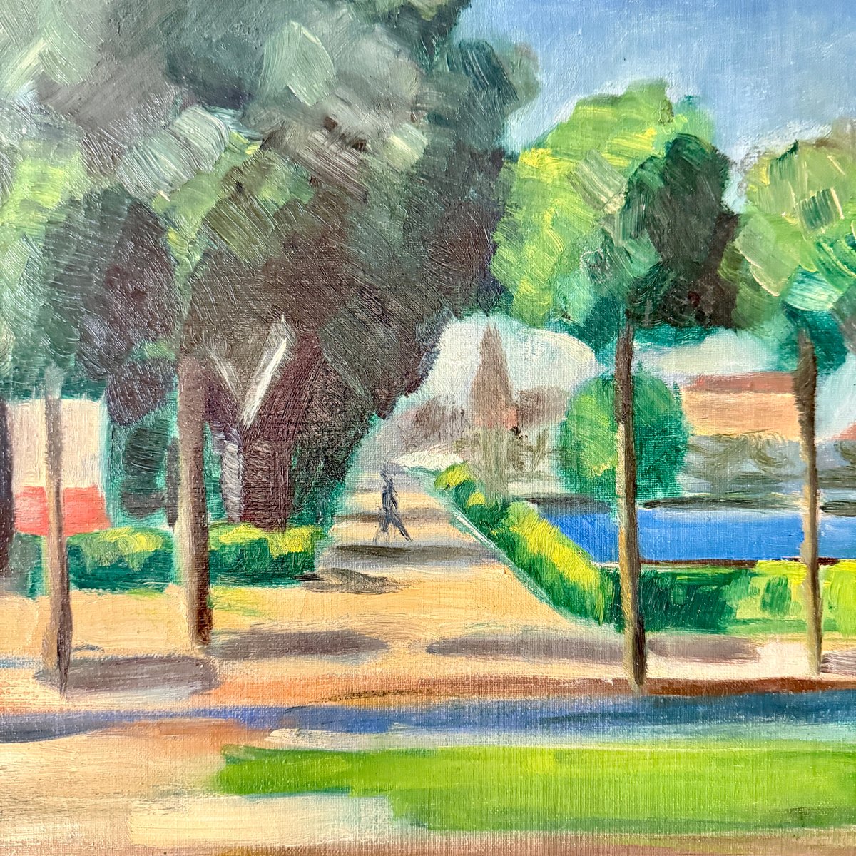 Ein lebhaftes postimpressionistisches skandinavisches Landschaftsölgemälde, das um 1950 entstand und die Klarheit des nördlichen Lichts und die Harmonie zwischen Architektur und Natur einfängt. Die Komposition zeigt eine ruhige, von Bäumen gesäumte Straße, deren Laub sich mit kräftigen, ausdrucksstarken Pinselstrichen in Grün vor einem strahlend blauen Himmel abzeichnet. Der Künstler verwendet eine lebendige, aber ausgewogene Palette, die mit breiten Pinselstrichen und weichen Konturen eher Atmosphäre als strenge Details vermittelt, ganz in der Tradition des Postimpressionismus. Andeutungen von Häusern und Wasser im Hintergrund suggerieren eine heitere Vorstadt- oder Dorfumgebung, die sowohl Struktur als auch Ruhe evoziert. Die strukturierte Oberfläche und die malerische Technik betonen Bewegung und Vitalität und erwecken die Szene zum Leben. Eingerahmt in einen versilberten Holzrahmen, spiegelt dieses Werk die zeitlose Schönheit der skandinavischen Kunst aus der Mitte des 20.