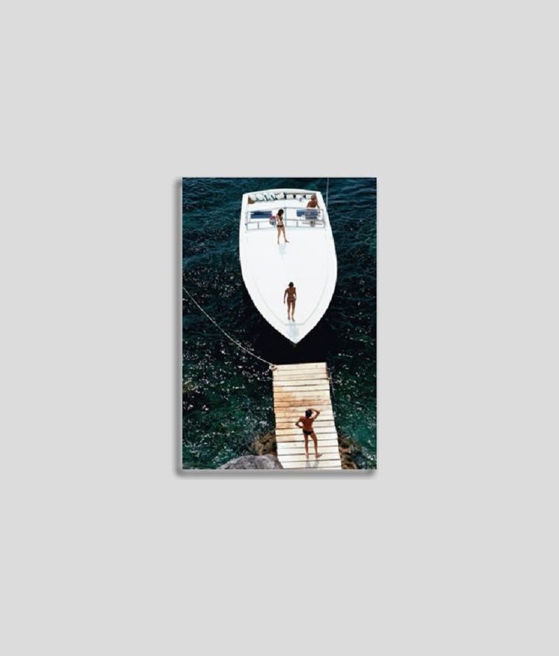 Slim Aarons, Speedboot Landing, Druck auf Papier, gerahmt
