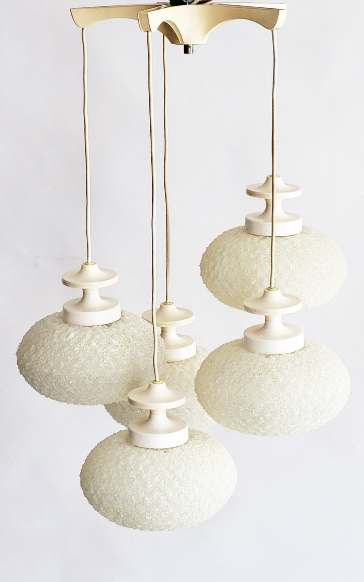 A classic, glamorous retro-futurist Space Age Design from the 1960s: five cascading moon-like spheres that give off a soft warm glow. Good vintage condition, patina and minor surface wear. Fully functioning.