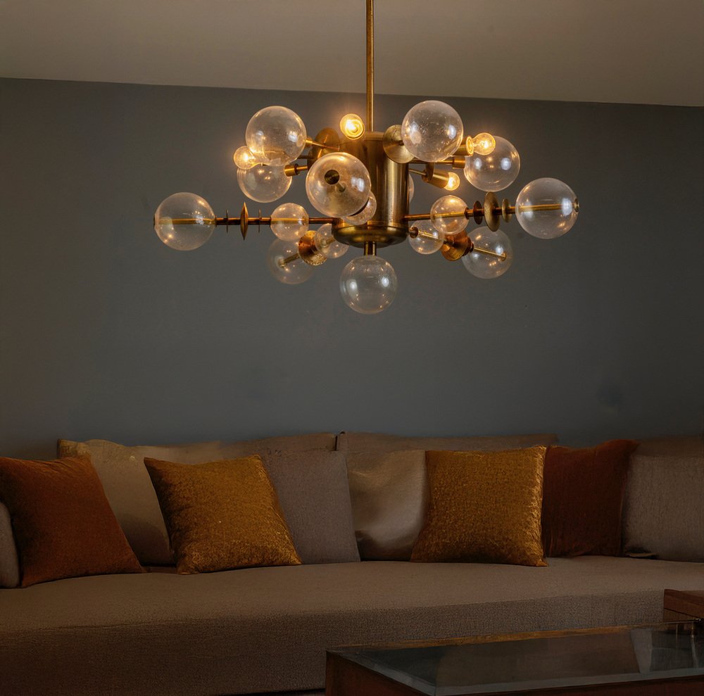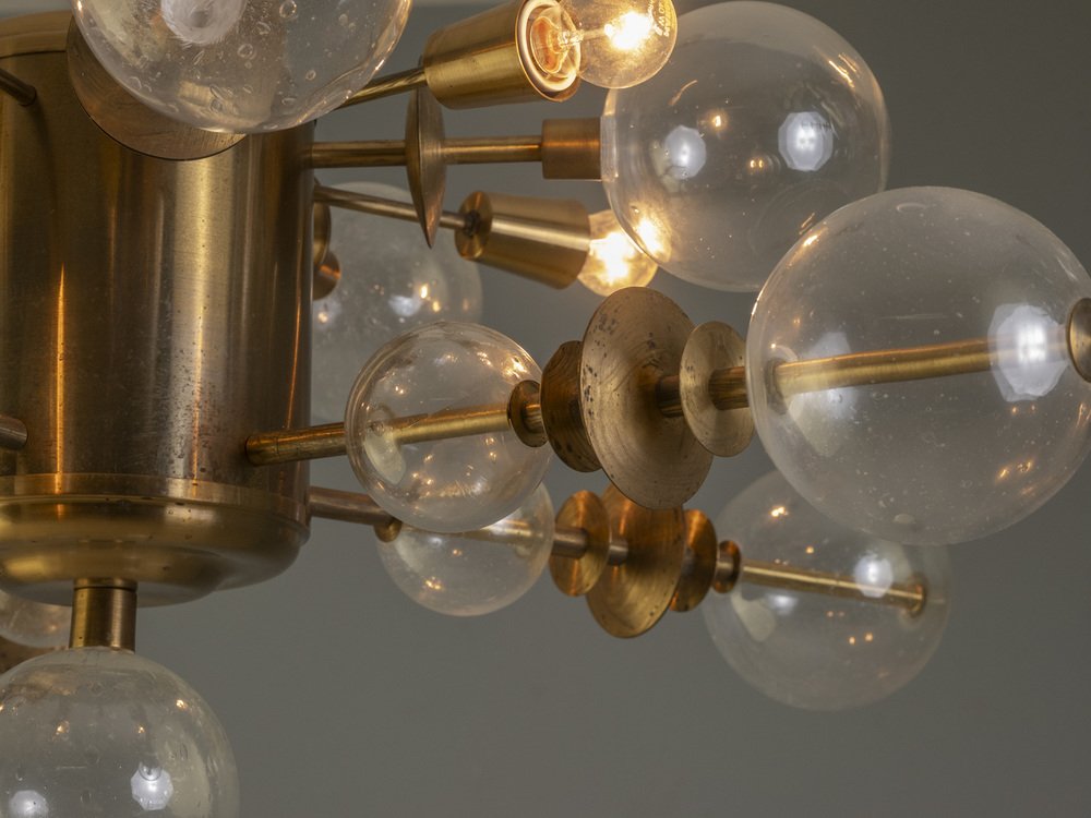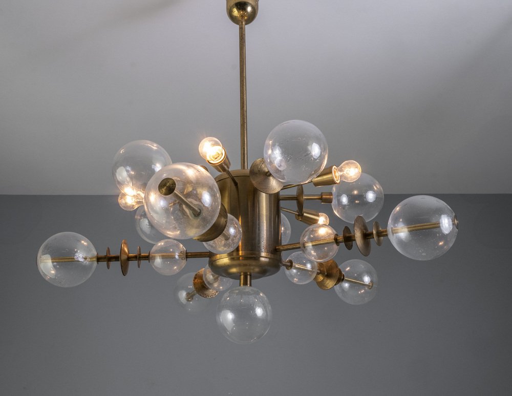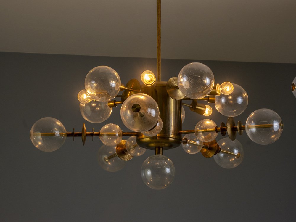 This brass and glass chandelier, produced in Czechoslovakia around the 1970s, exemplifies the Space Age aesthetic that dominated European lighting design of the period. Its radial composition of spherical glass shades and brass fittings recalls the form of an atomic model — a signature motif of mid-century modern futurism.