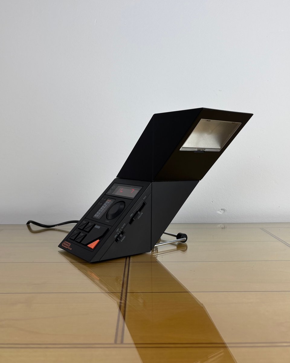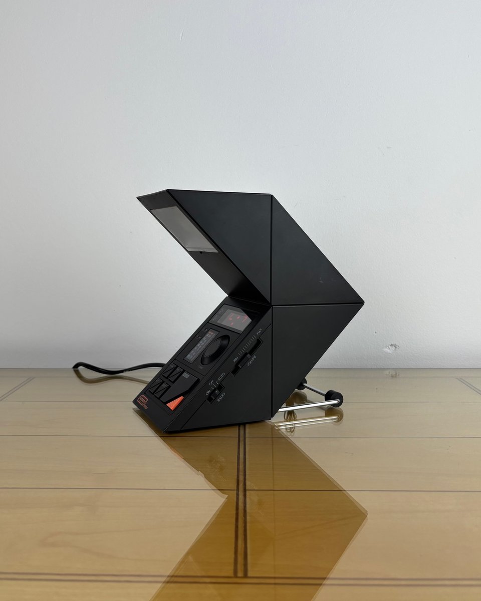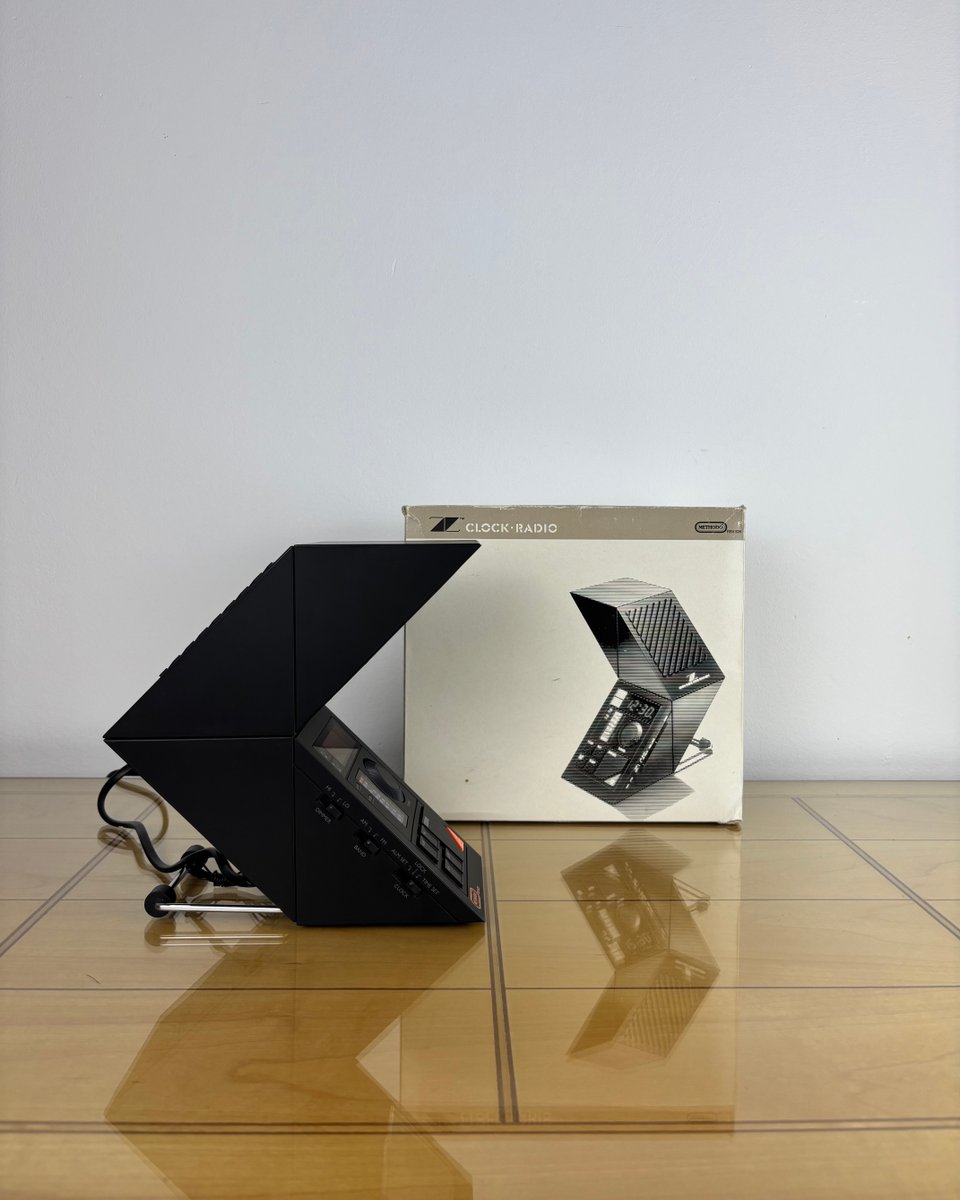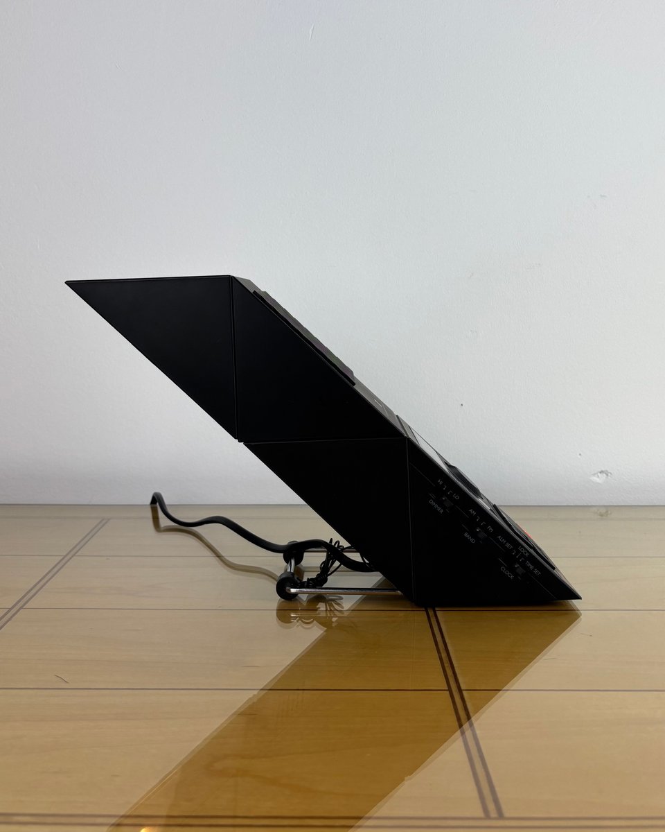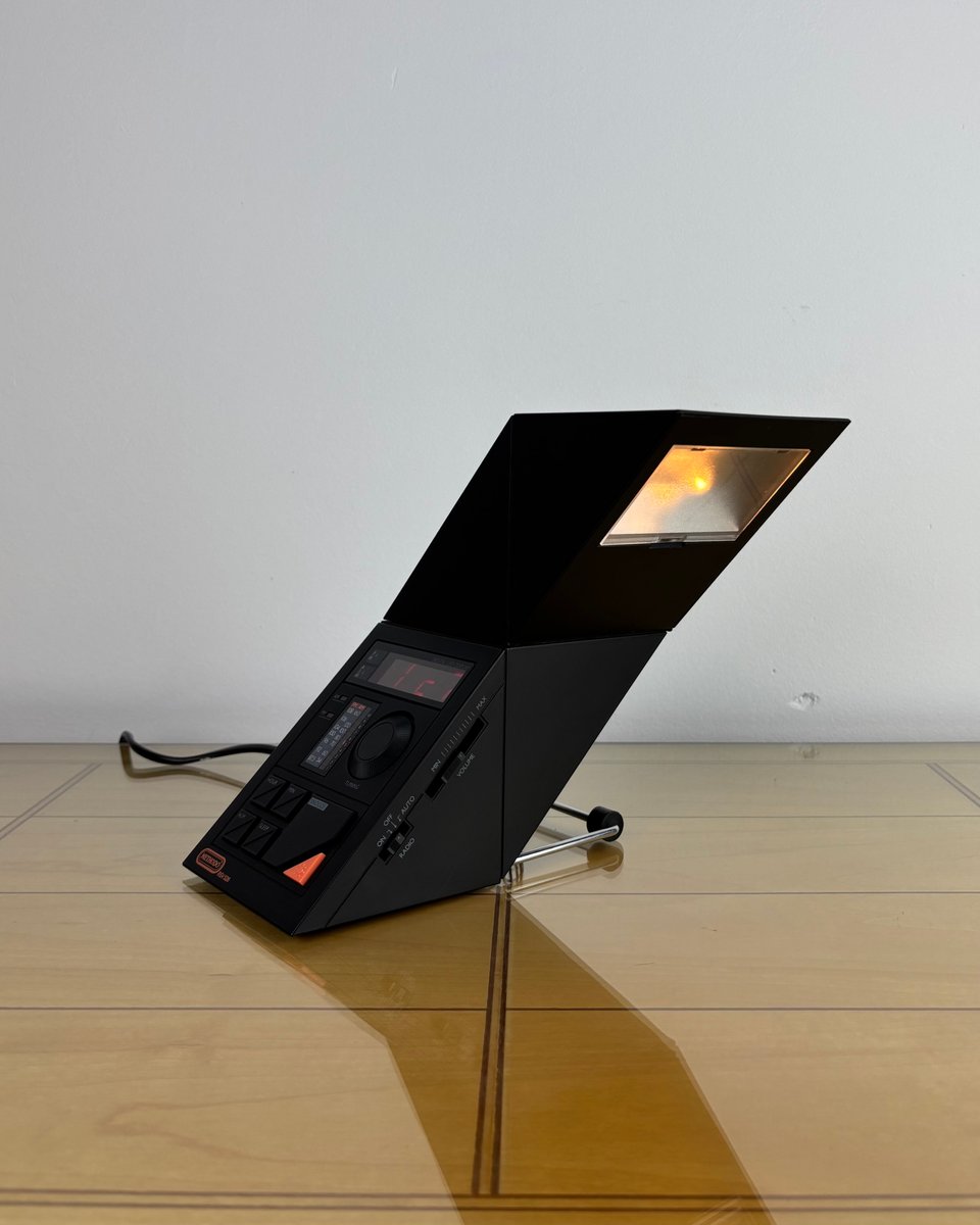 Brand and design: Methodo marketed this sculptural device to the Italian / European market, drawing on contemporary Italian design’s love of sharp geometry and multifunction domestic objects in plastic; the dramatic geometric profile, slatted speaker, and integrated lamp make it a standout among period LED bedside radios. A rare piece that doubles as functional design and conversation object on a nightstand or desk.