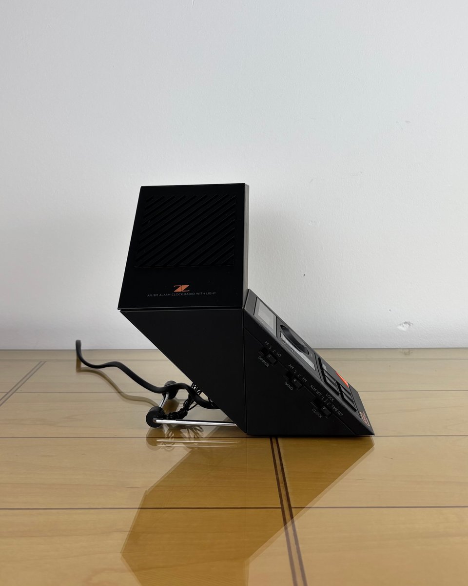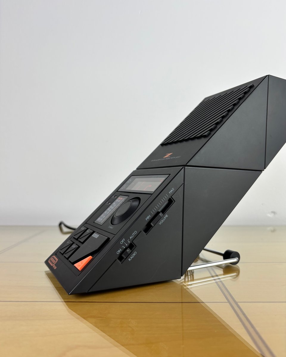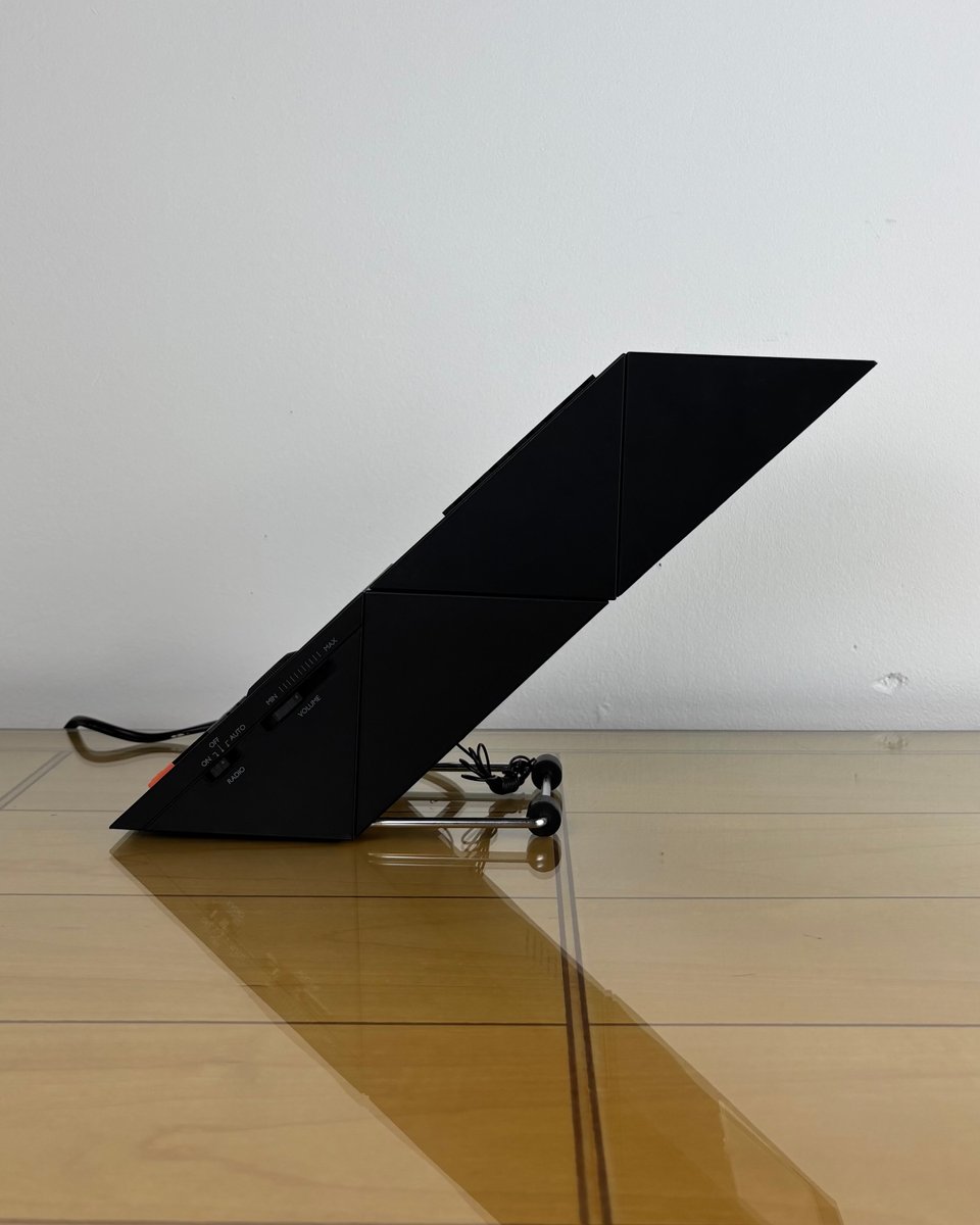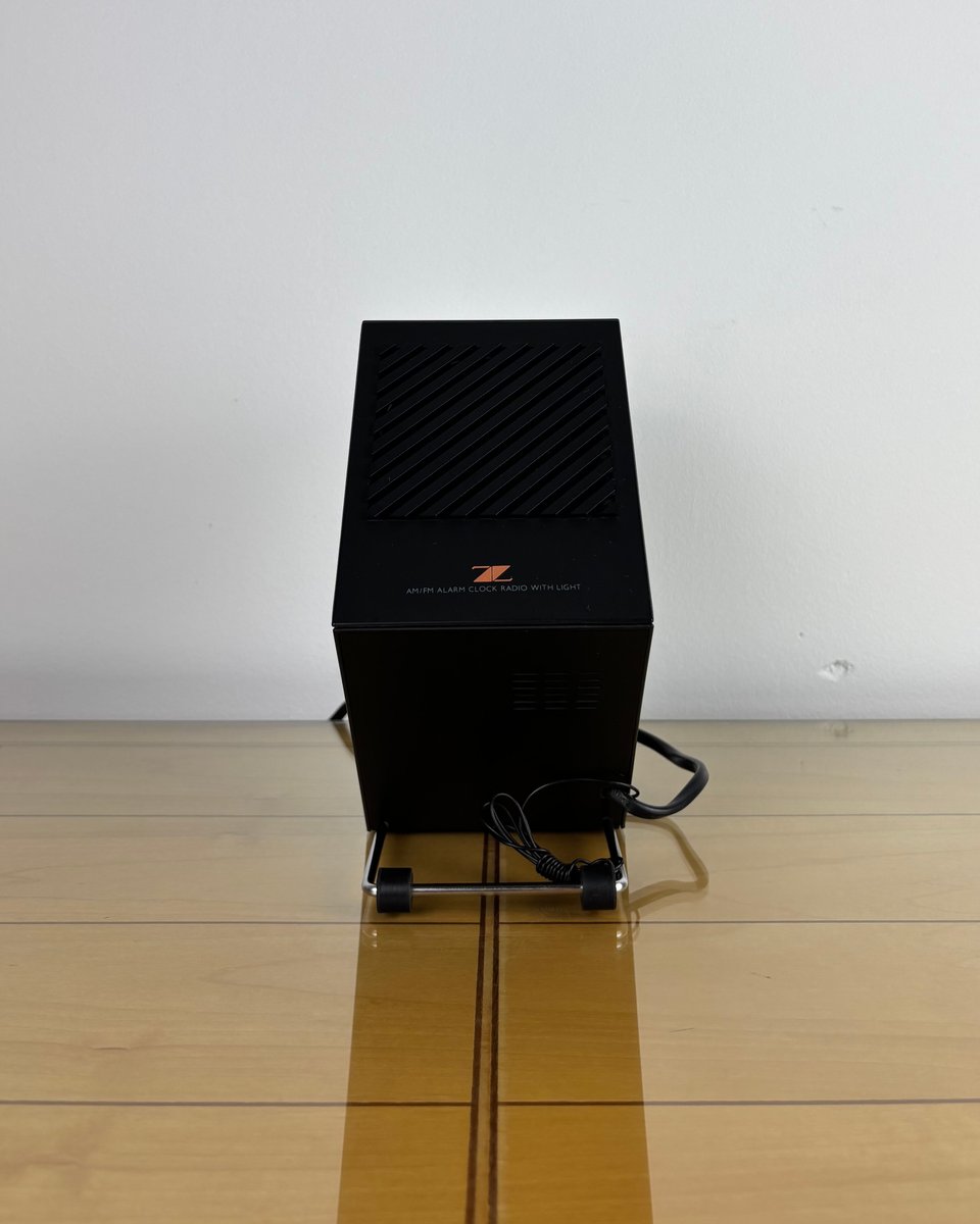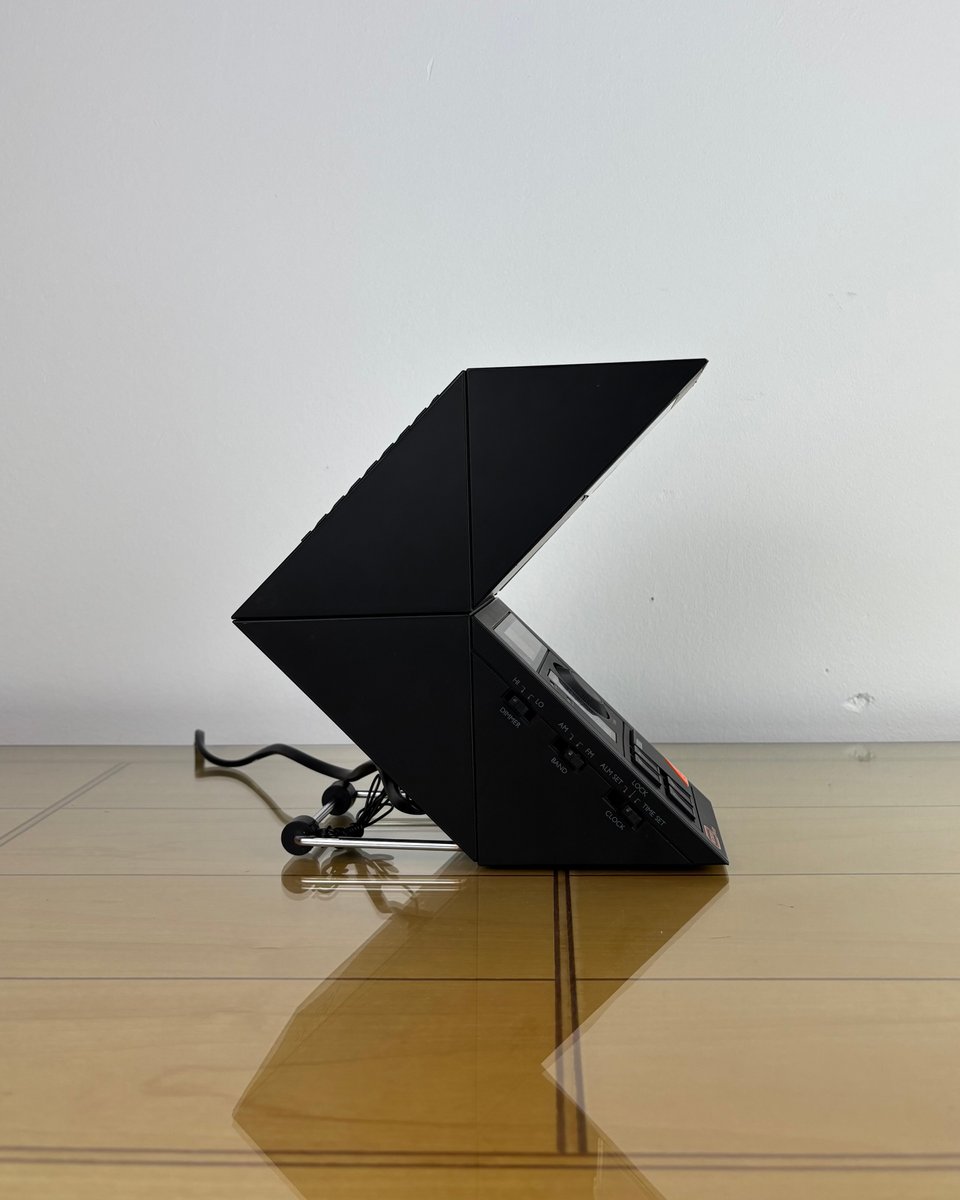 Brand and design: Methodo marketed this sculptural device to the Italian / European market, drawing on contemporary Italian design’s love of sharp geometry and multifunction domestic objects in plastic; the dramatic geometric profile, slatted speaker, and integrated lamp make it a standout among period LED bedside radios. A rare piece that doubles as functional design and conversation object on a nightstand or desk.