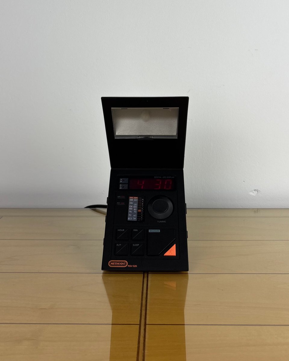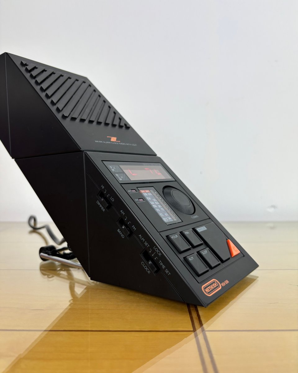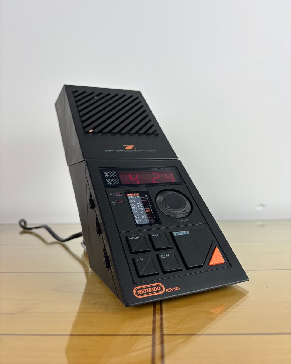 Seltener Radiowecker Methodo "Z" RSV S26 aus den späten 1970er Jahren mit integriertem Nachtlicht, der eine rote LED-Digitaluhr, einen analogen AM/FM-Tuner und einen leistungsstarken oberen Lautsprecher in einem kantigen, geometrisch geformten Gehäuse vereint. Die orangefarbene Taste in der Ecke schaltet die eingebaute Lampe ein, um im Bett zu lesen oder die Umgebung zu beleuchten, während große, fühlbare Tasten die Zeiteinstellung, den Alarm, die Schlummerfunktion und die Schlaffunktion steuern.