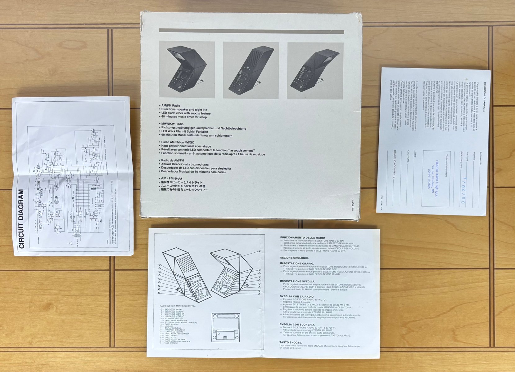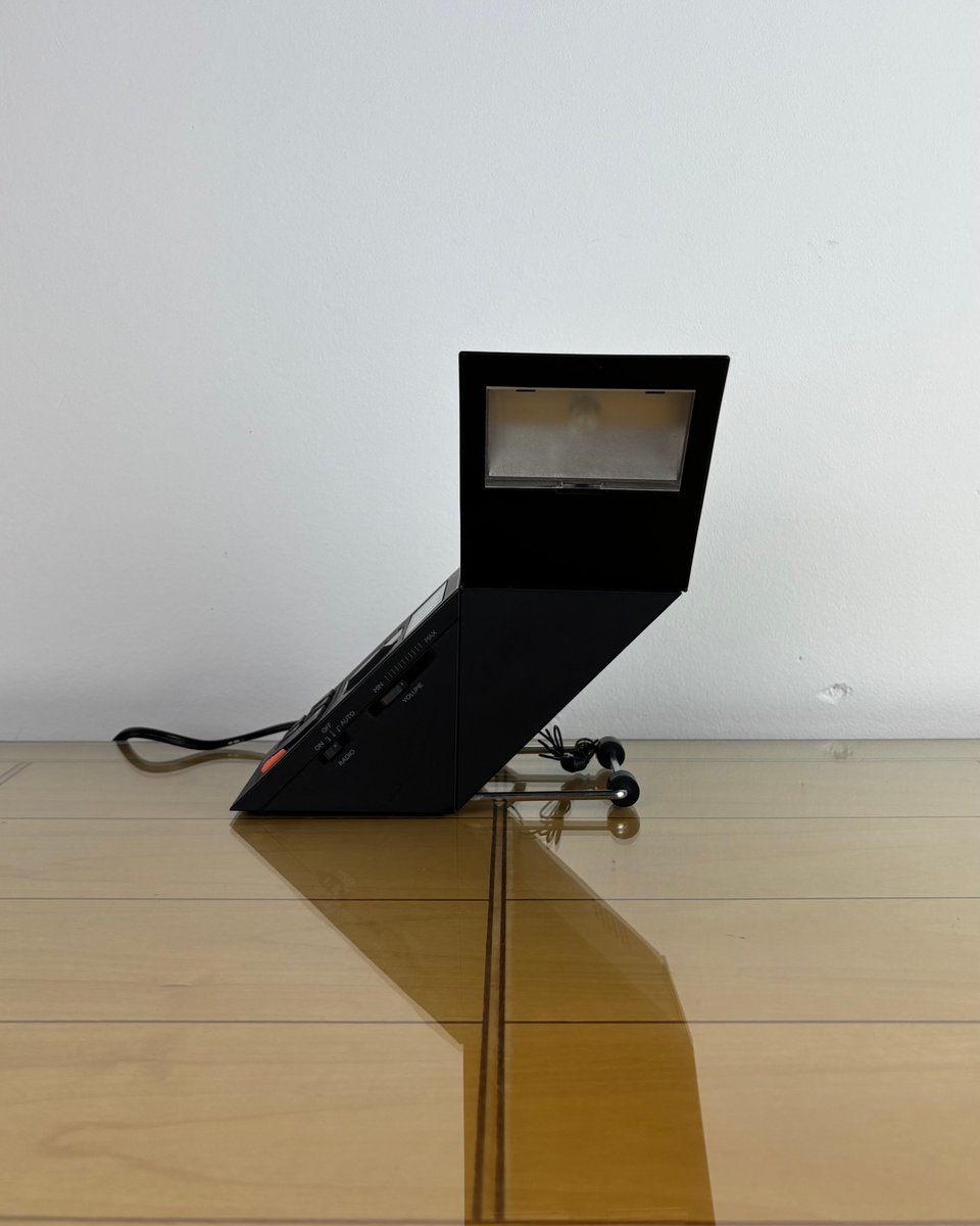 Marke und Design: Methodo vermarktete dieses skulpturale Gerät auf dem italienischen/europäischen Markt und griff dabei die Vorliebe des zeitgenössischen italienischen Designs für scharfe Geometrie und multifunktionale Haushaltsgegenstände aus Kunststoff auf. Das dramatische geometrische Profil, der mit Lamellen versehene Lautsprecher und die integrierte Lampe machen es zu einem herausragenden Stück unter den LED-Nachttischradios dieser Zeit. Ein seltenes Stück, das auf einem Nachttisch oder Schreibtisch auch als funktionales Design- und Konversationsobjekt dienen kann.