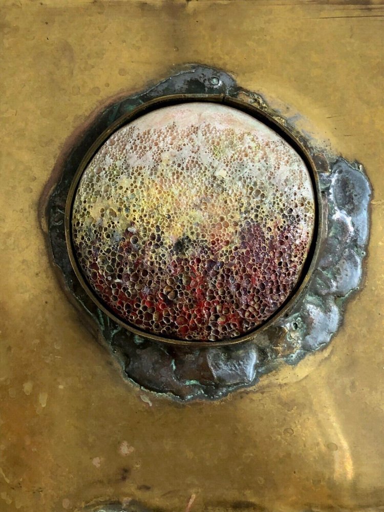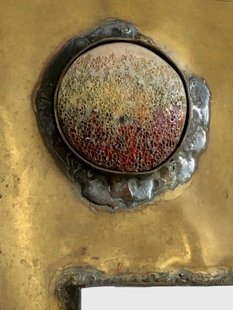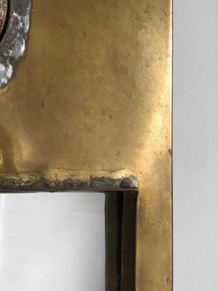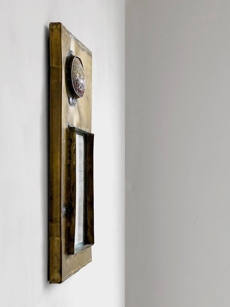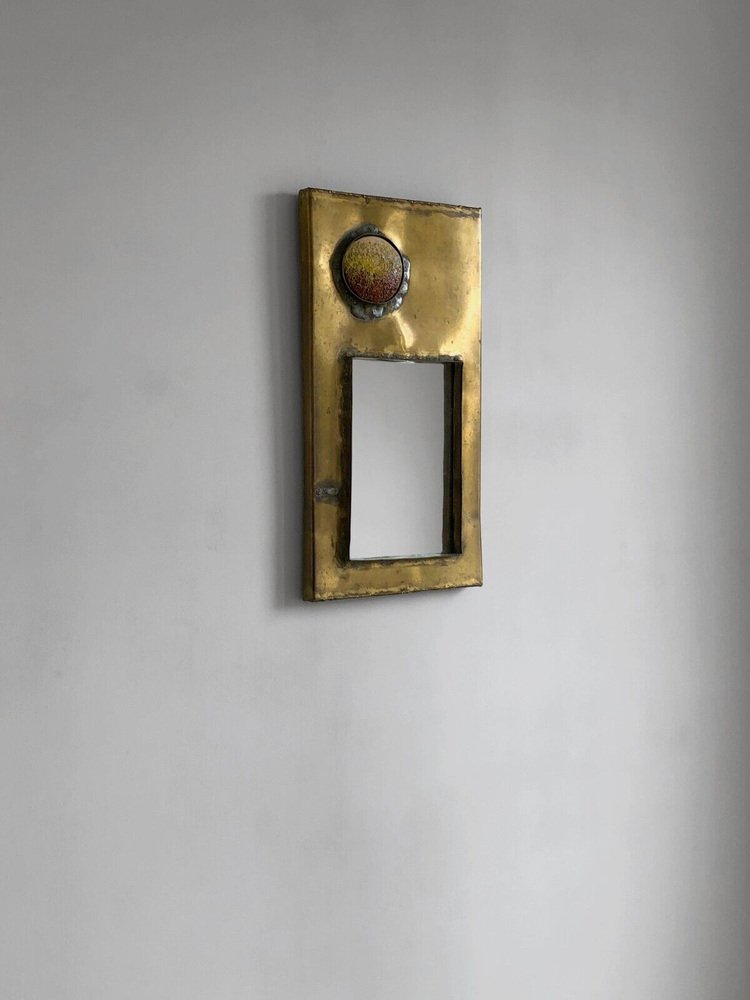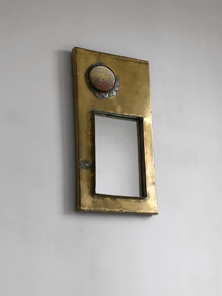 This wall work which is similar to a bas-relief is characterized by the rigor of its composition, geometric and quasi-architectural, counterbalanced by the quality as raw as organic-and however very precise-of its finishes (lumpy lumps and golden on the rectangular perimeter of the bronze/golden brass frame, metal welds becoming asymmetrical graphic elements around inserts, and finally, this circular and porous ceramics with multiple colors, of great finesse, which evokes a cell, an organ stylized or a stylized star ...). These elements, iron and ceramics, in apparent fusion, bring a cosmic, even esoteric dimension, to this mirror.