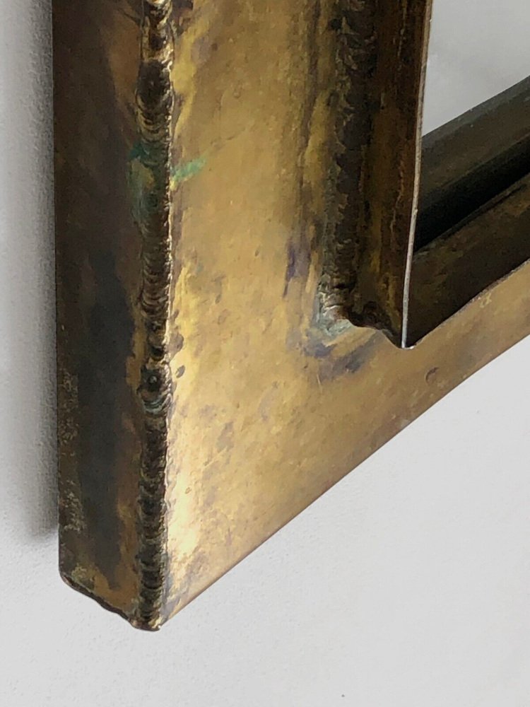 An exceptional mirror-mural (e) rectangular and asymmetrical, brutalist, shabby-chic, large vertical rectangular frame in bronze or patinated brass, with 2 united asymmetrical inserts arranged in secondary frames: