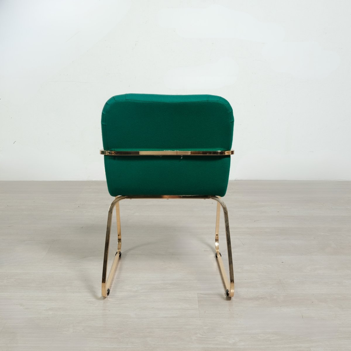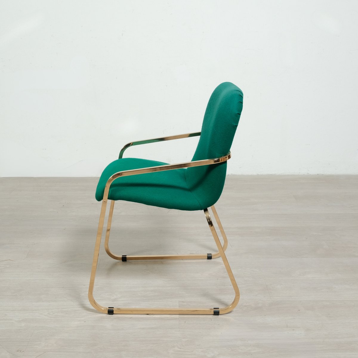 sitz und Rückenlehne mit grünem Stoff bezogen.