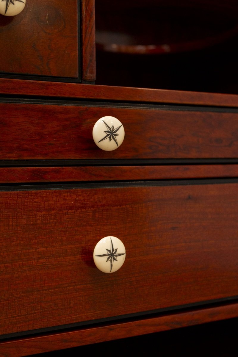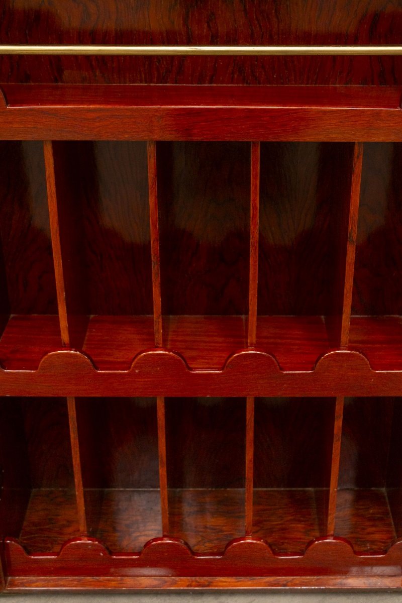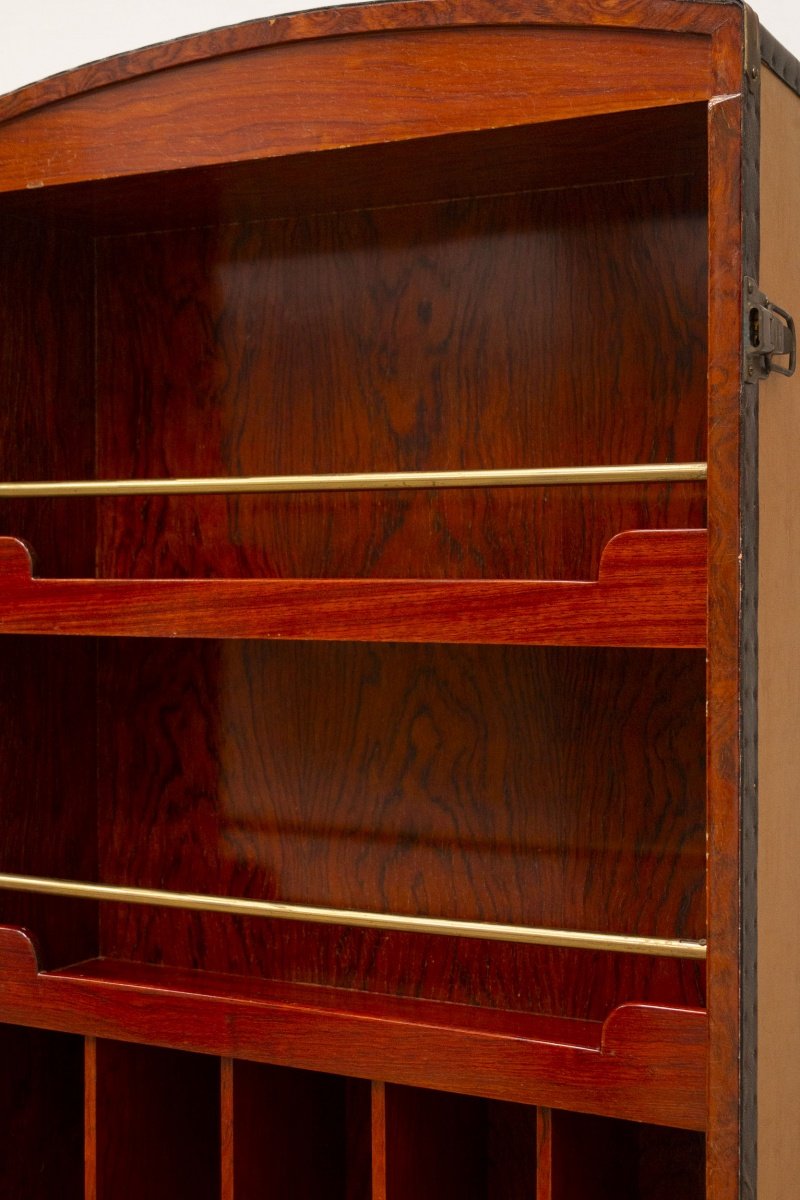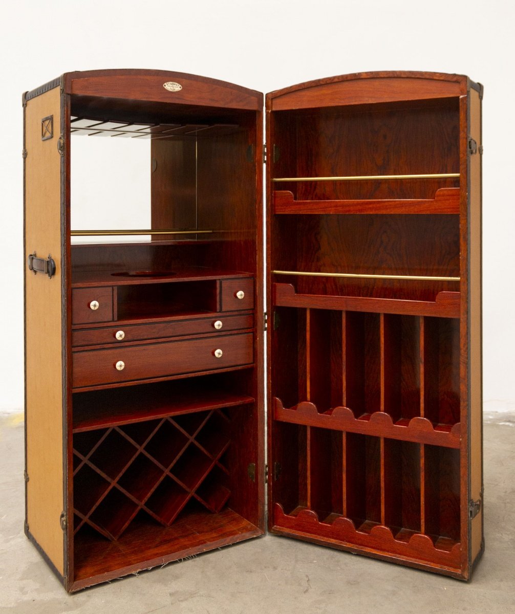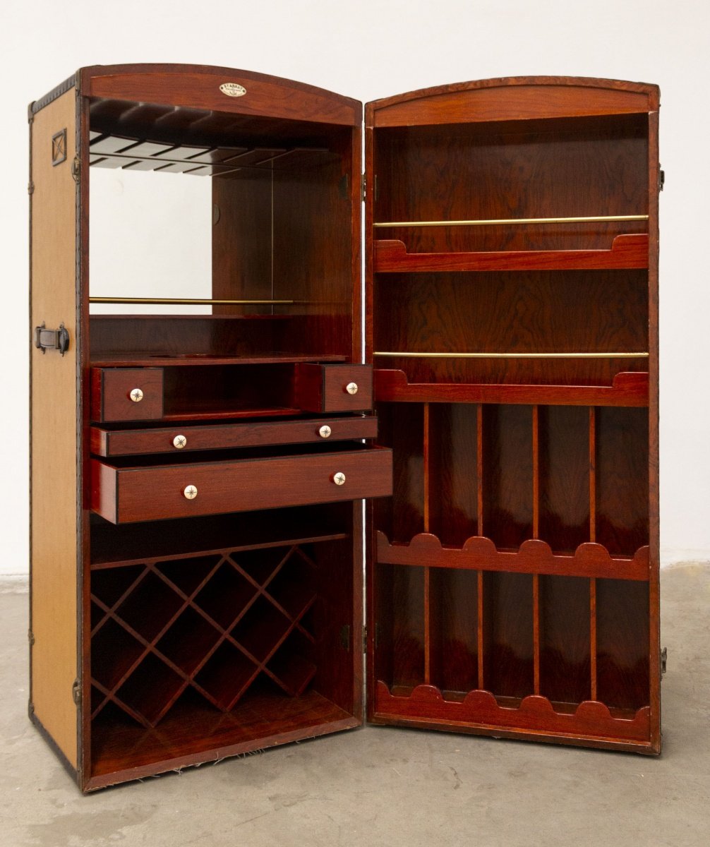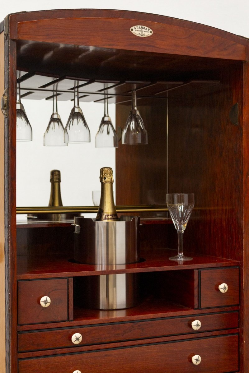 Das Innere ist aus massivem Mahagoni und mahagonifurniertem Marinesperrholz gefertigt. Die luxuriöse Ausstattung umfasst vier Schubladen für Accessoires, ein horizontales Flaschenregal, ein doppeltes vertikales Flaschenregal mit Anschlagleiste, einen hängenden Glashalter, ein Kühlfach mit Spiegel auf der Rückseite und ein Regal.