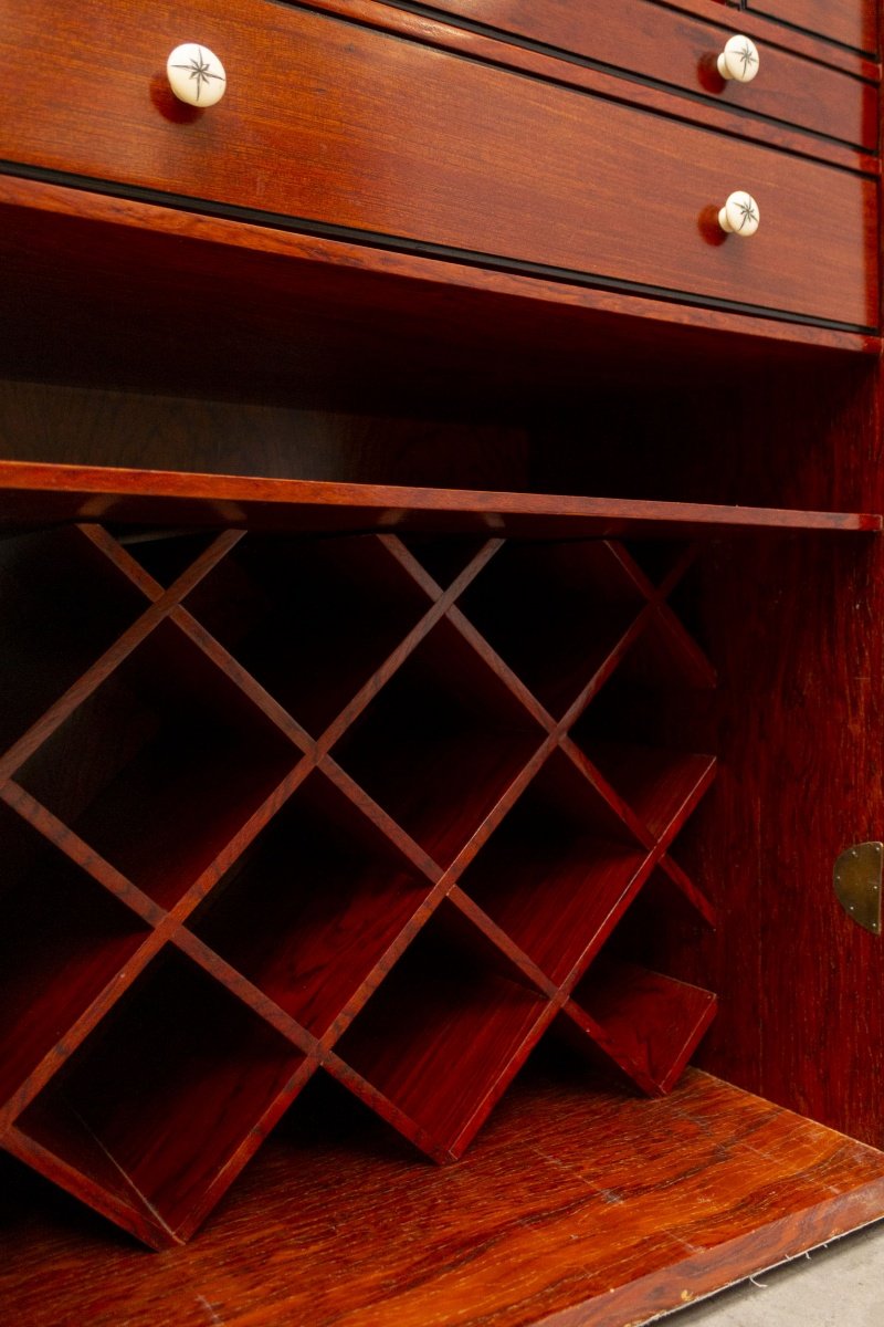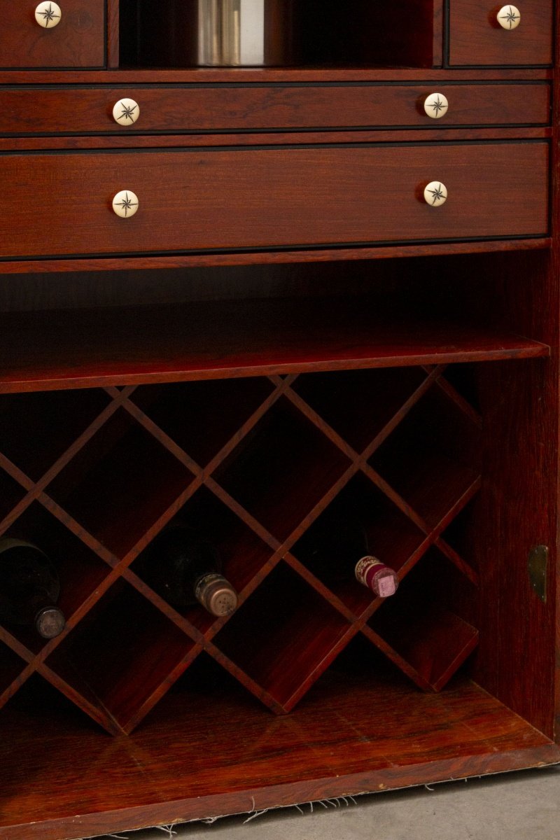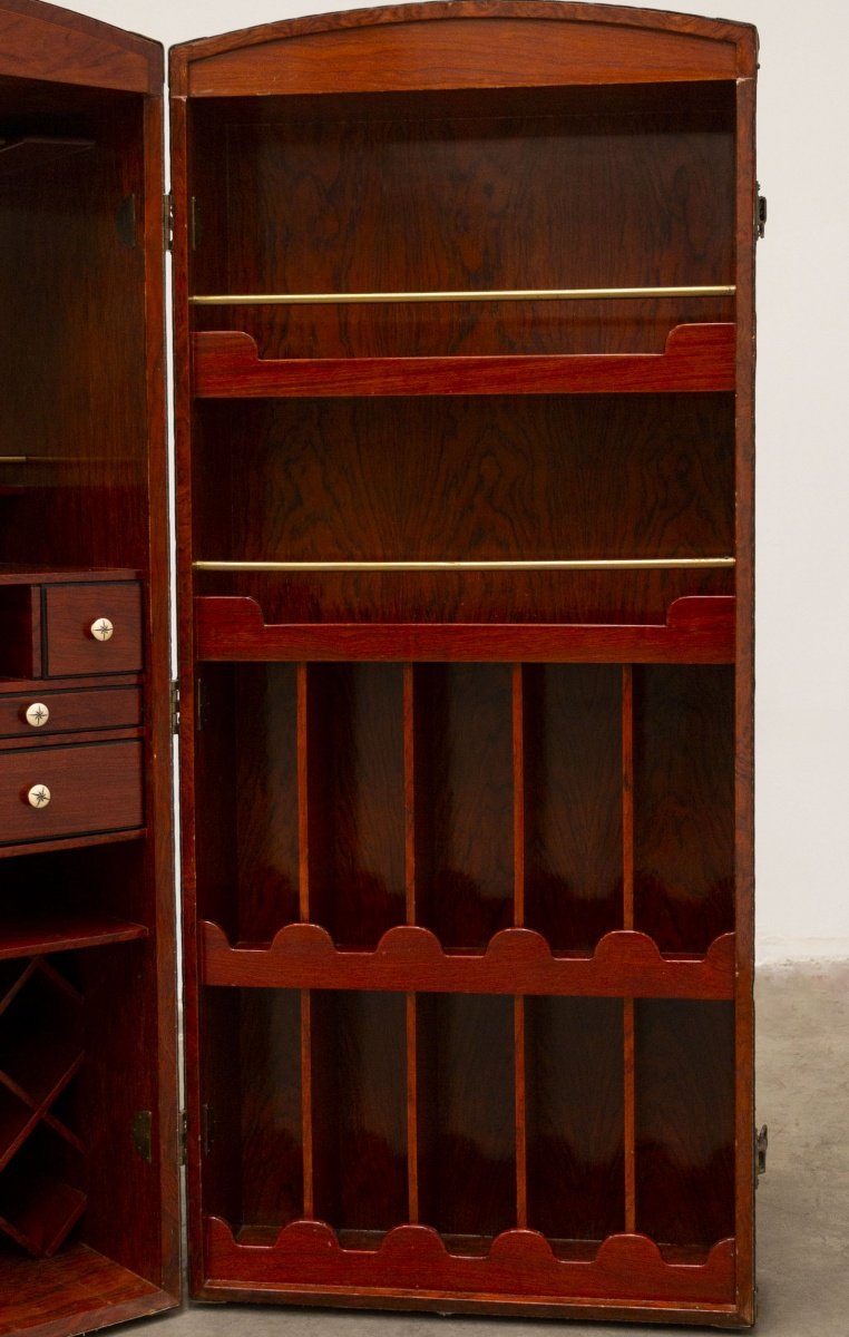 The interior is made of solid mahogany and mahogany-veneered marine plywood. It features luxurious furnishings, including four drawers for accessories, a horizontal bottle rack, a double vertical bottle rack with a stop bar, a suspended glass holder, a cooler compartment with a mirror at the back, and a shelf.
