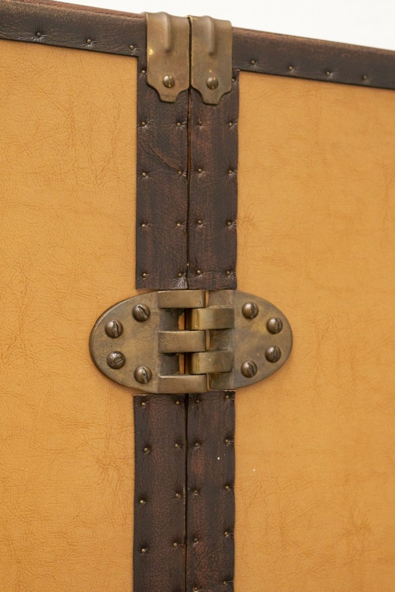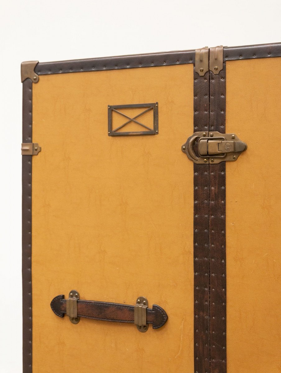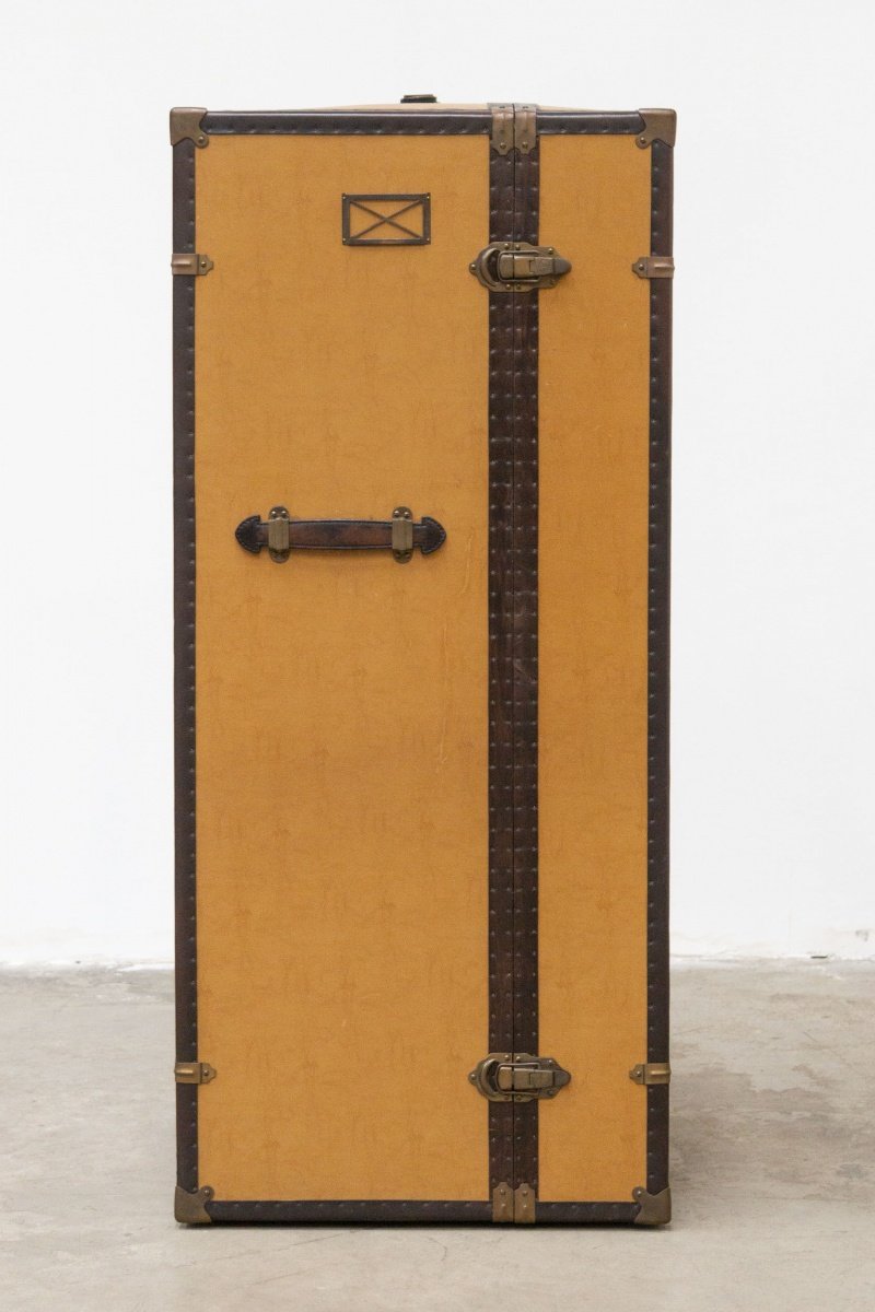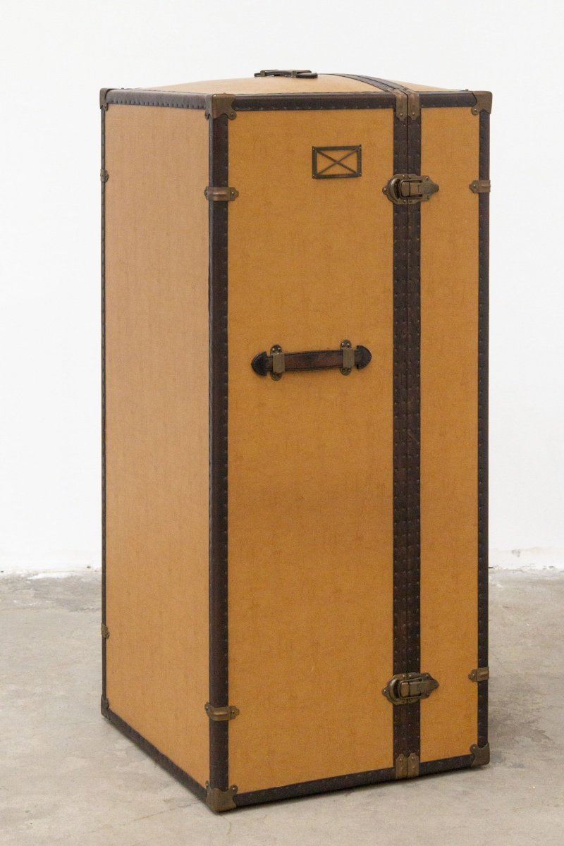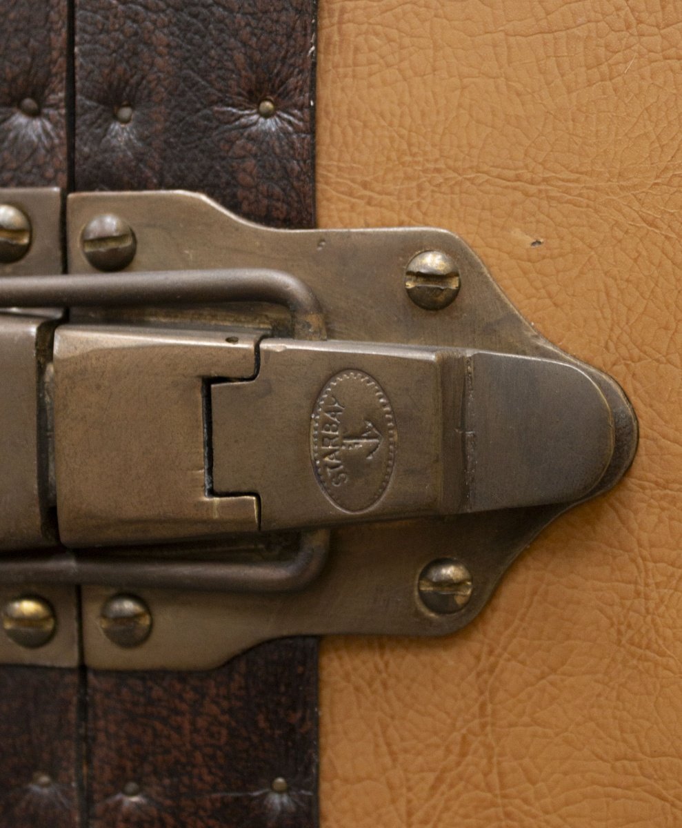 Das Äußere ist mit Leder gepolstert, die Griffe sind aus Leder, die Schlösser und andere Metallteile sind aus Messing.