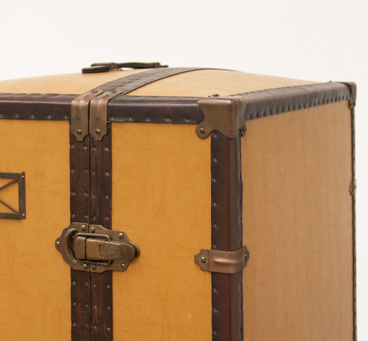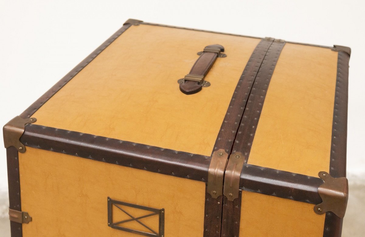 Das Design dieser aus edlen Materialien gefertigten Truhe erinnert an den Charme der exklusivsten Reisetruhen vergangener Epochen.