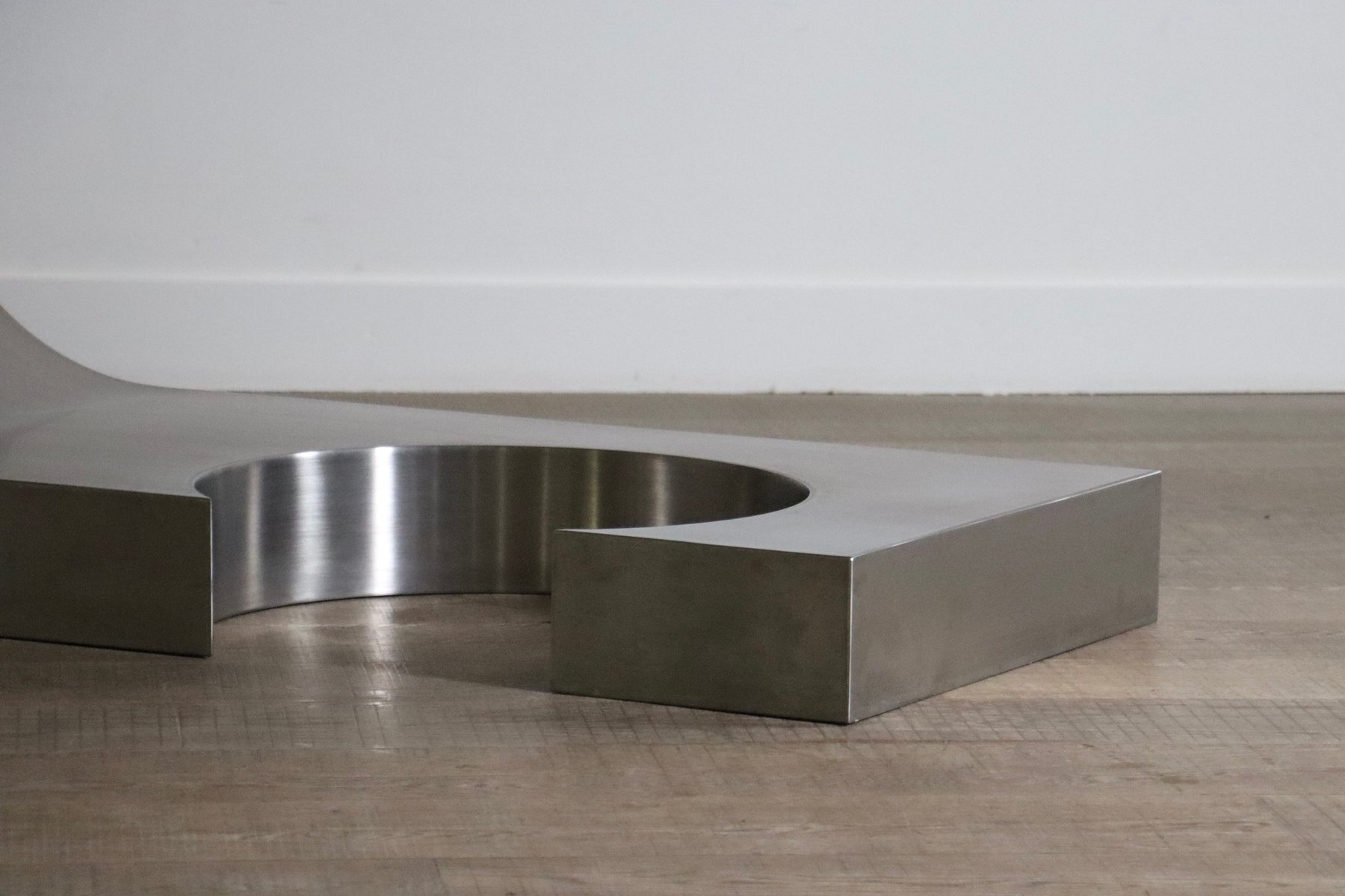 Der Diapason-Schreibtisch aus Edelstahl von Marzio Cecchi für Studio Most Firenze, 1970er Jahre. Sein schlankes Design zeichnet sich durch eine ausladende, spitz zulaufende Platte mit einer geschwungenen Kante aus, die durch einen einzigartigen, kreisförmigen Ausschnitt im Sockel ergänzt wird - ideal, um die Füße bequem abzustellen. Der Schreibtisch ist aus dickem Edelstahl gefertigt und vollständig geschlossen, was ihn zu einem auffälligen Stück funktionaler Kunst macht.