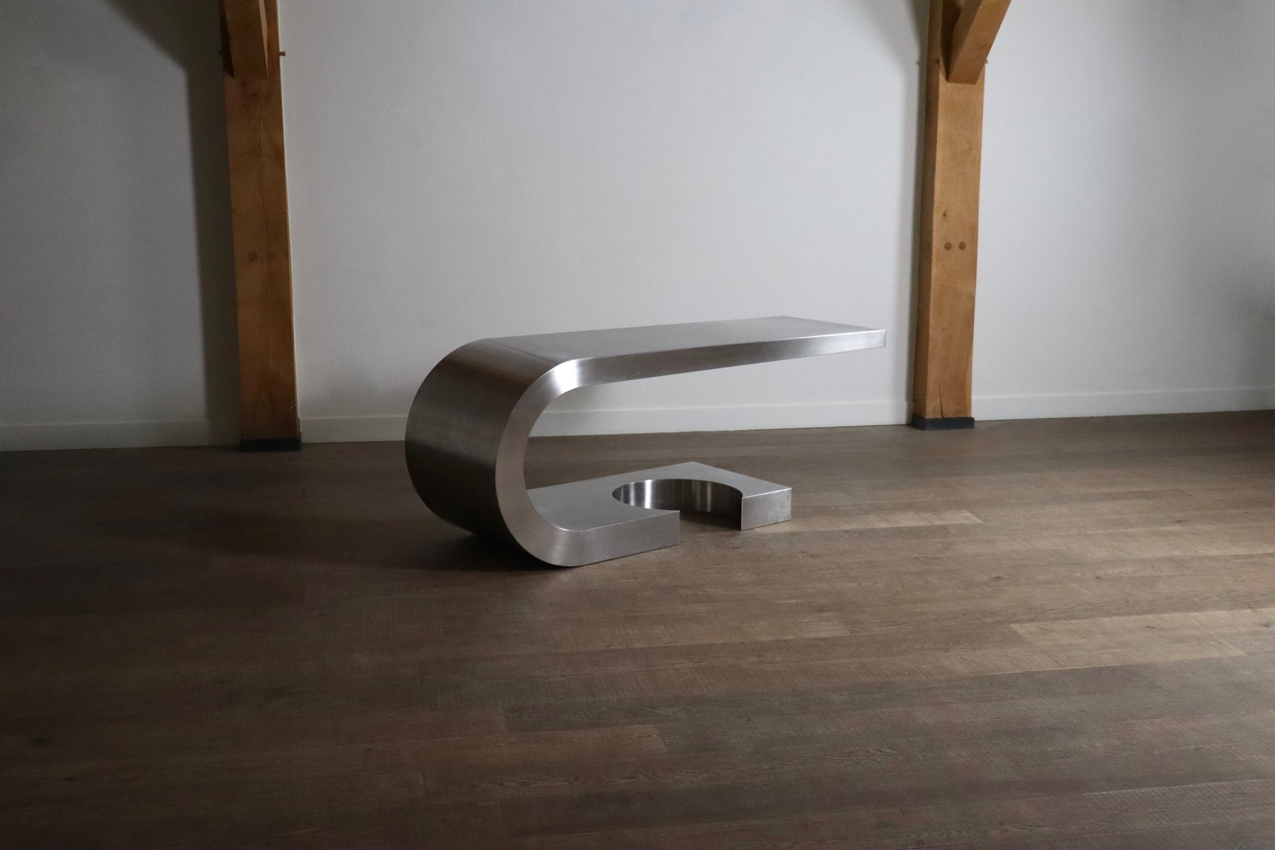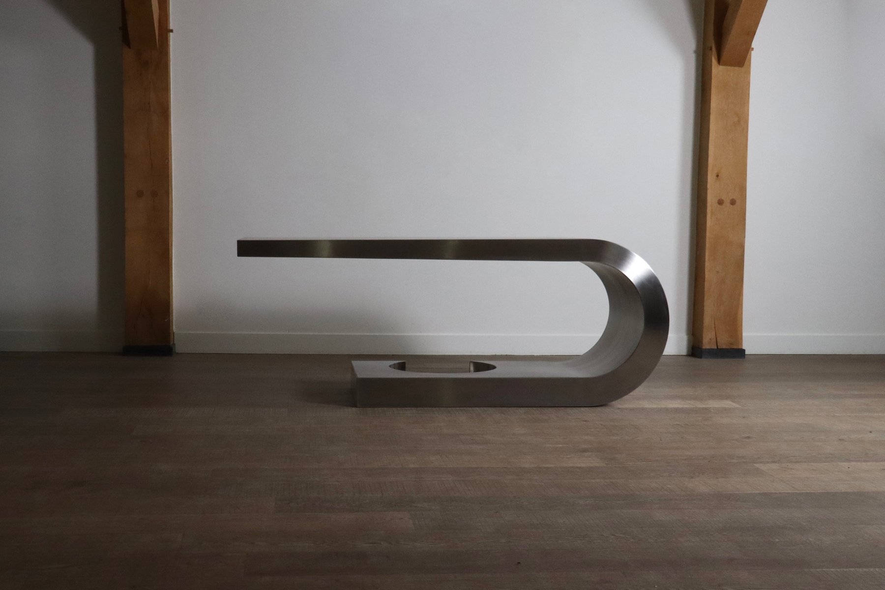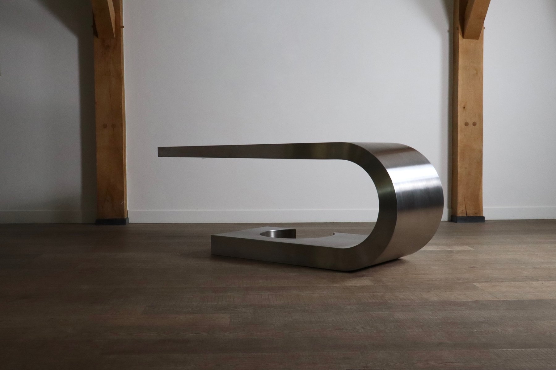 The Diapason Desk in stainless steel by Marzio Cecchi for Studio Most Firenze, 1970s. Its sleek design features a cantilevered tapering top with a curved edge, complemented by a unique circular cut-out base, ideal for comfortably resting your feet. The desk is constructed from thick stainless steel and fully enclosed, making it a striking piece of functional art.