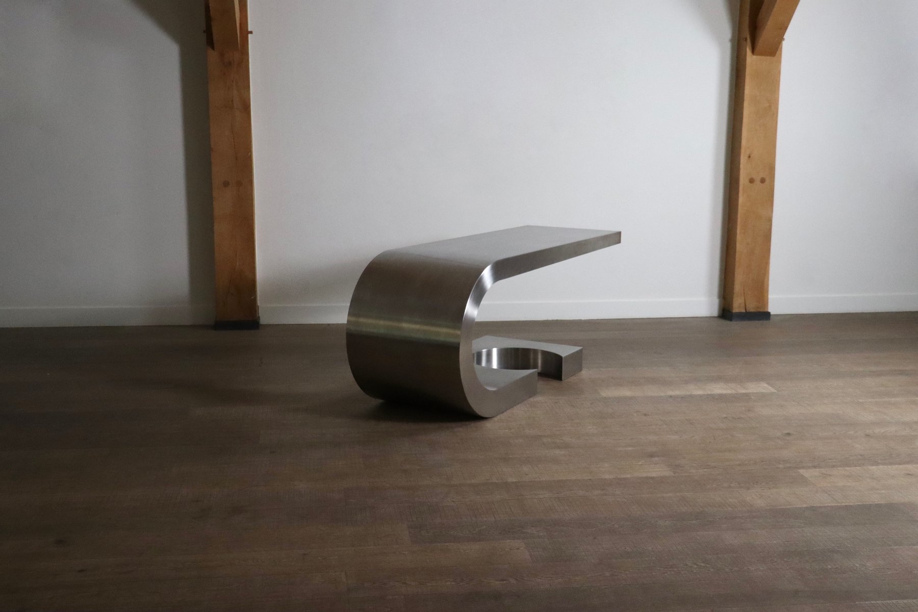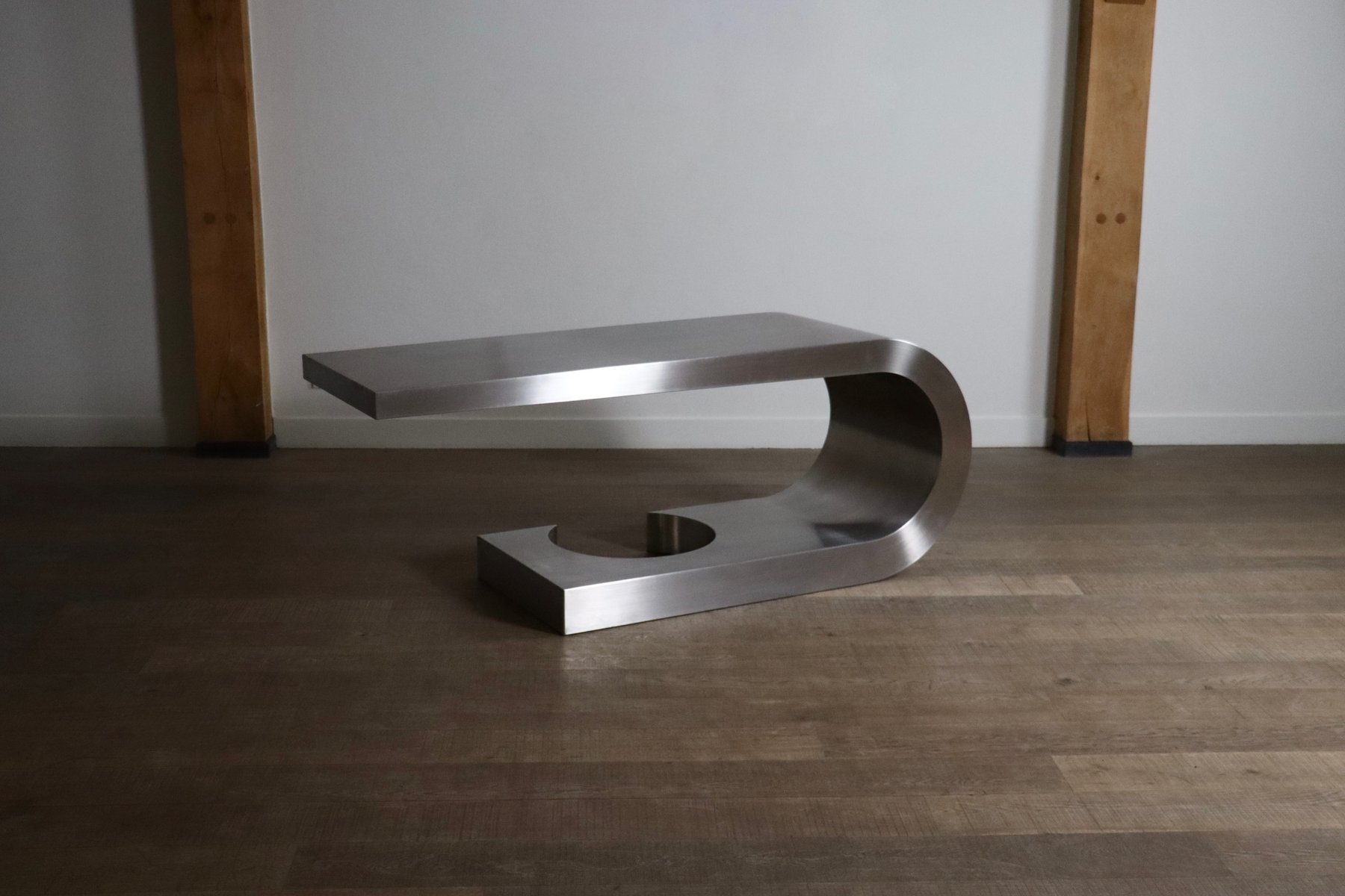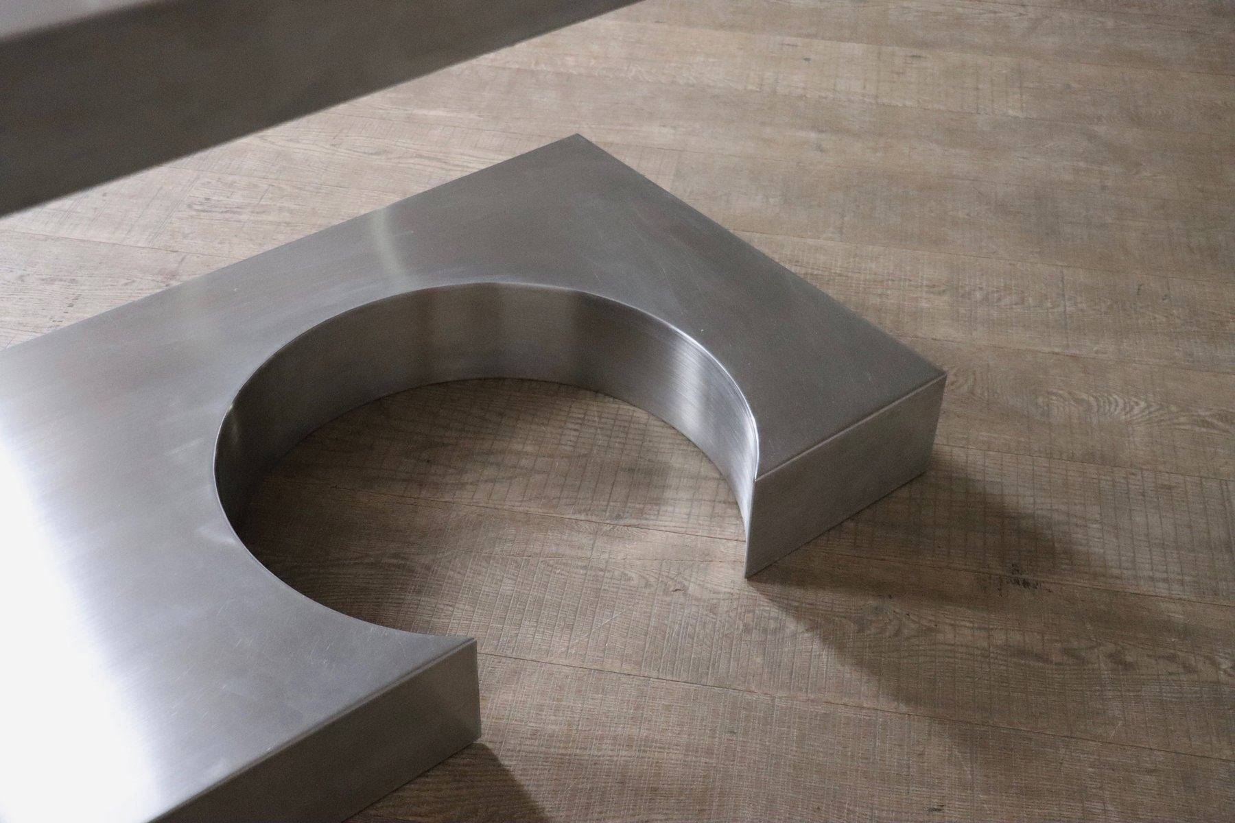 The Diapason Desk in stainless steel by Marzio Cecchi for Studio Most Firenze, 1970s. Its sleek design features a cantilevered tapering top with a curved edge, complemented by a unique circular cut-out base, ideal for comfortably resting your feet. The desk is constructed from thick stainless steel and fully enclosed, making it a striking piece of functional art.