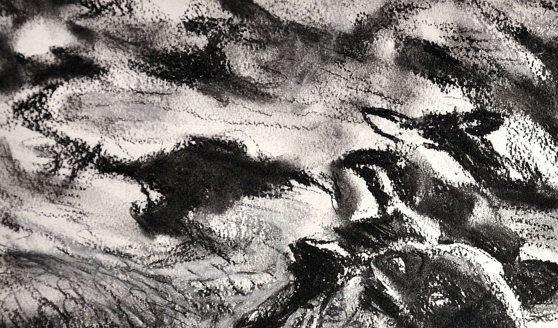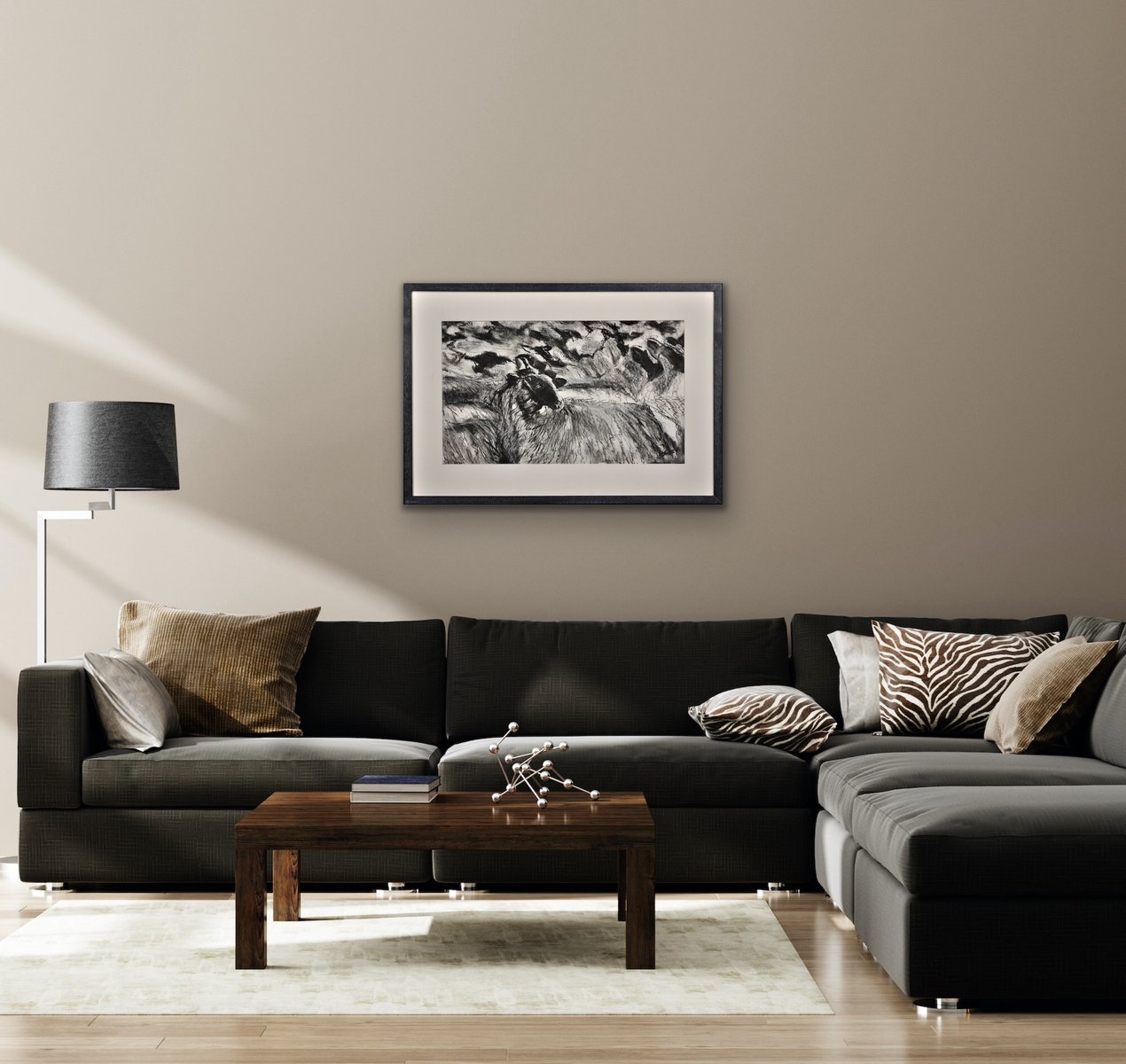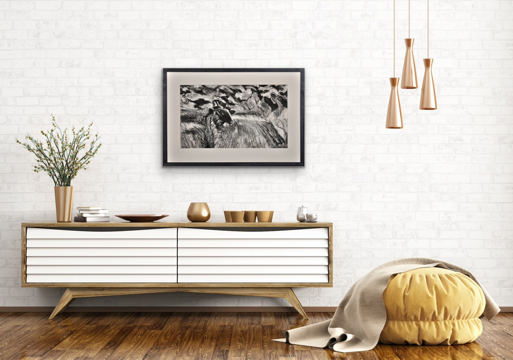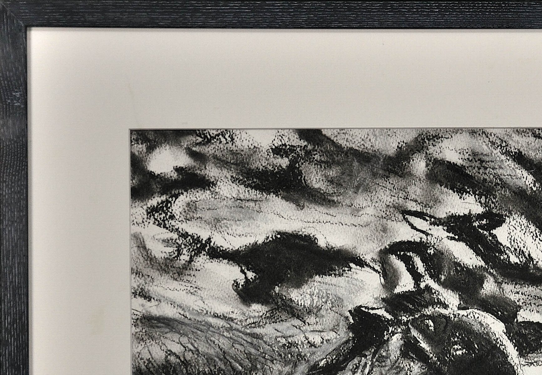 This original charcoal and pastel on paper artwork depicts a flock of sheep. They are portrayed not as individual animals but as a communal entity, almost moving and breathing as one. There is a wonderful texture about the piece, and the bodies of the sheep almost merge into the hills beyond. The application of pastel is highly effective and skilled.