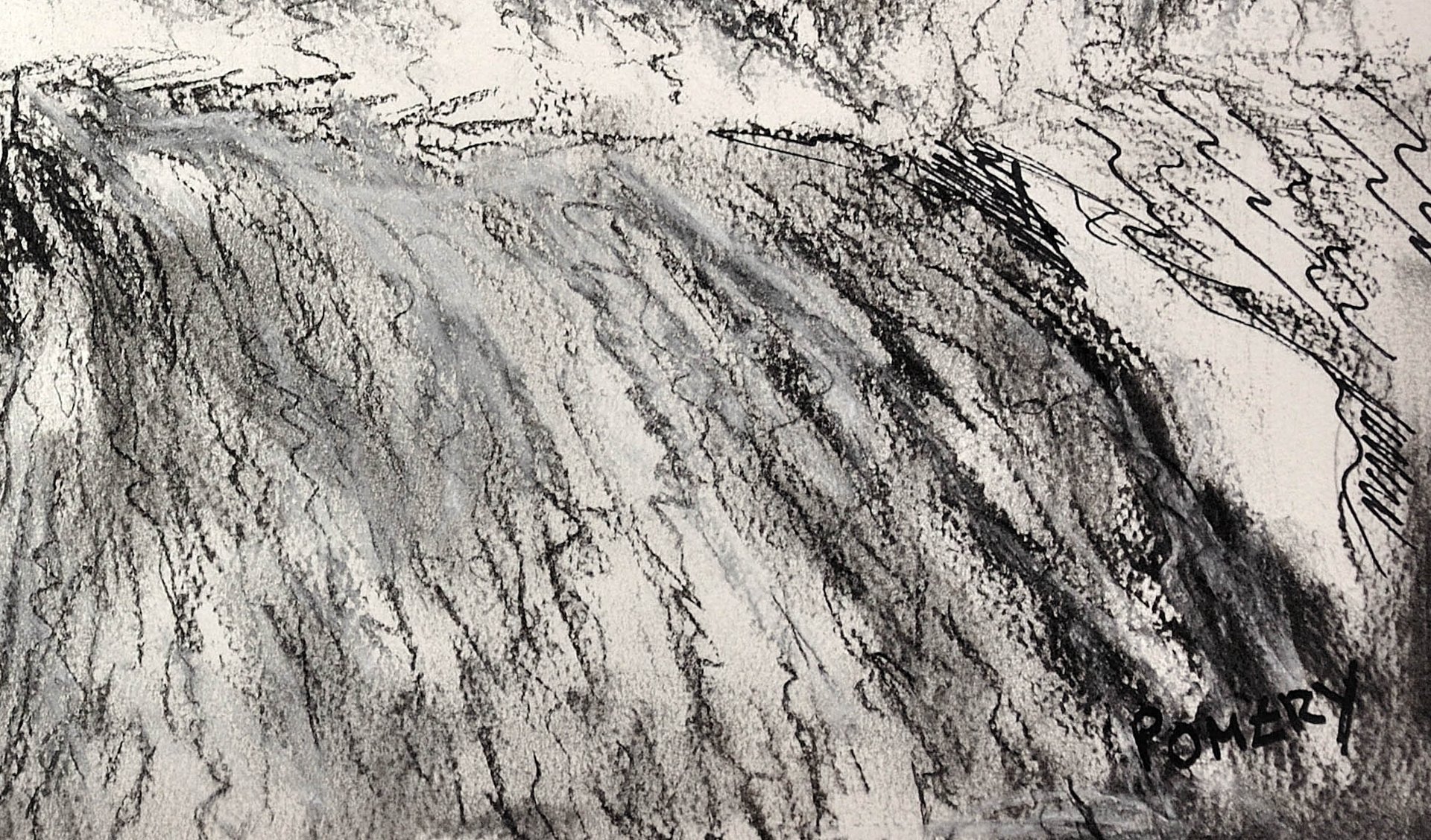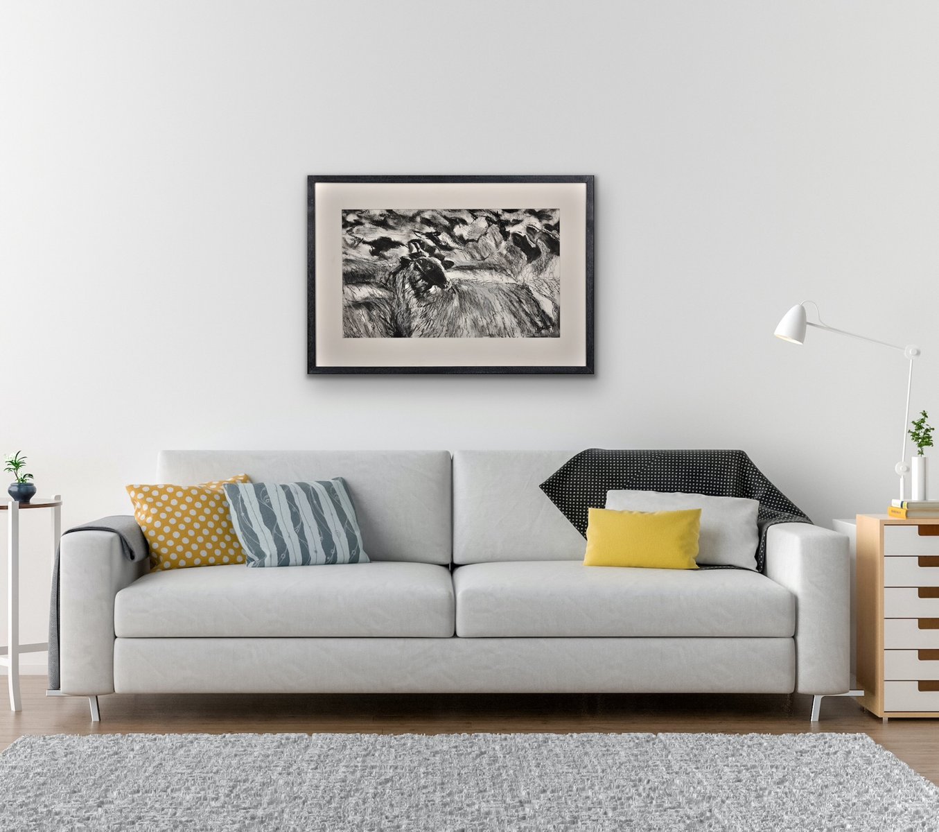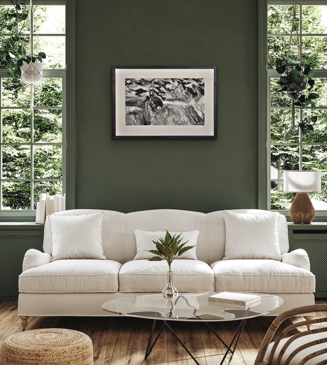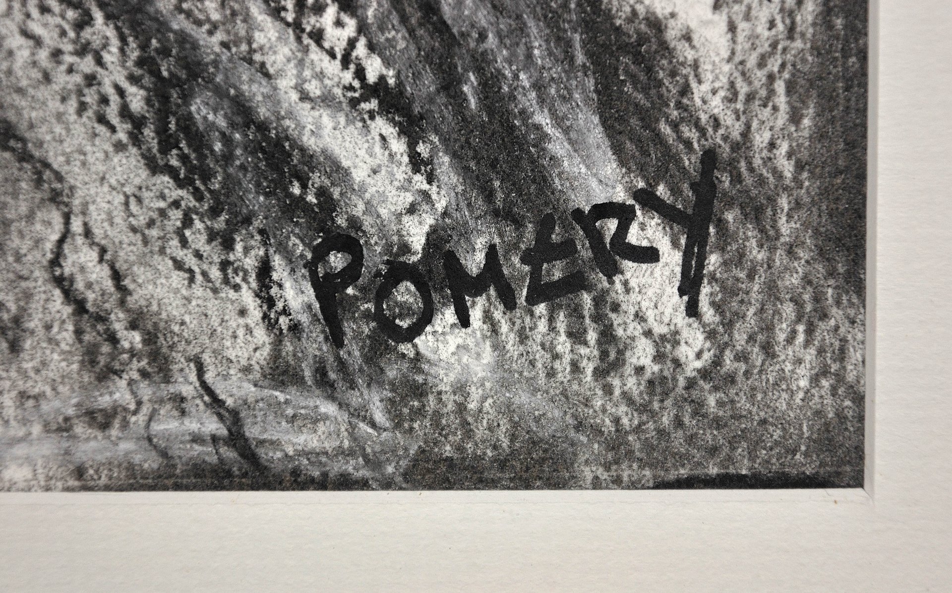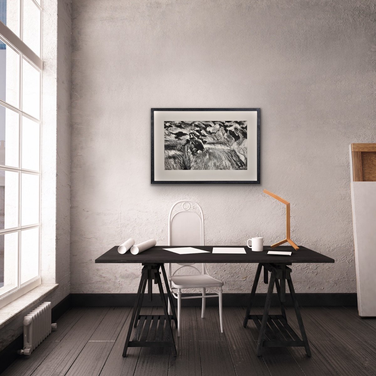 This original charcoal and pastel on paper artwork depicts a flock of sheep. They are portrayed not as individual animals but as a communal entity, almost moving and breathing as one. There is a wonderful texture about the piece, and the bodies of the sheep almost merge into the hills beyond. The application of pastel is highly effective and skilled.