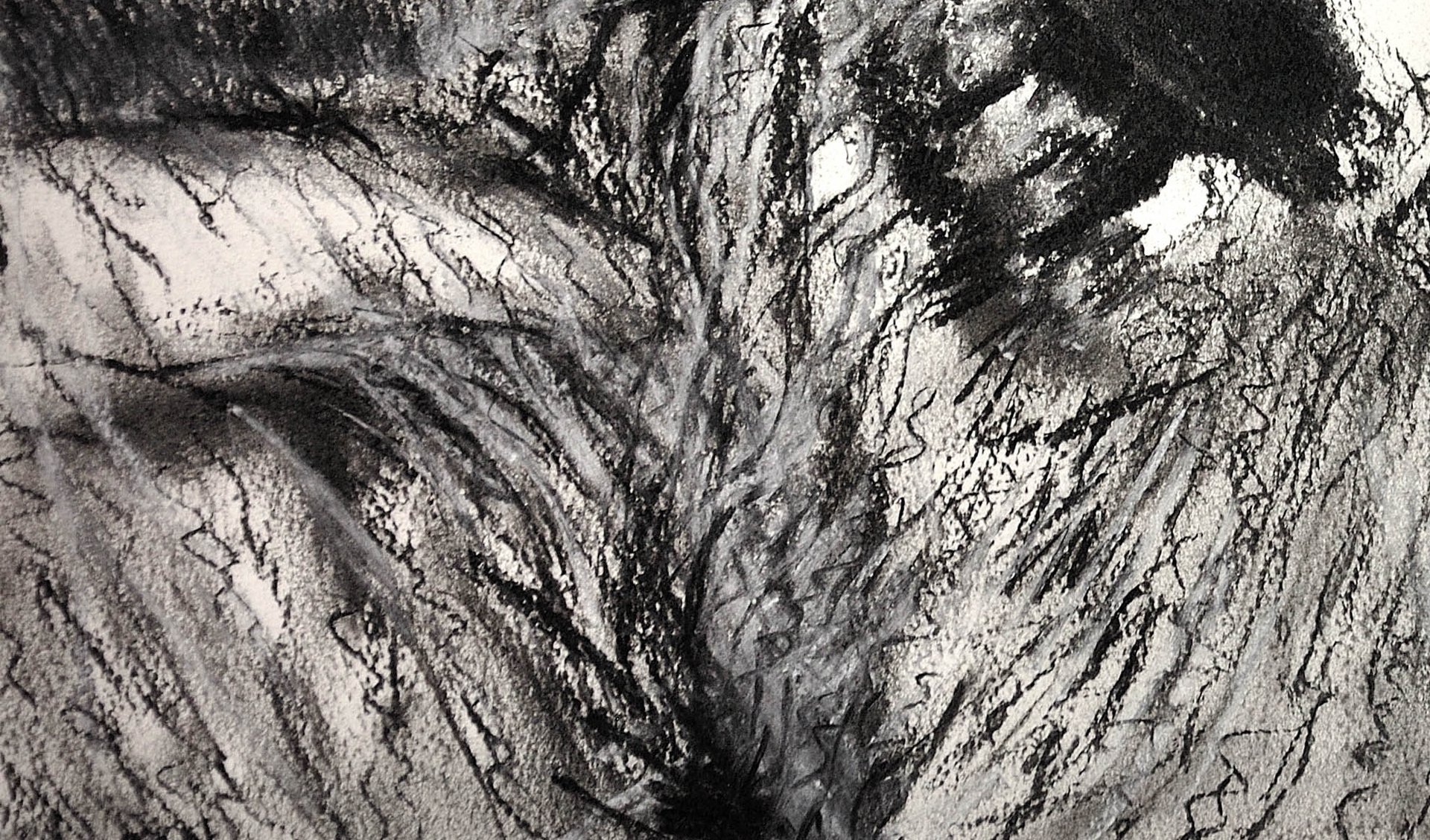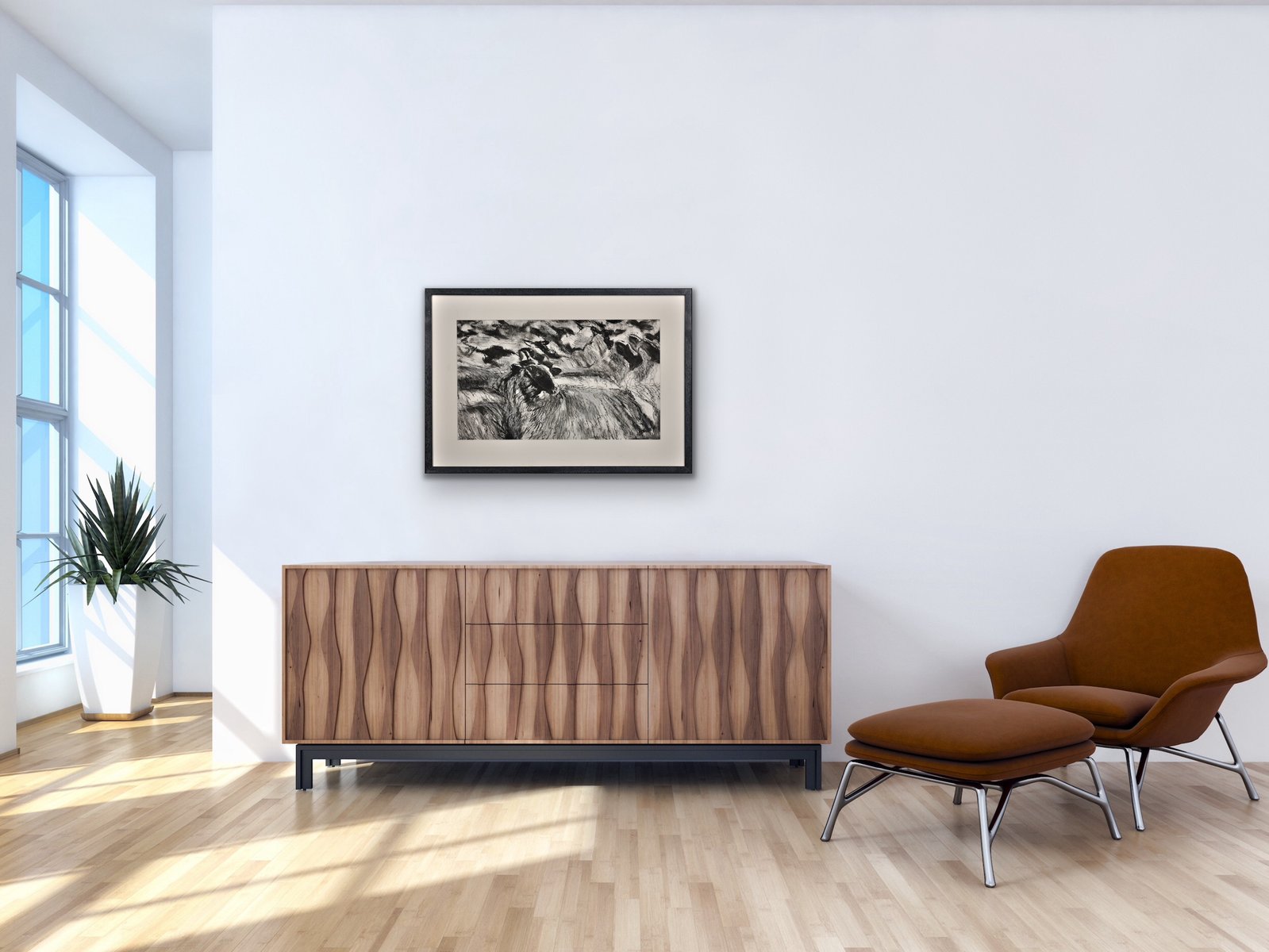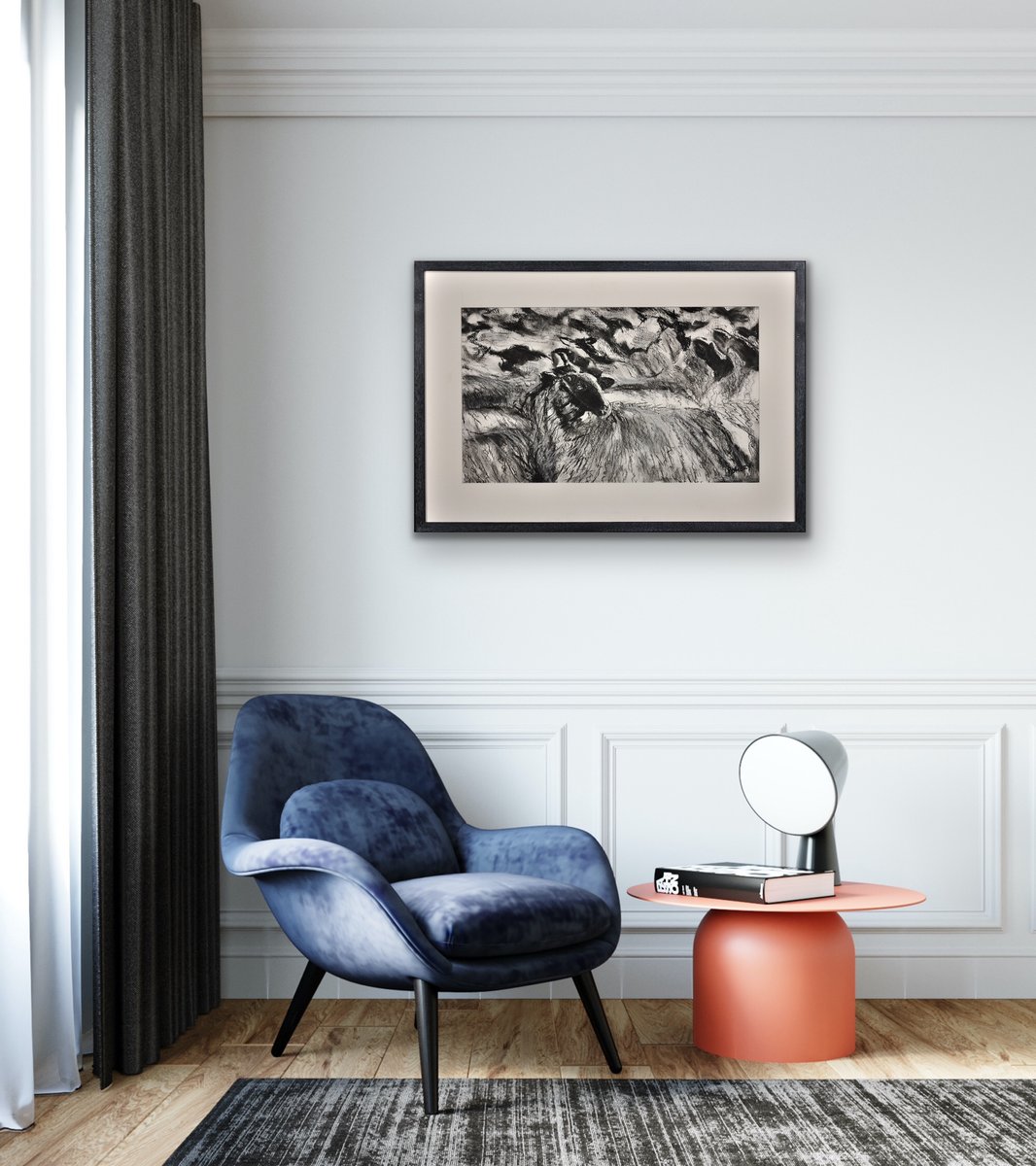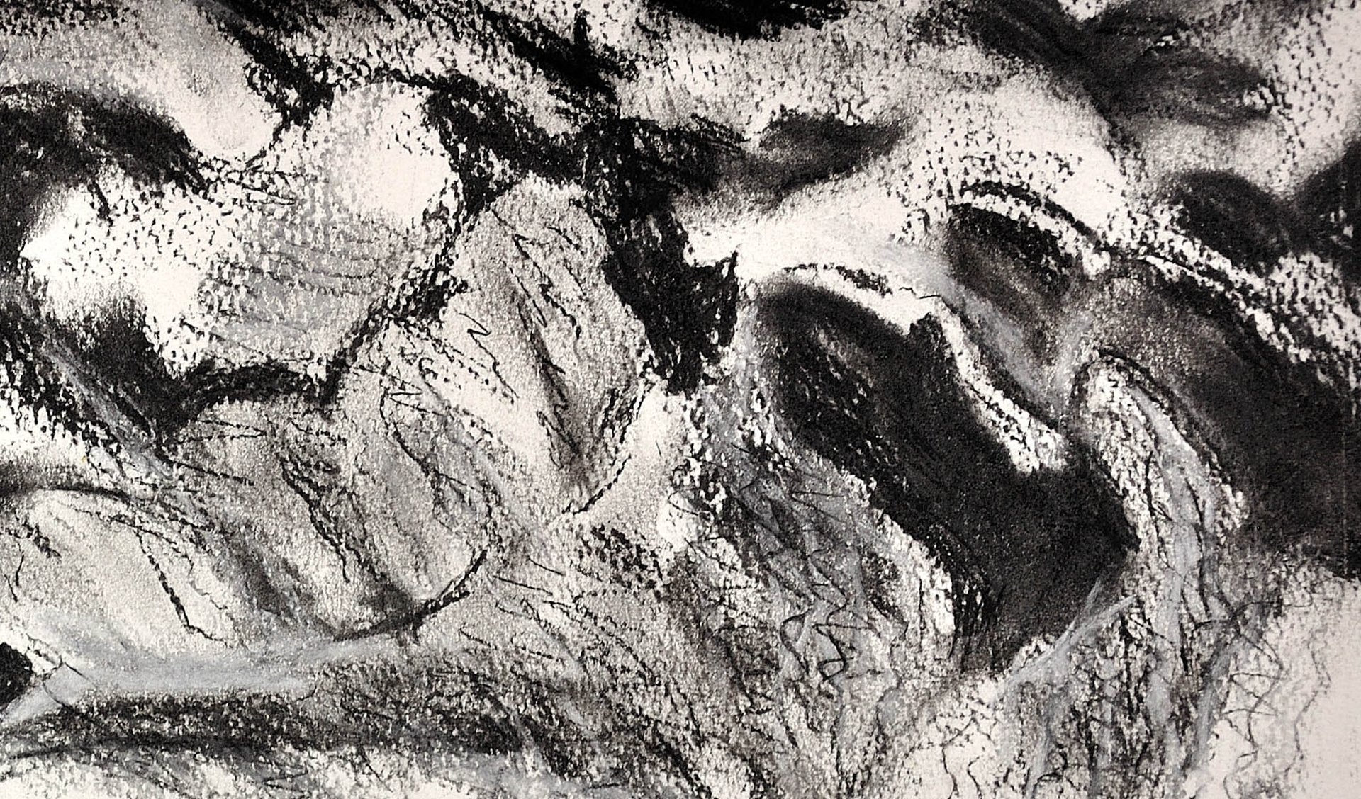 This original charcoal and pastel on paper artwork depicts a flock of sheep. They are portrayed not as individual animals but as a communal entity, almost moving and breathing as one. There is a wonderful texture about the piece, and the bodies of the sheep almost merge into the hills beyond. The application of pastel is highly effective and skilled.