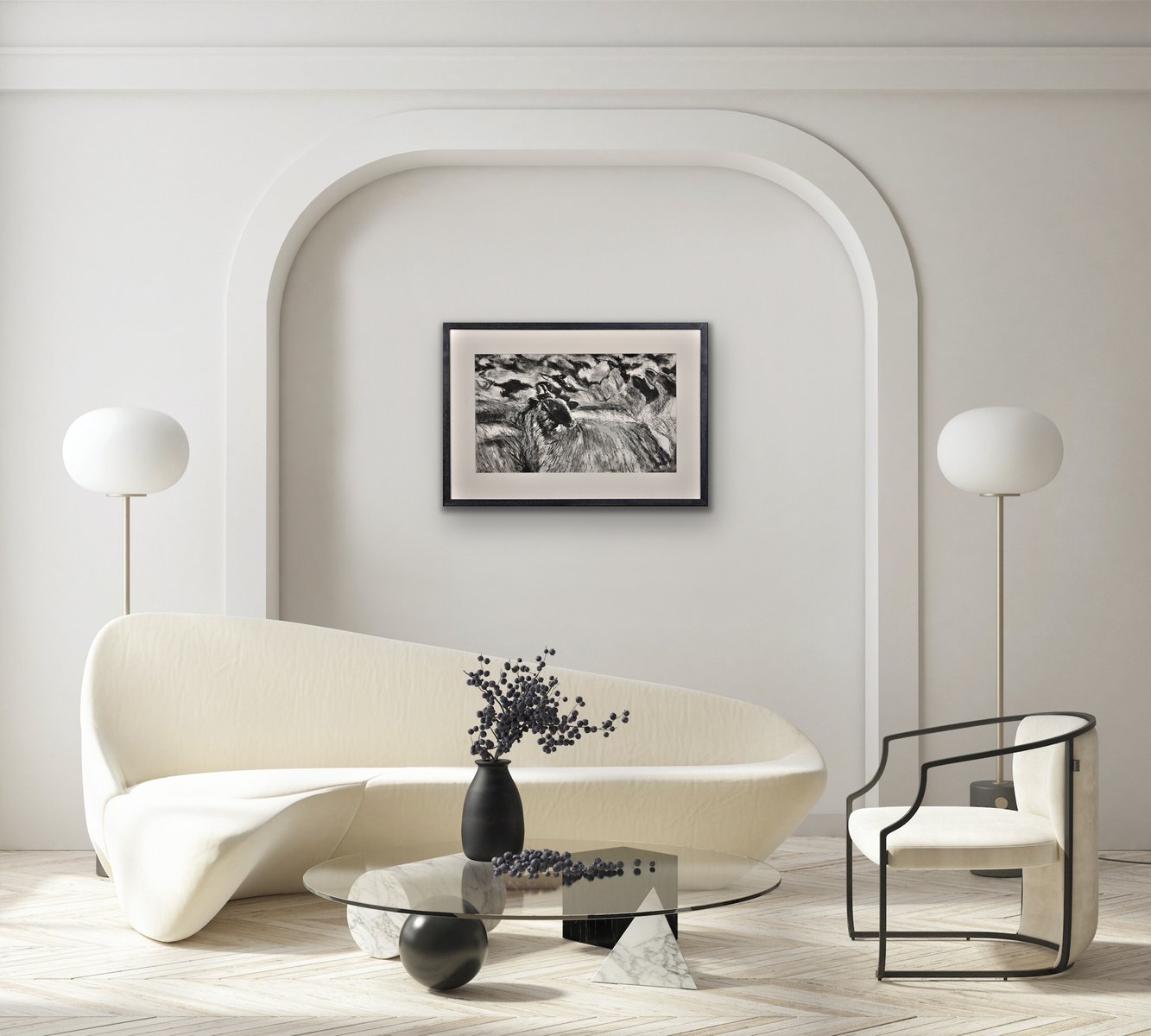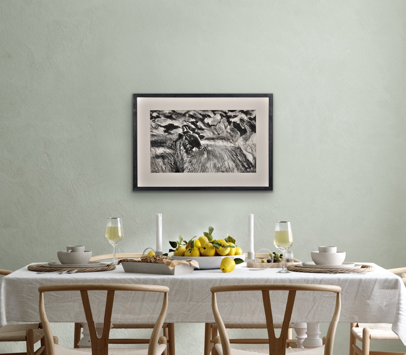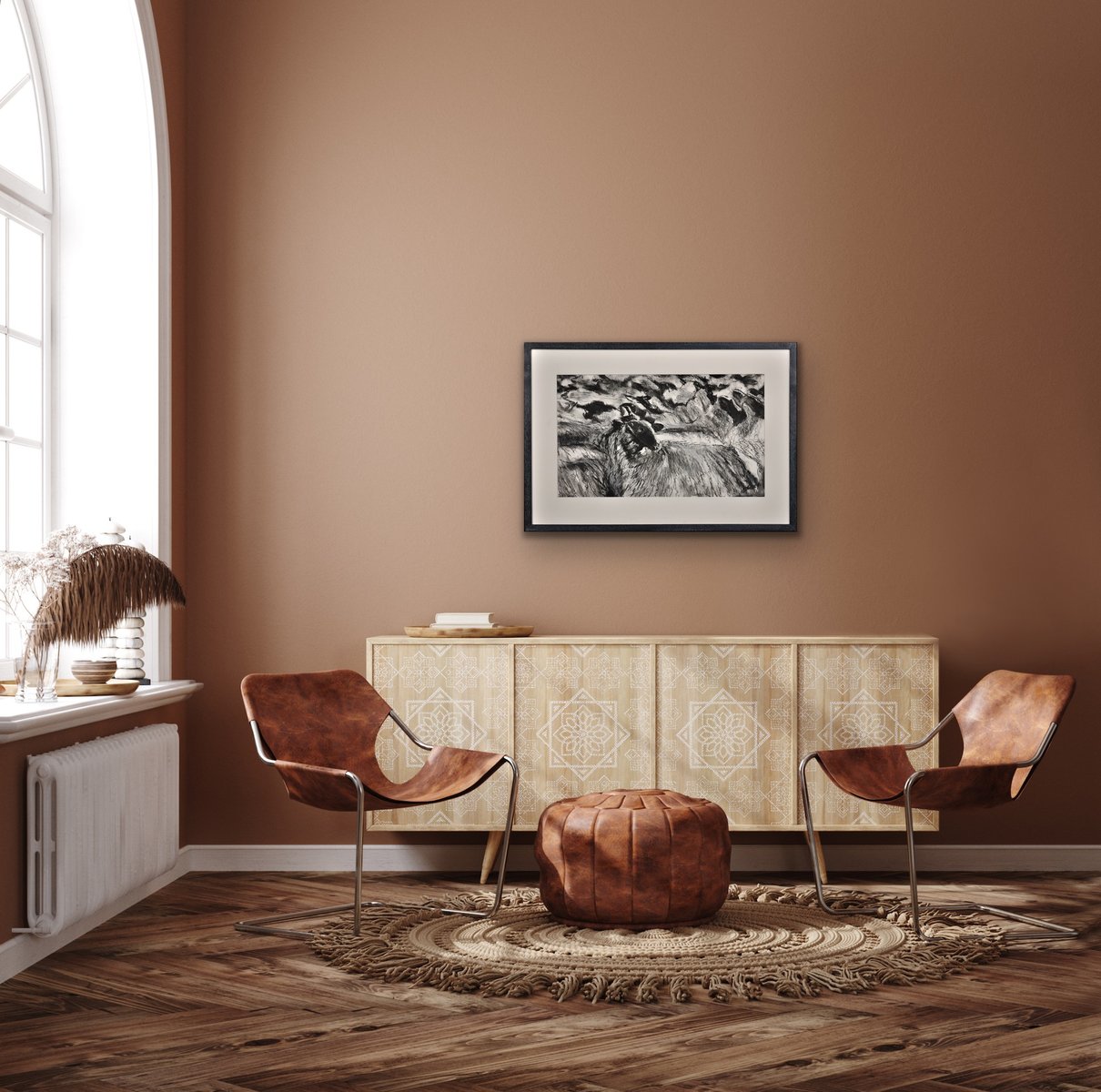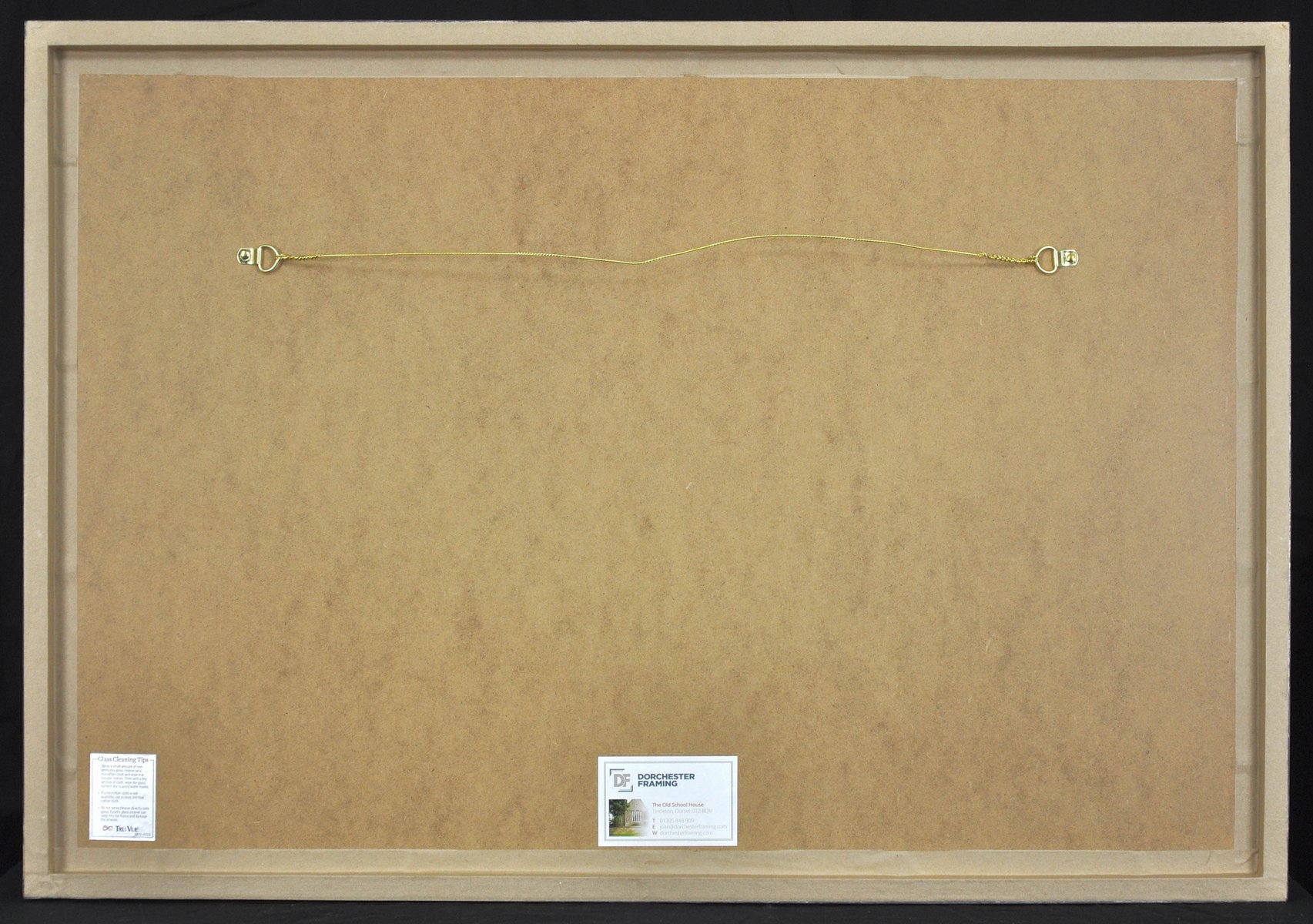 The artwork is presented and supplied in a sympathetic and contrasting contemporary frame to suit the subject colouration (which is shown in these photographs) and is behind non-reflective Tru Vue UltraVue® UV70 glass.