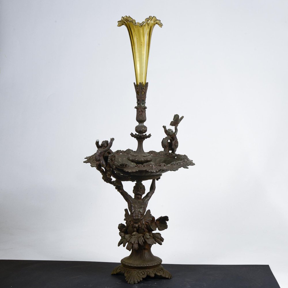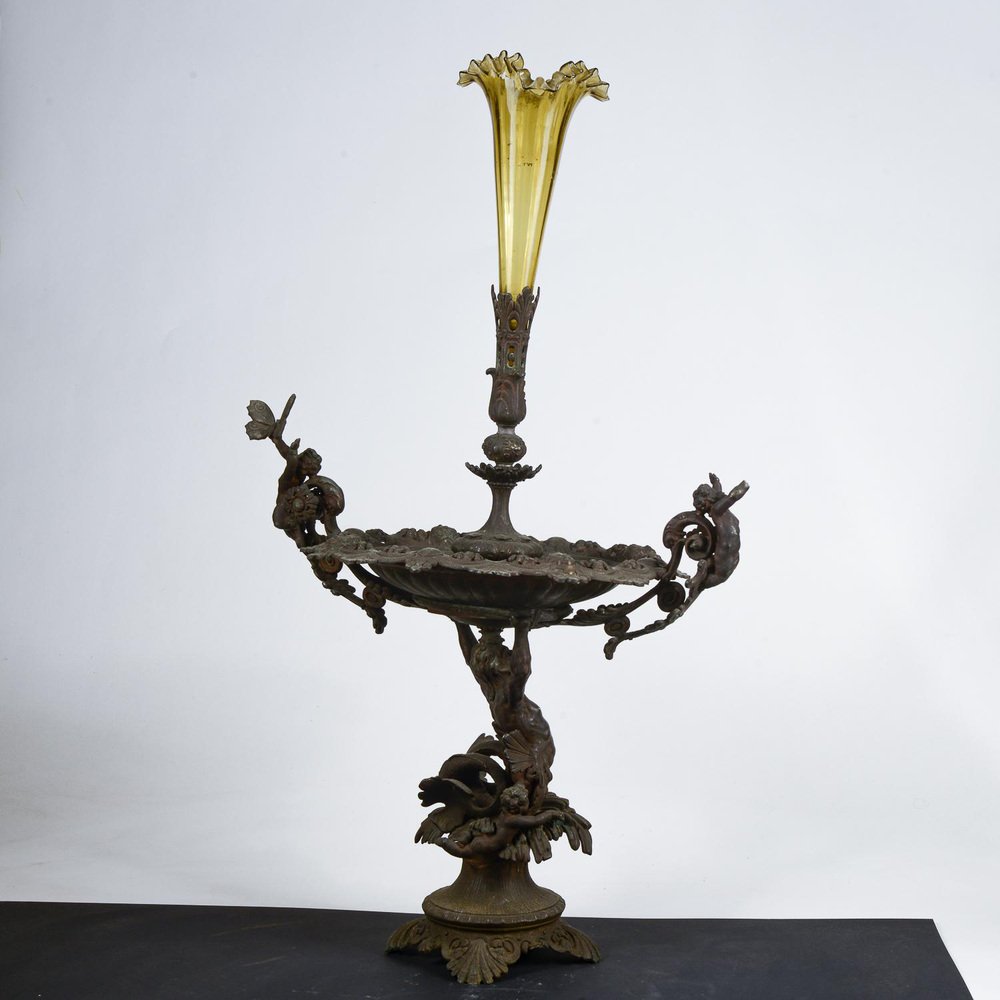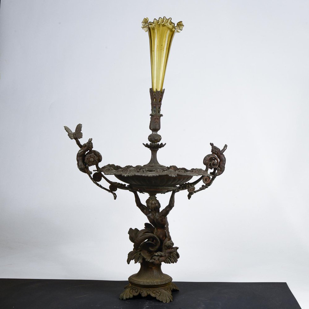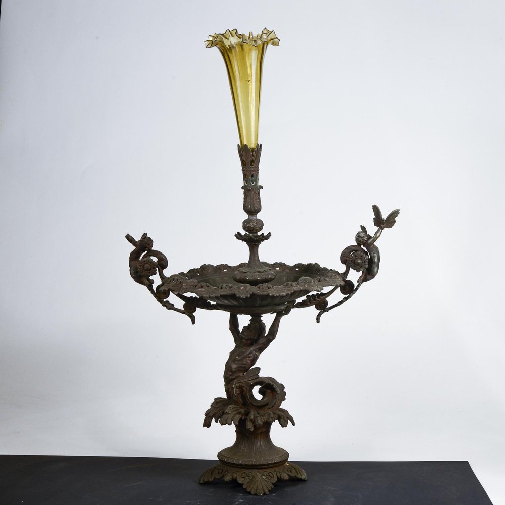 Tafelaufsatz aus Metall mit mundgeblasenem Glasgefäß
