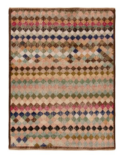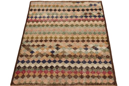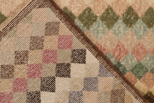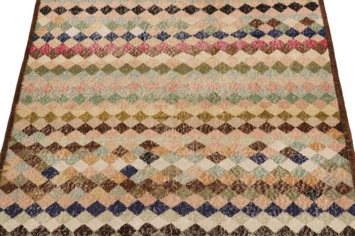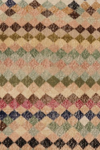 Hailing from 1960s rug among the works of a bold designer from Turkey. Hand-knotted in wool, this 4x5 piece revels in a scintillating diamond pattern that lends an exceptional pagination in mid century style. Bearing a low pile, textural take on distressed chic, the piece enjoys a mature character with peach, beige, brown, gold playing harmoniously with black light blue, green, red & gold for a unique colorplay in such playful imagination. Prevailing in otherwise good condition, a quiet piece idyllic for comforting projects given its cultivated personality & depth.