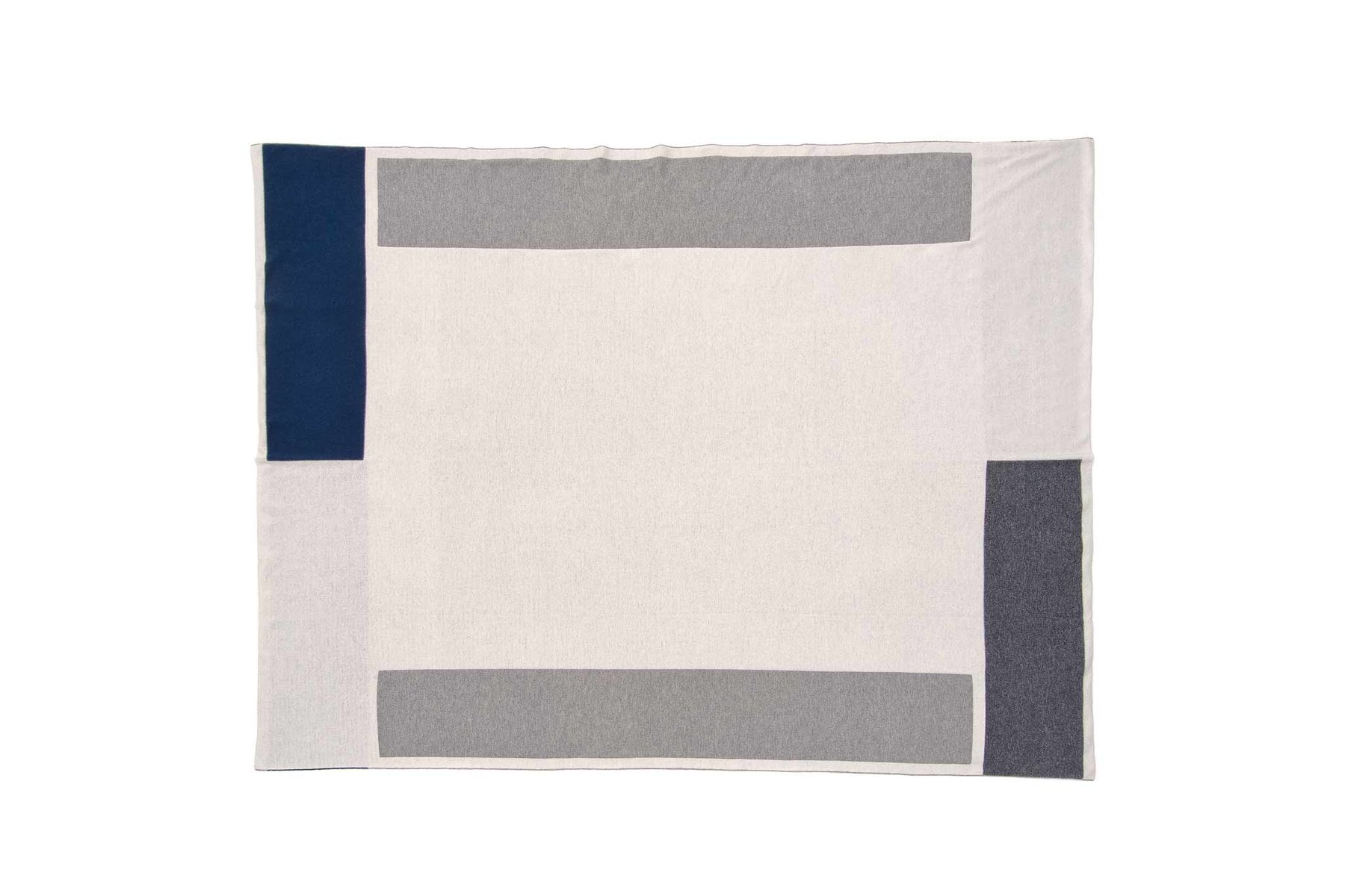 'Segments of frame' knitted blanket is finely crated in Italy using merino carded wool extra fine the highest quality. It is made through the jacquard technique: double face 4 colours: white front with frames in blue, dark grey and grey; grey melange with frames in blue, dark grey and white.