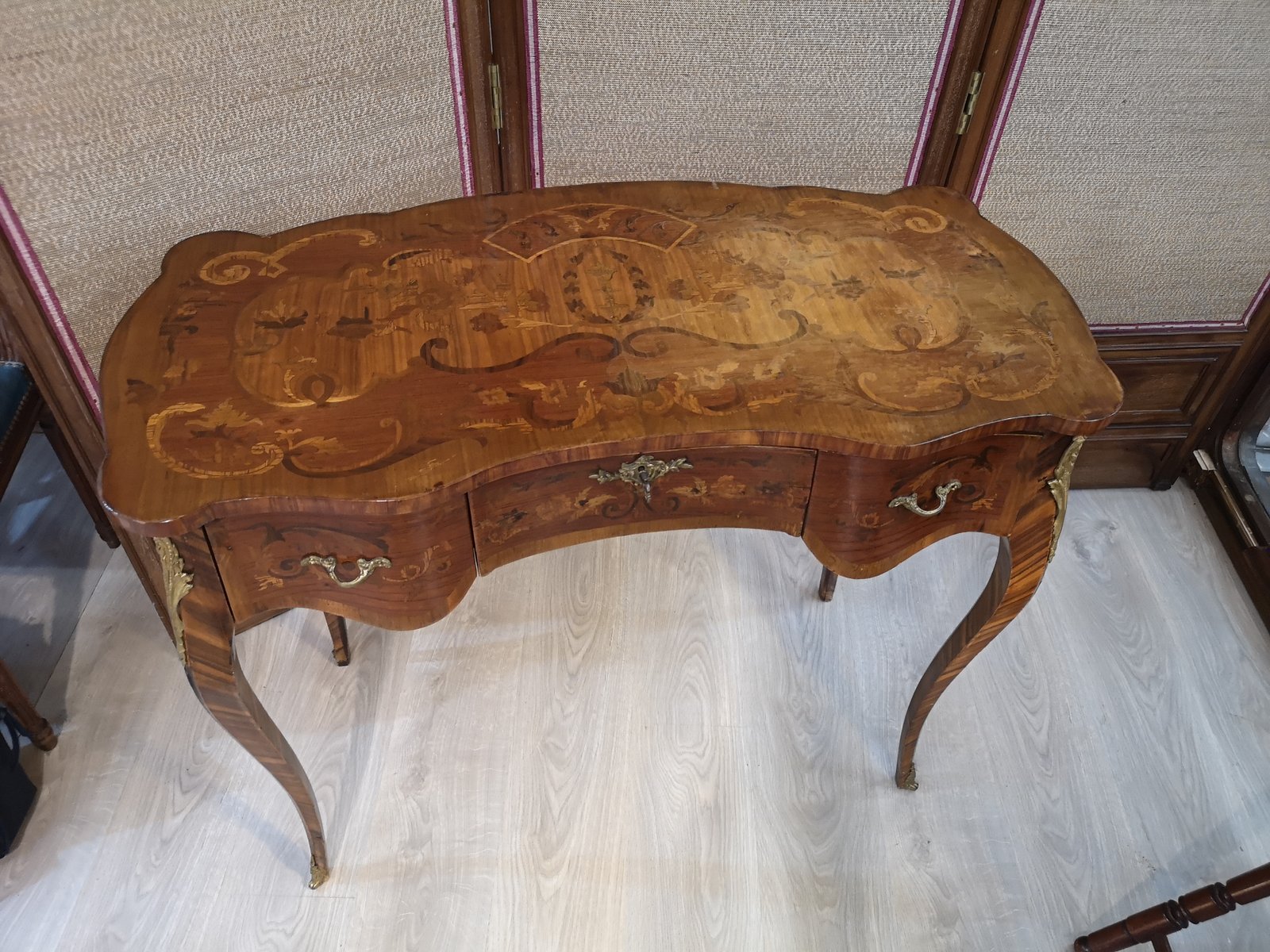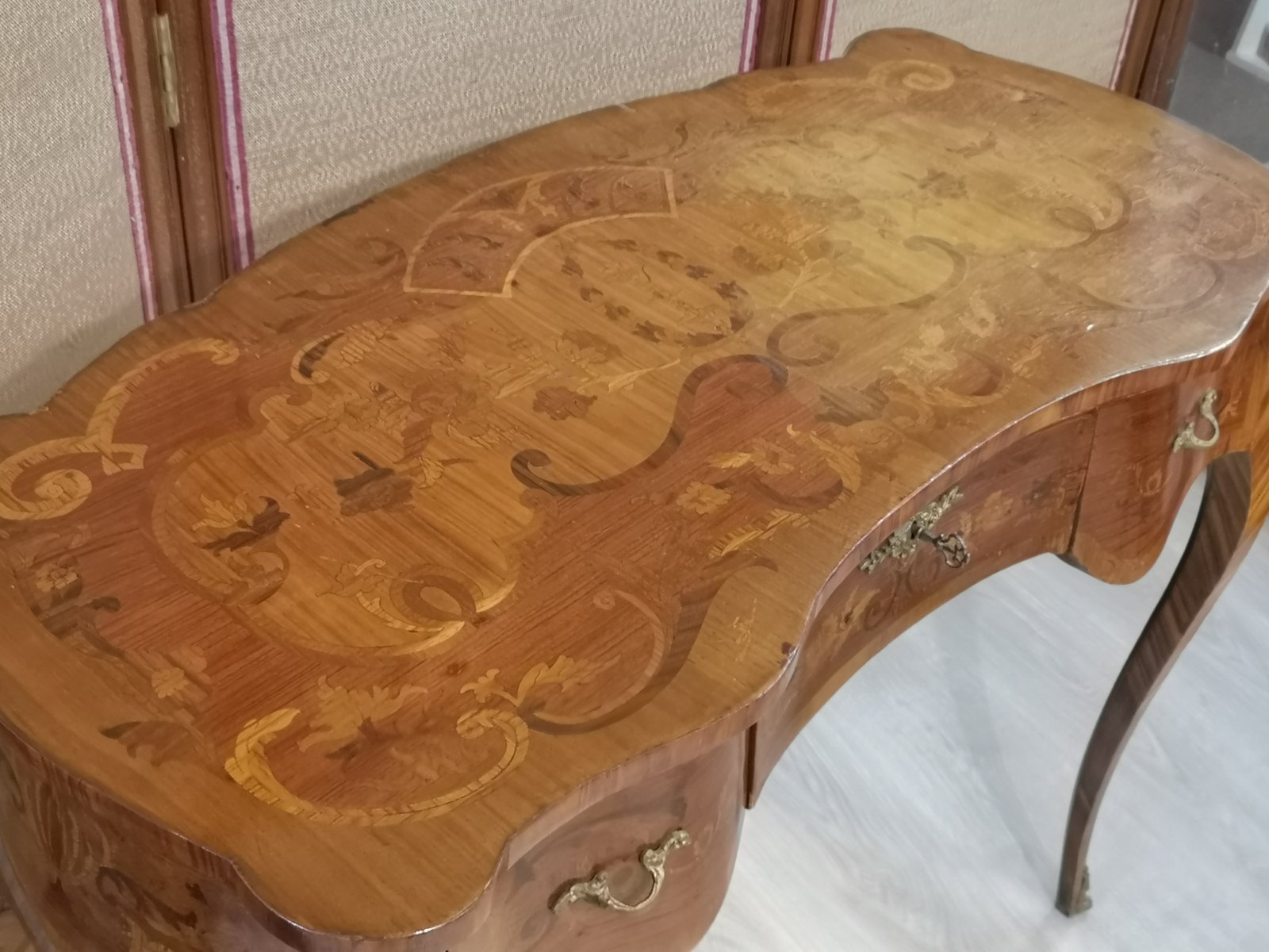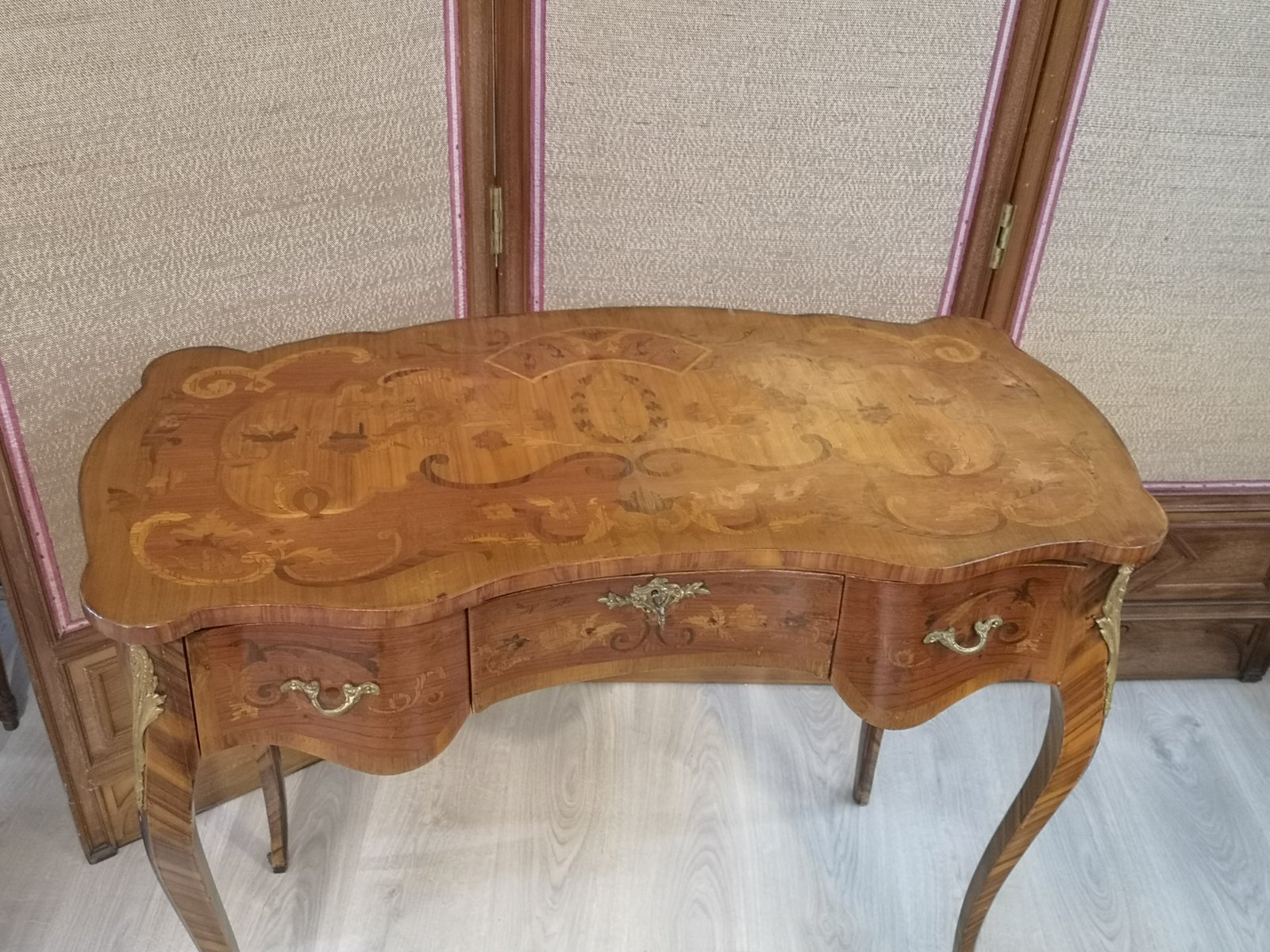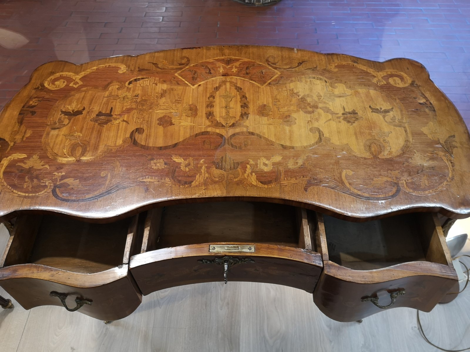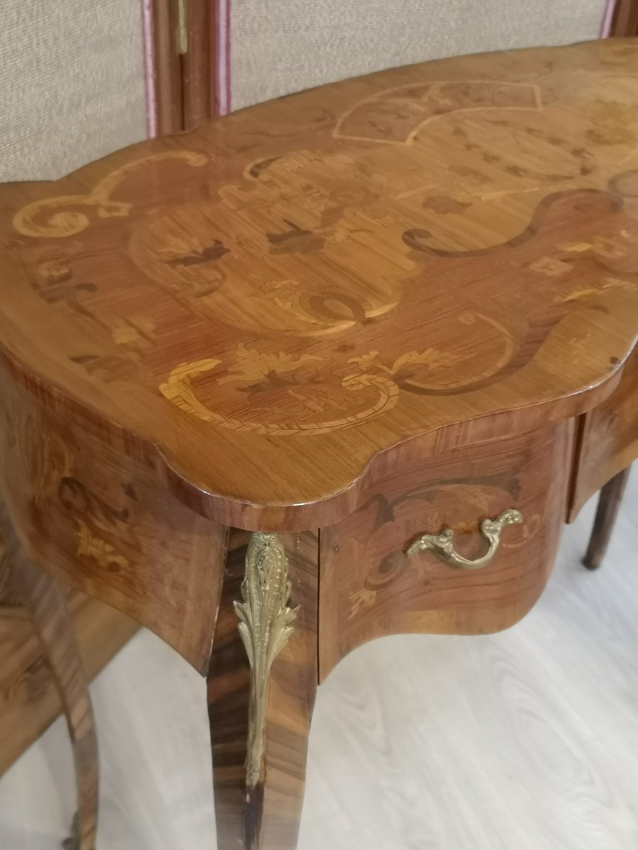 Tisch mit floralen Intarsien aus Holz und Bronze mit Schubladen